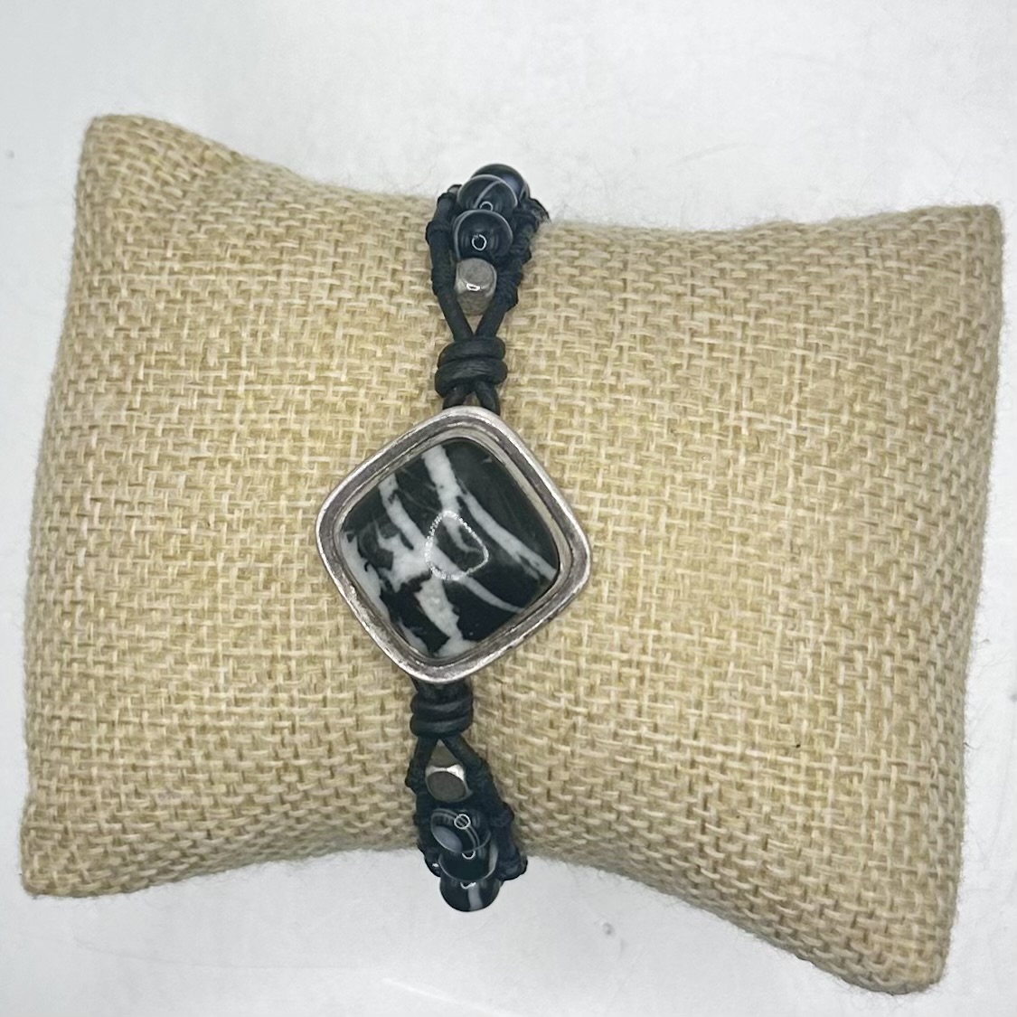 This Bracelet is handcrafted using a single up-cycled Zebra Jasper focal bead along with Black Onyx 6mm beads and black 1.5mm genuine leather and a black leather button. I made this bracelet with intention to support grounding, balance and inner healing.