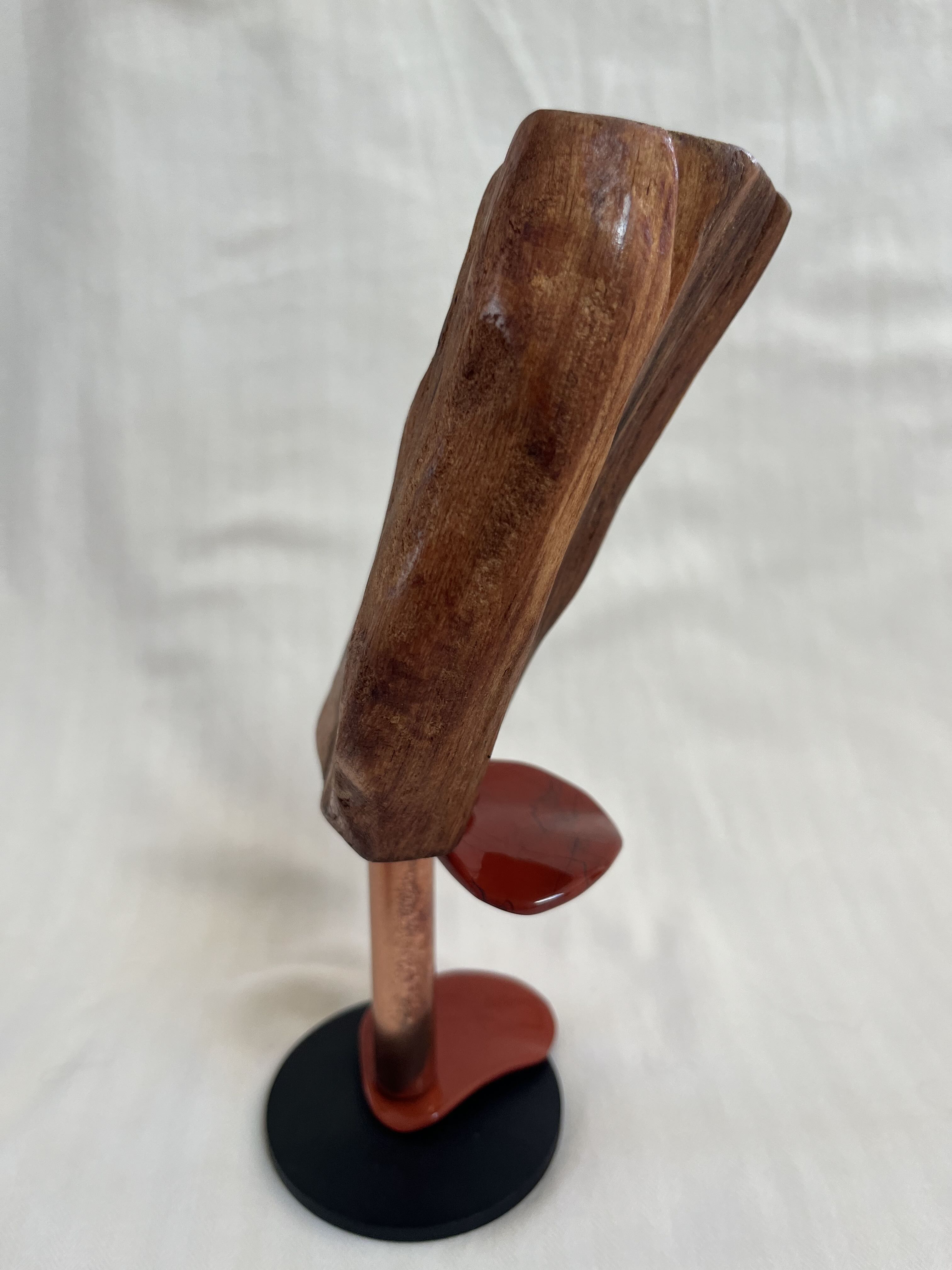 Detailed Description & Inspiration: This very small one-of-a-kind, 150-year-old, Douglas Fir, tree root piece is balanced on a stand with copper and Red Jasper. Copper is a powerful energy conductor that helps bridge the physical and spiritual realms and the Red Jasper stones strengthen the connection to Mother Earth's energy. Red Jasper also centers on grounding, protection against negative energies, and stability through resilience.