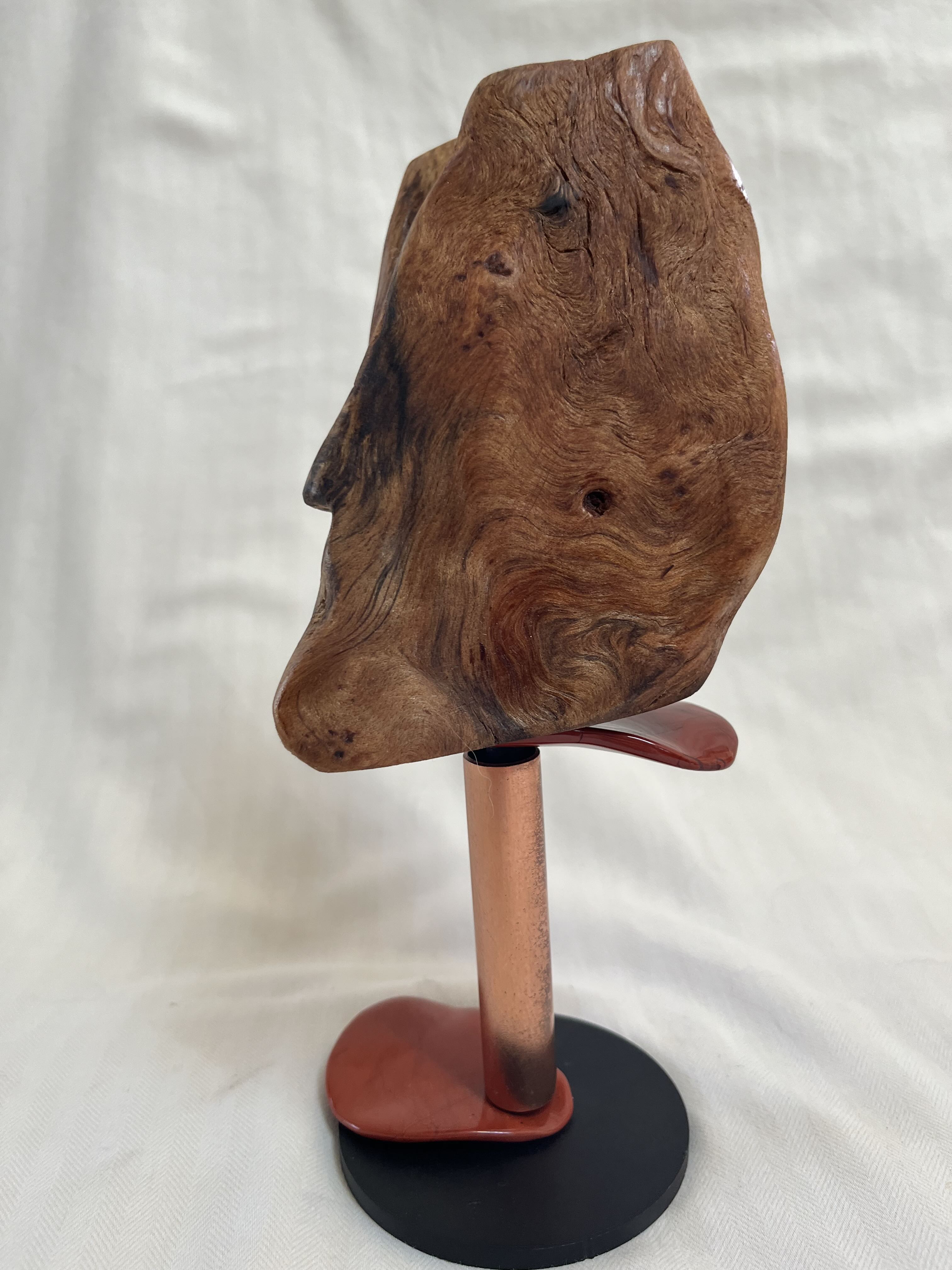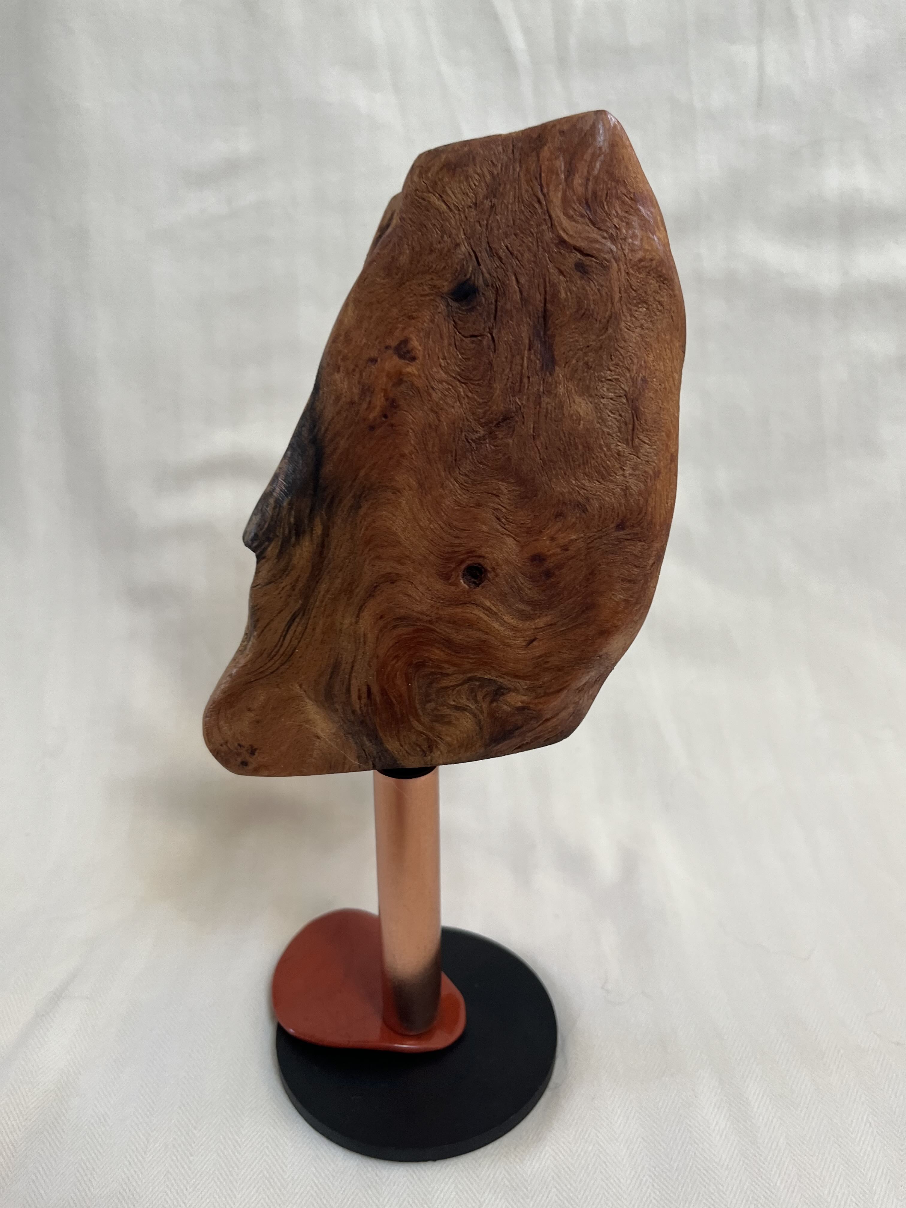 Hand sanded and shaped to bring out the wood’s unique textures, colors and sap formation then rubbed with at least three coats of Danish oil. Mounted on an iron stand that has been lacquered black.
