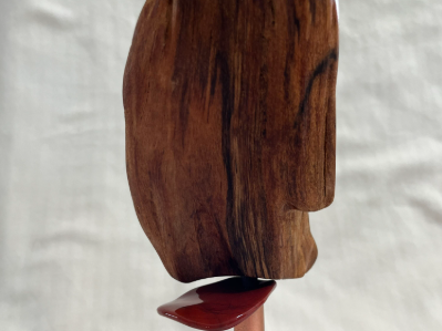 Methods: Hand sanded and shaped to bring out the wood’s unique textures, colors and sap formation then rubbed with at least three coats of Danish oil. Mounted on an iron stand that has been lacquered black.