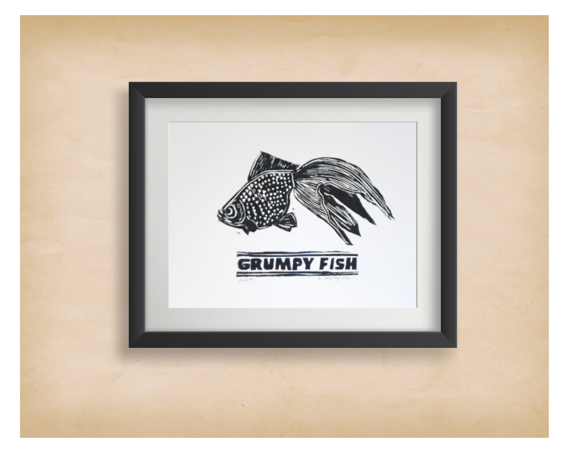 This Grumpy Fish linocut print was drawn onto a linoleum block by me and carefully carved using special carving tools, then after all the carving comes the fun part to print! I use quality paper and archival oil-based printing ink for all my linocut prints. I also have a hand press that I print with that gives me nice control over the pressure for each print. This print is truly unique!