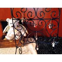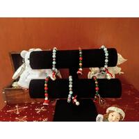 Many people believe we each have our own guardian angel. Several years ago we found these angel pocket charms and said, "Well that's not right! A guardian angel should be out where it can keep an eye on you, not shoved in a dark pocket!" So we decided to turn them each into a unique necklace. The purple angel hangs from one made of purple and white lampwork glass beads. The green angel's chain has iridescent glass beads in the links. The sunflower angel (who may actually be a fairy) has a chain decorated with white mother-of-pearl chips. Last but not least, the orange angel's chain has a full spectrum of small glass beads in the links.
