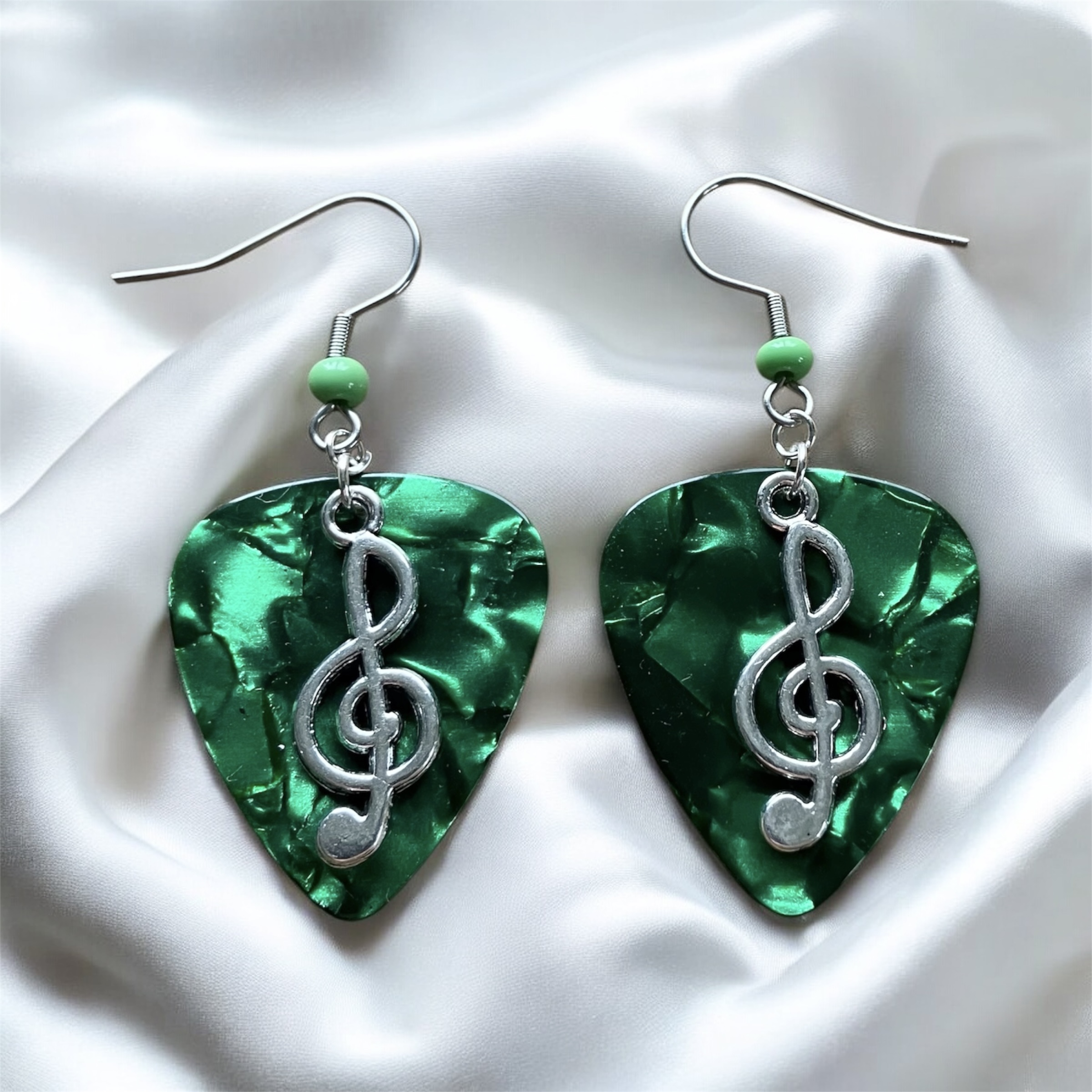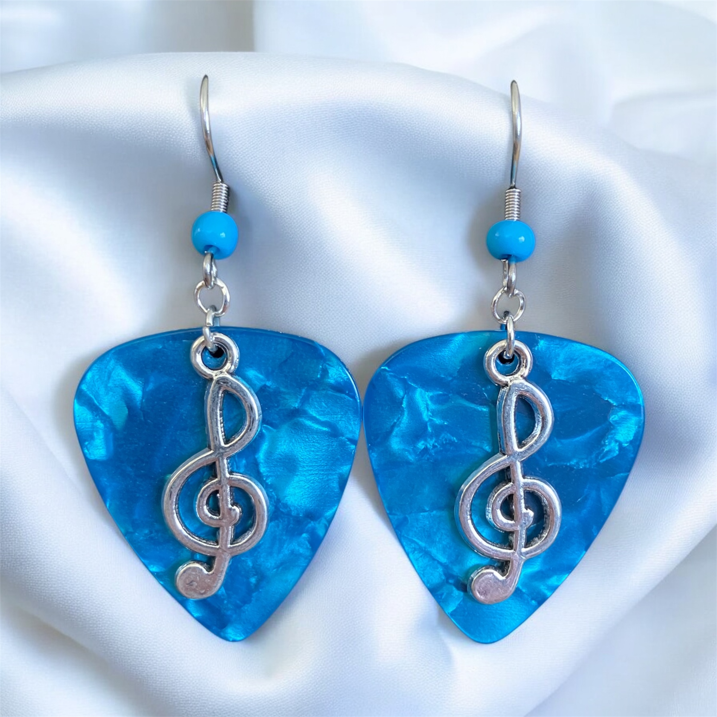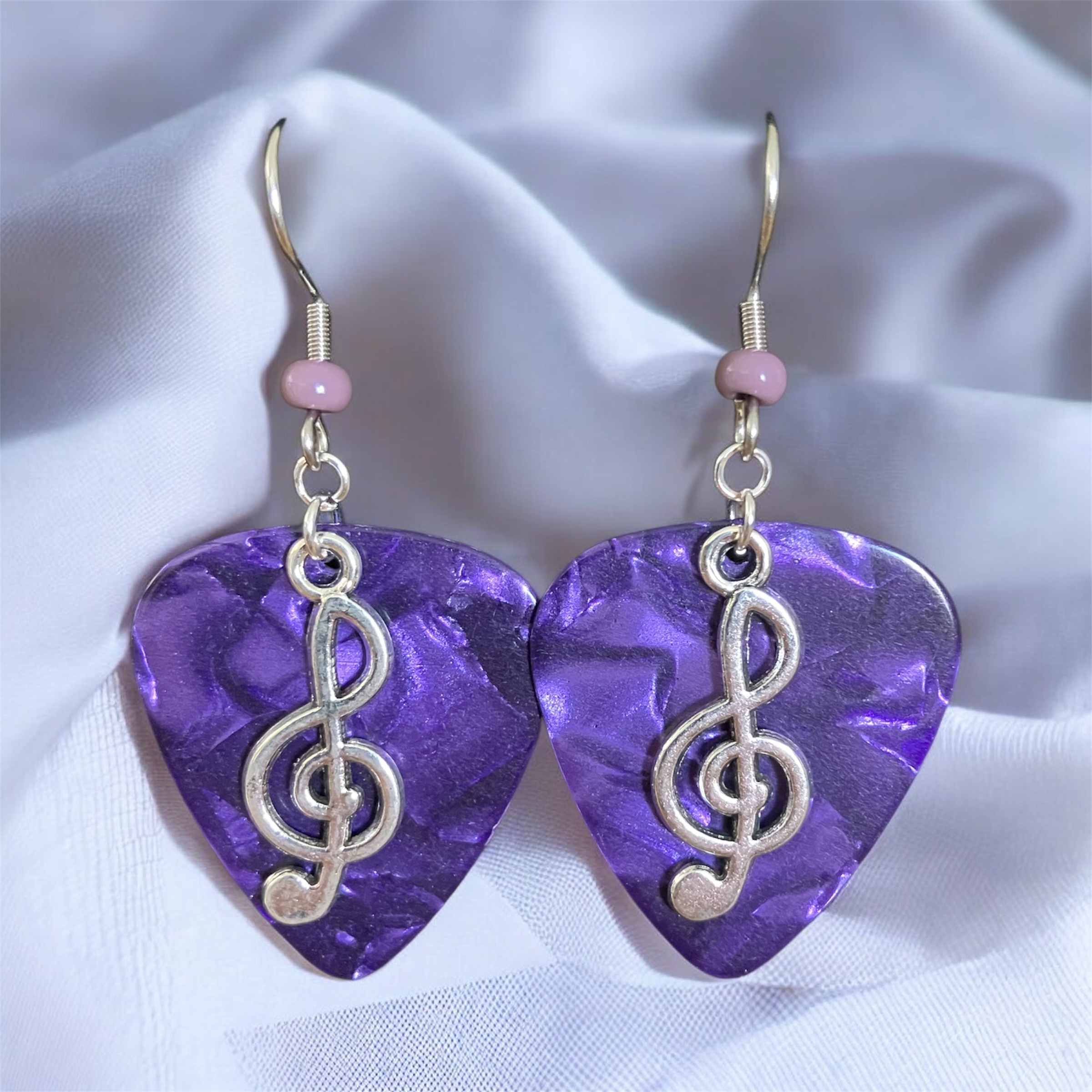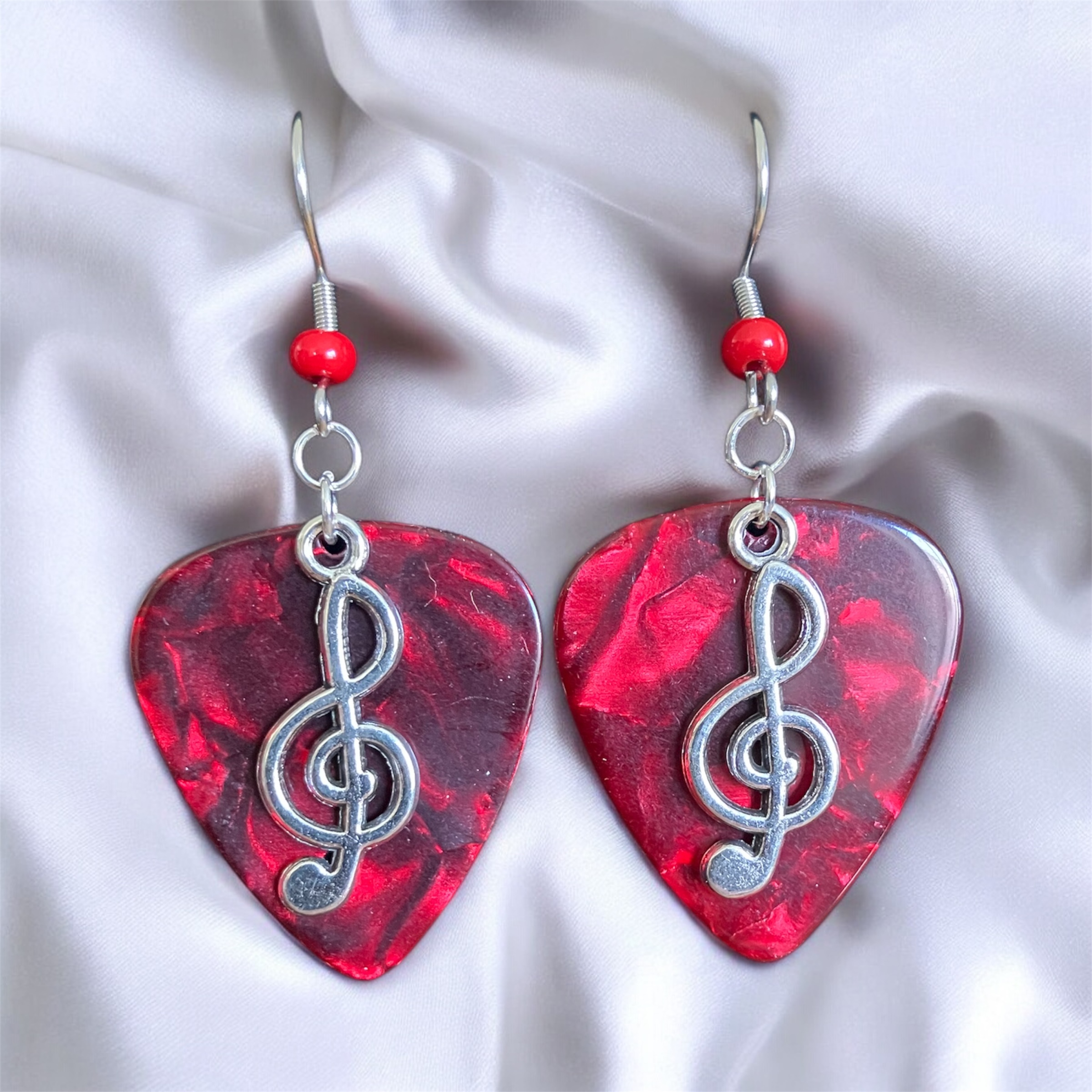Each guitar pick is hand stamped. Silver Plated Cleft Note Charms are added along with Stainless Steel Ear Wires with color coordinated Glass Beads.