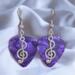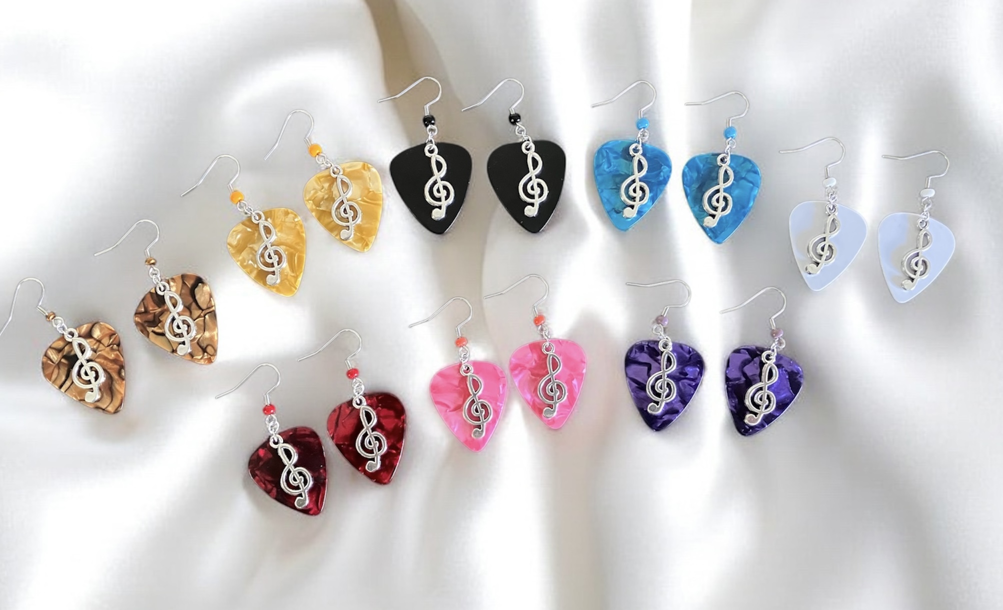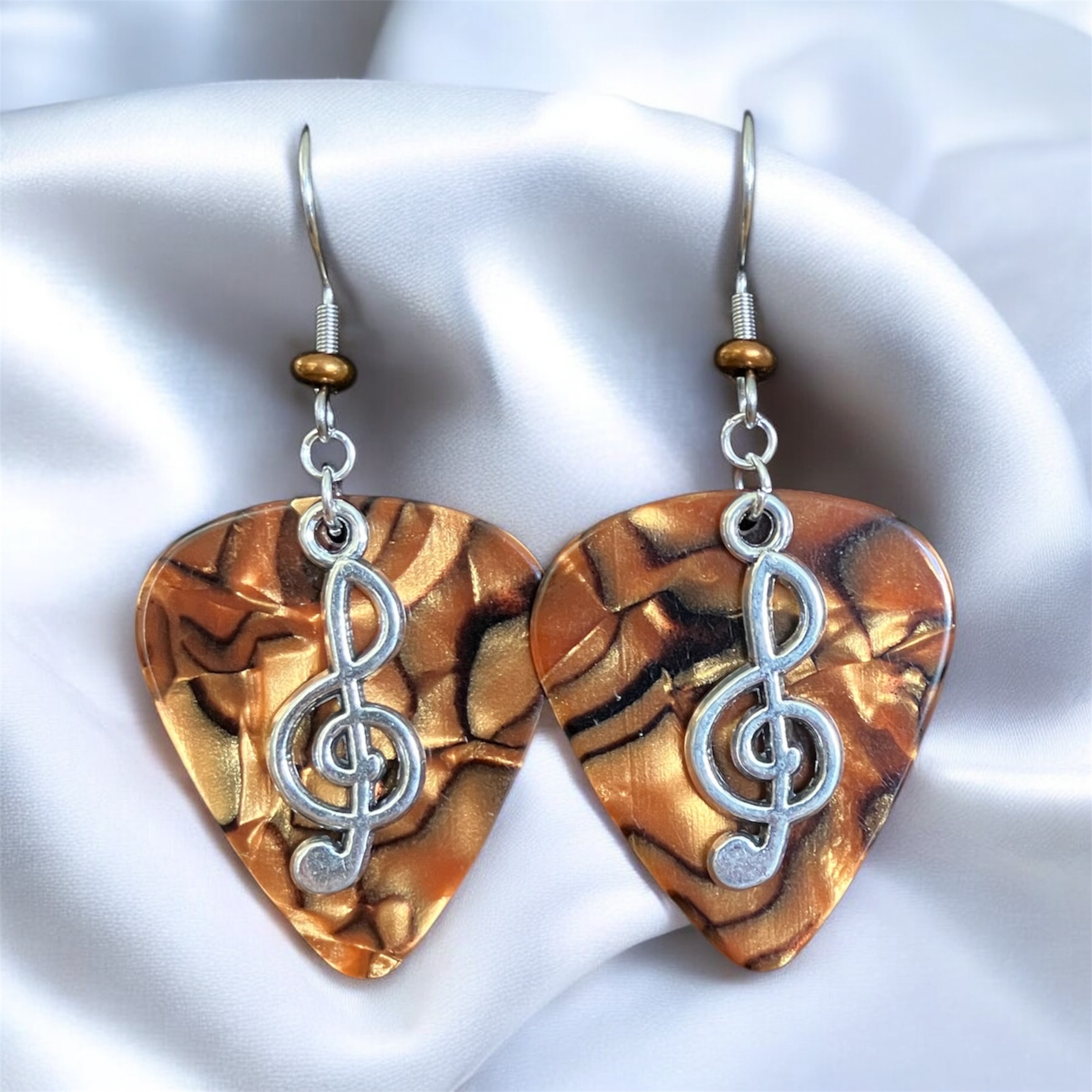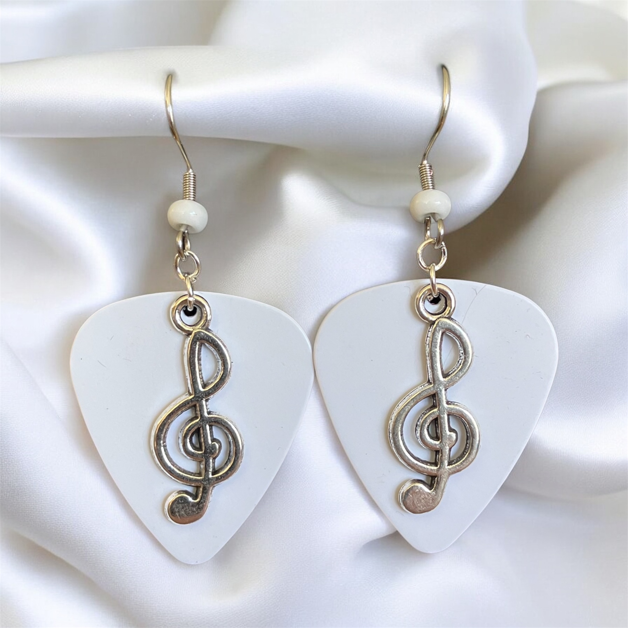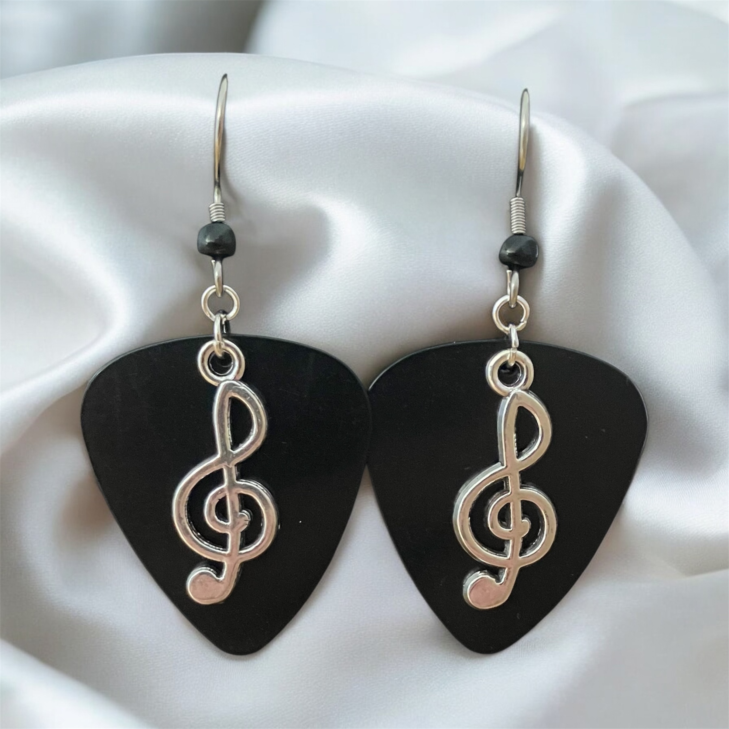 Each guitar pick is hand stamped. Silver Plated Cleft Note Charms are added along with Stainless Steel Ear Wires with color coordinated Glass Beads.