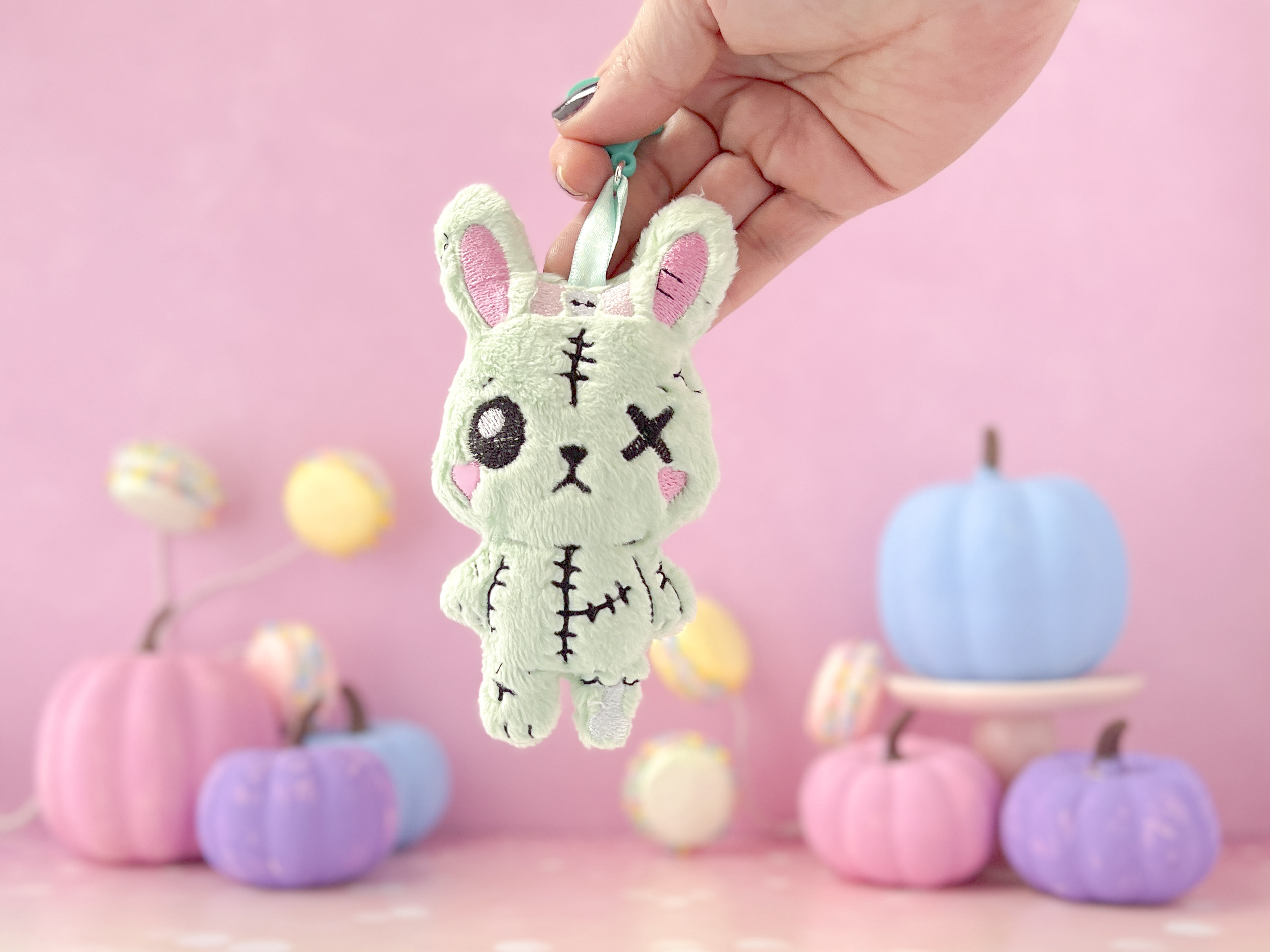 Meet your new creepy cute companion! This Dead Bunny Plush Bag Charm is made from ultra-soft mint minky and handcrafted with love in my USA studio. Designed in a full-body style, this chibi bunny features spooky embroidered details including a stitched kawaii face, zombie-style accents, and a tiny embroidered skull bow nestled between its ears for an extra touch of macabre sweetness.