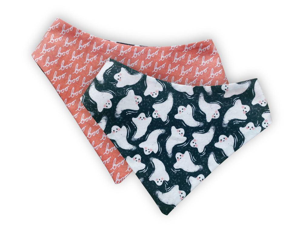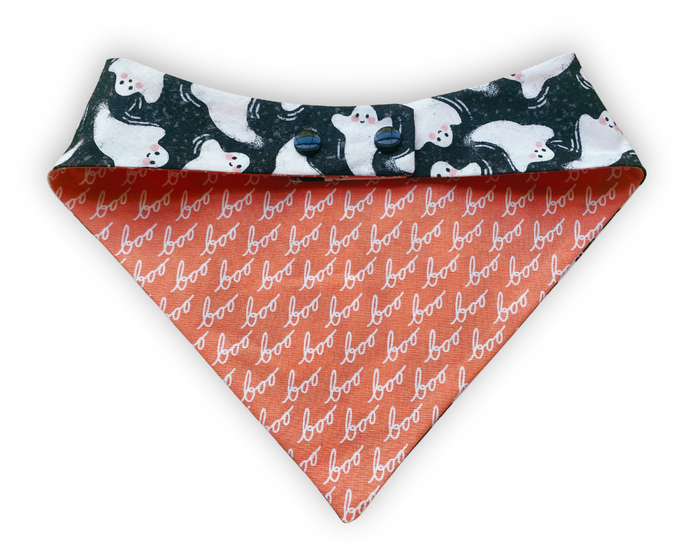 Halloween Bashful Ghost Dog Bandana in black & white with a playful BOO print on the reverse is a must-have for your pup's spooky wardrobe this season!