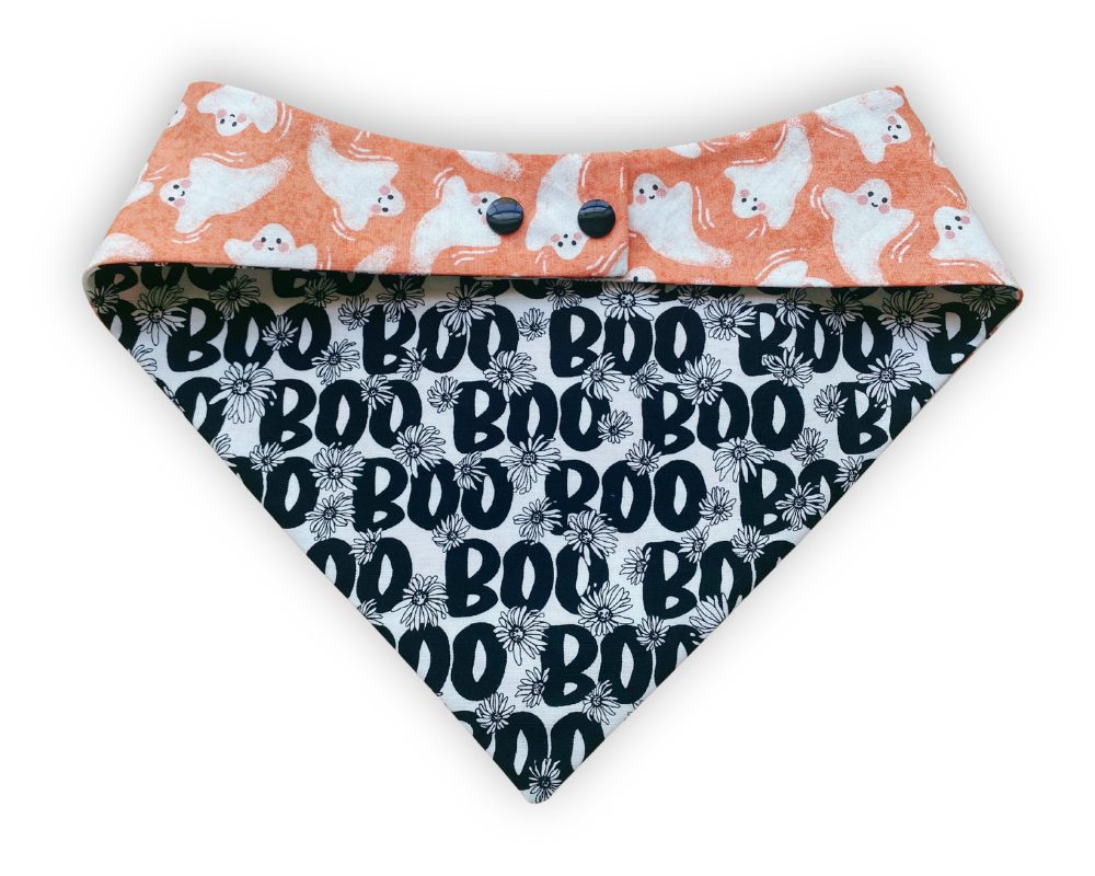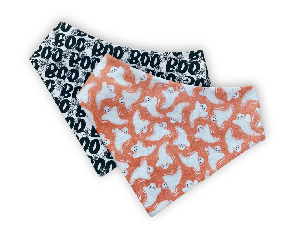 Halloween Bashful Ghost Dog Bandana in orange & white with an adorable black & white BOO print on the reverse is a must-have for your pup's spooky wardrobe this season!