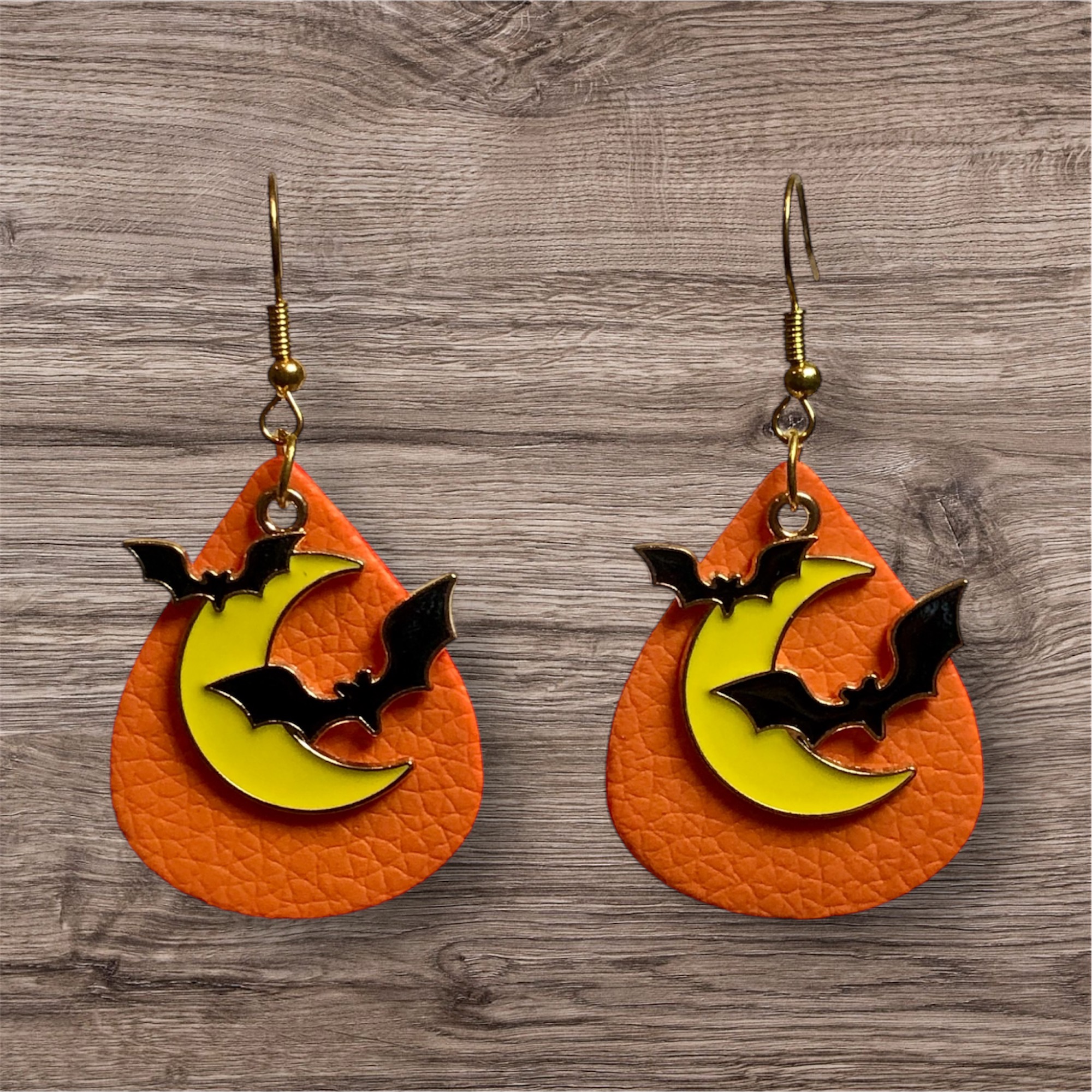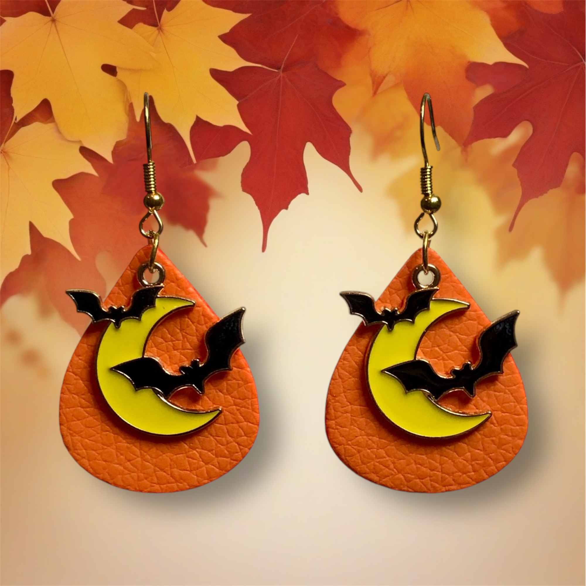 Unique Halloween Design: These earrings stand out with their enchanting bats and moon charms, making them an ideal accessory for the spooky season. The orange faux leather adds a bold pop of color that enhances the festive vibe.