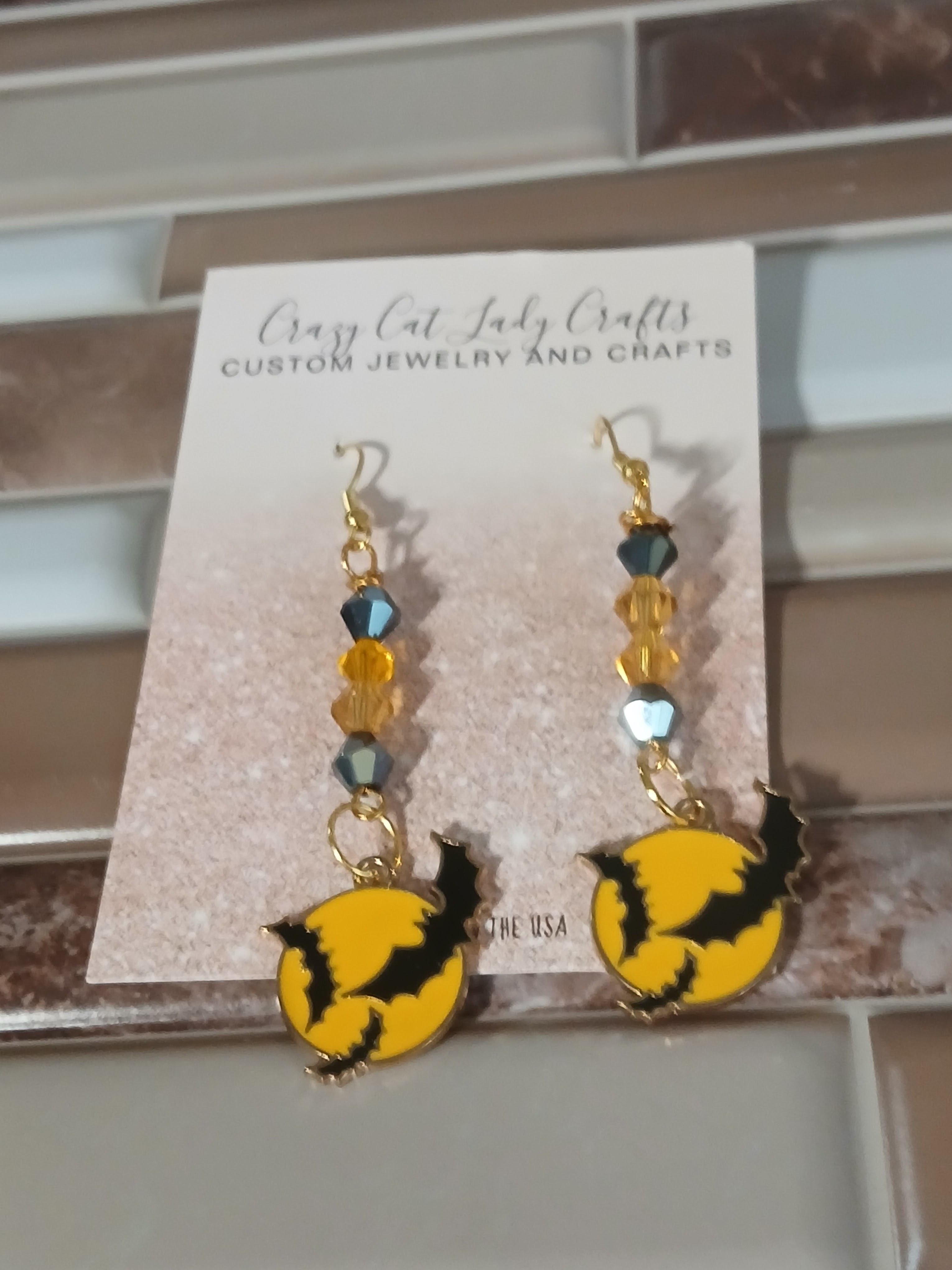 These Halloween earrings have black bats against a yellow full moon and has black and orange faceted beads on gold hardwear