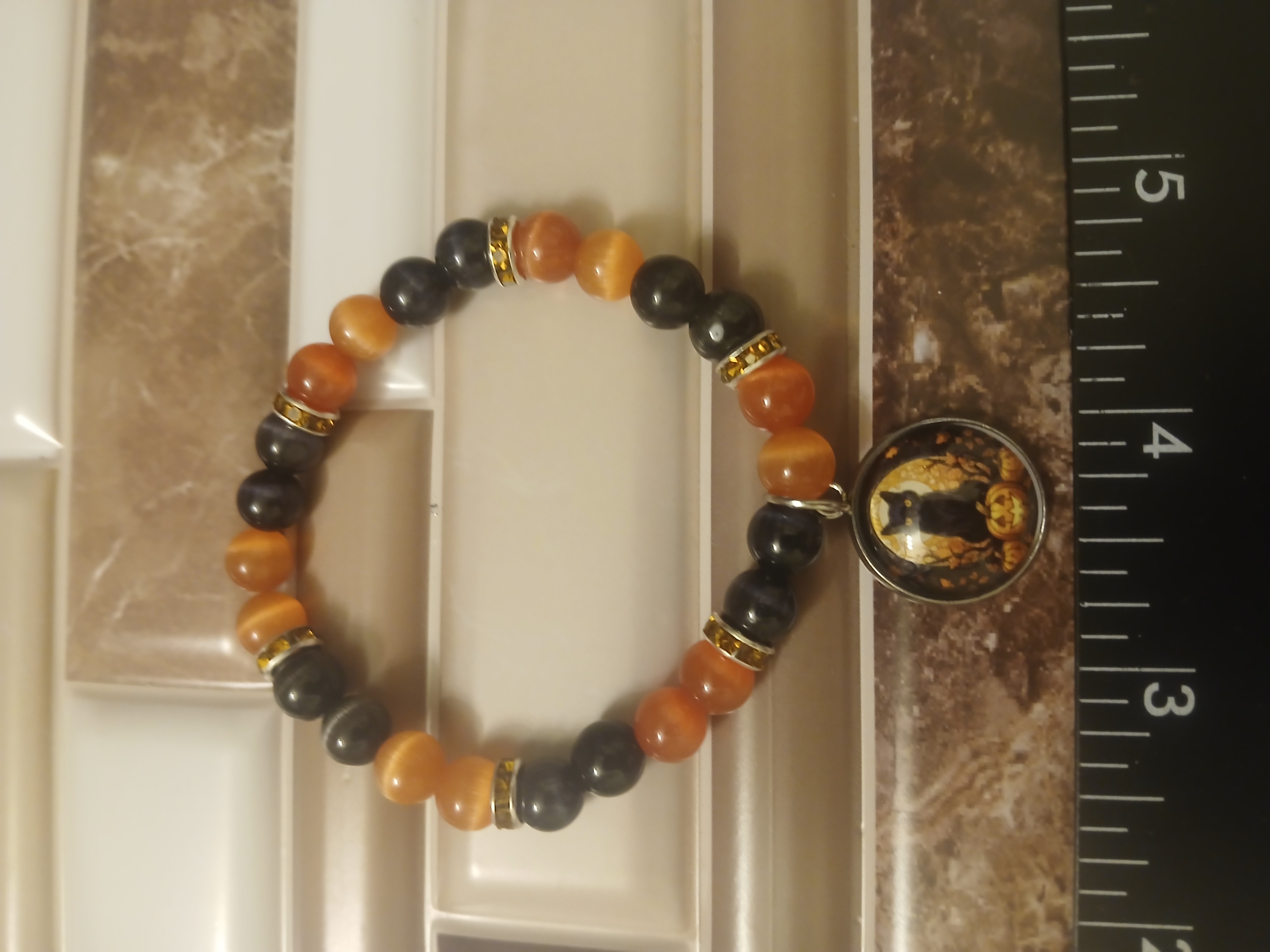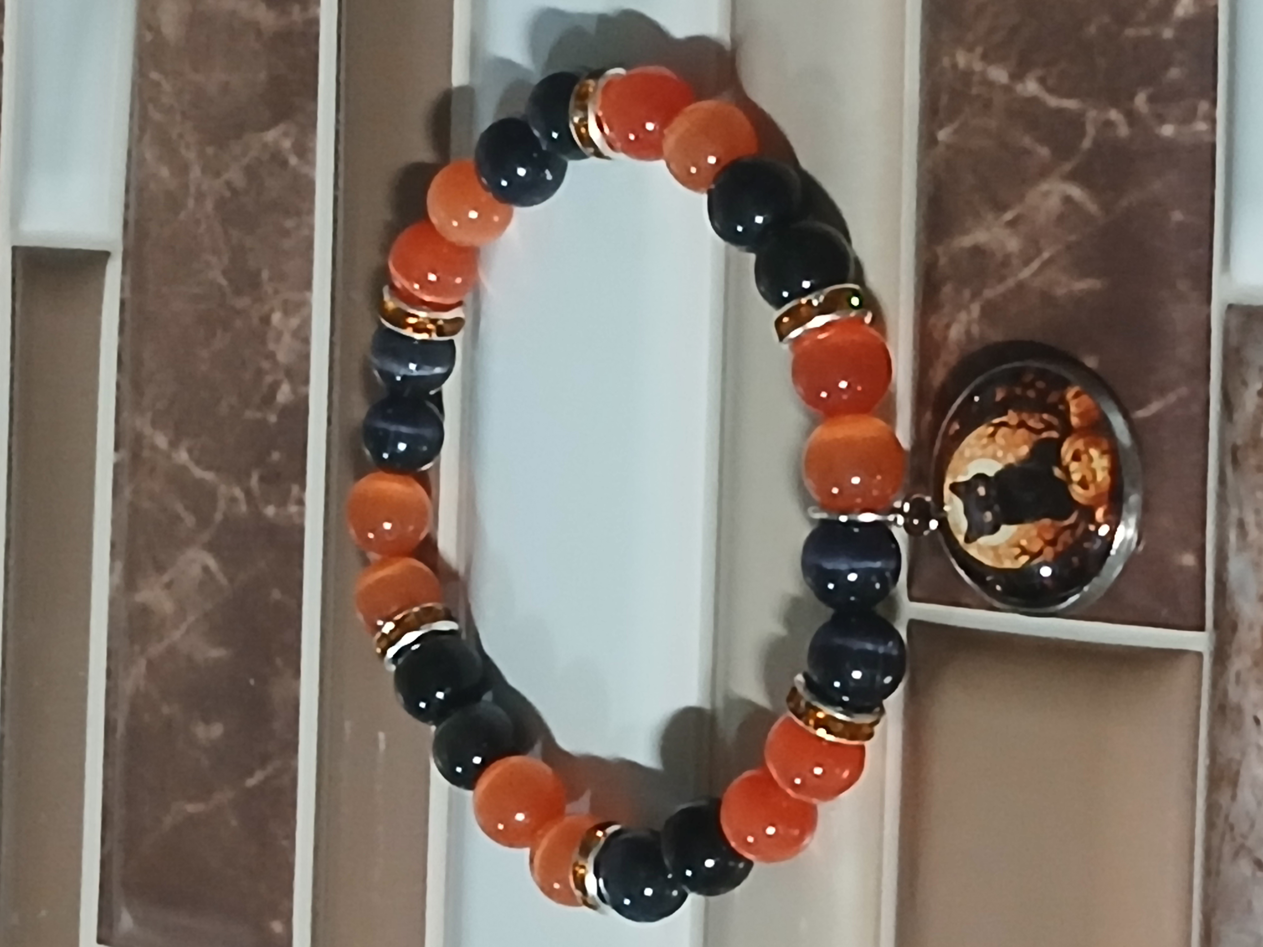 Dont let this cat cross your path. This black cat is with a pumpkin under his paw and scary trees around him all done in orange and black and the rest of the bracelet is made of black and orange beads you may want to wear this year round