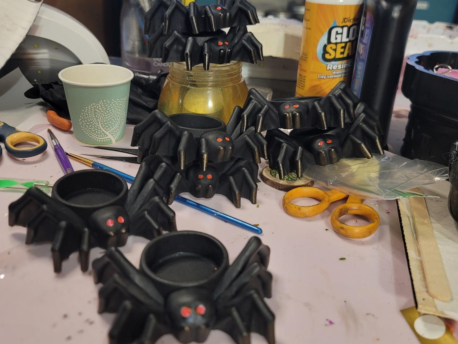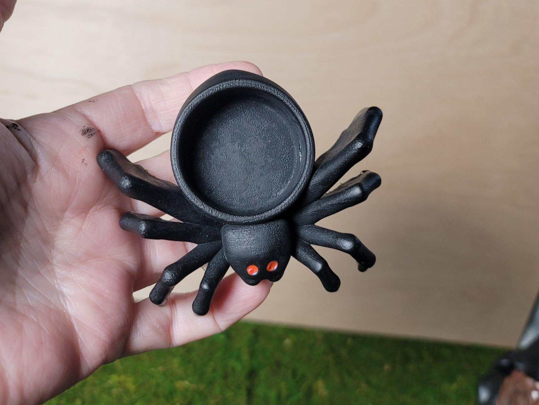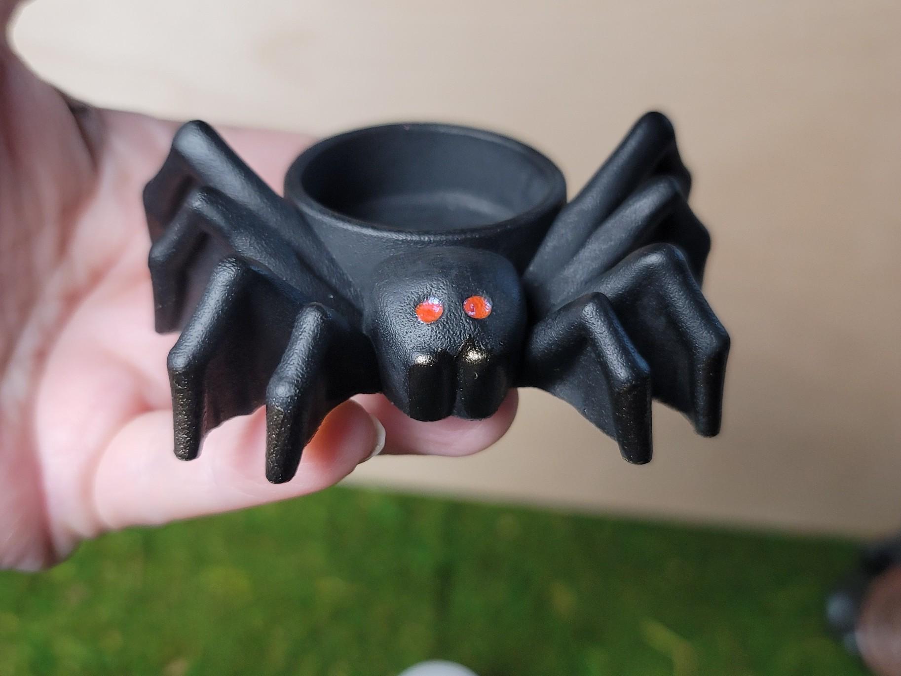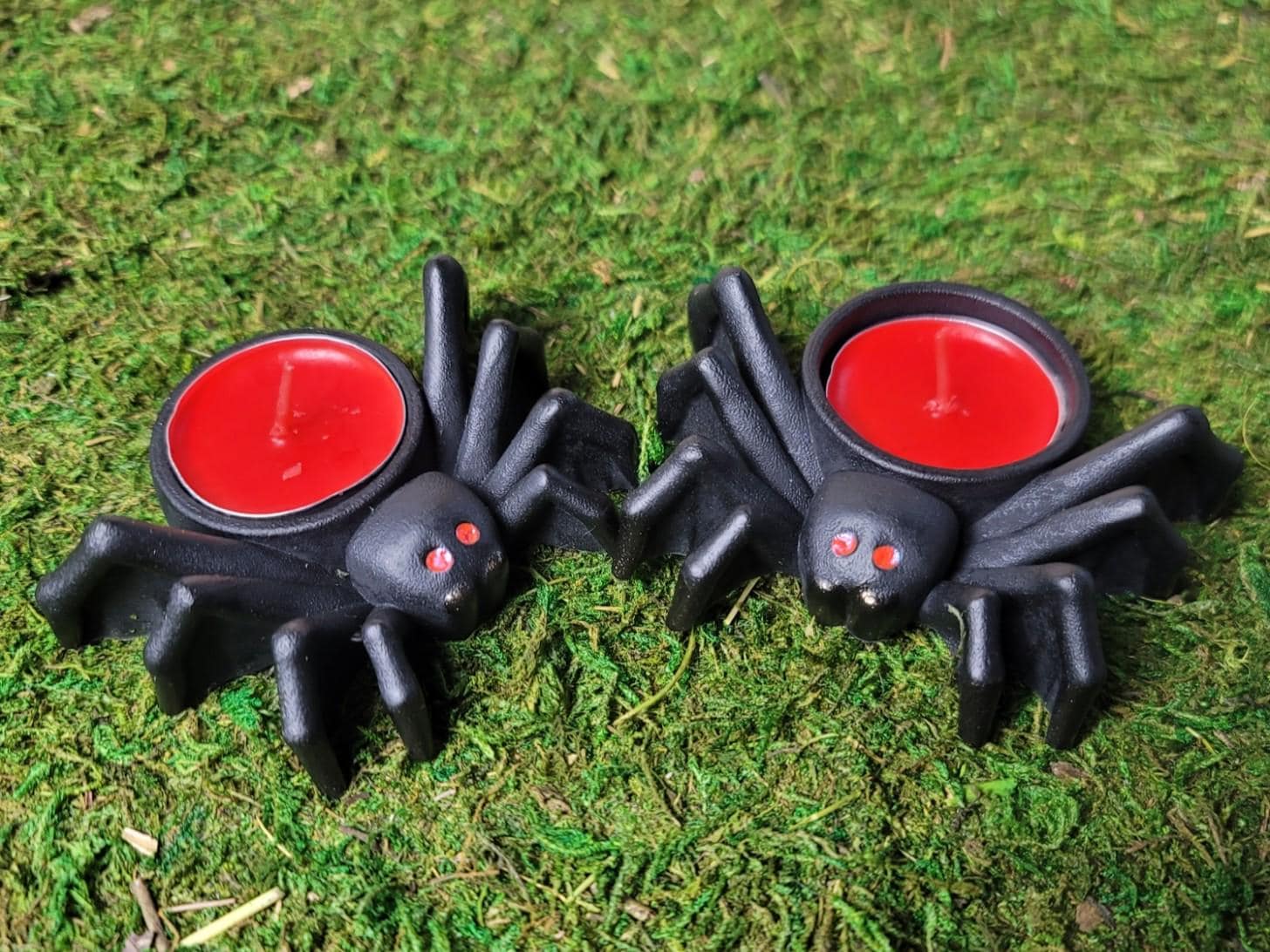 This cute little spider set is perfect for your Samhain altar or Halloween decor. Not all tealights are the same size. When ordering more, buy tealights that are under 1.5" diameter. I molded these with a 1.5", so it will fit but be a very snug fit. The battery operated candle that I include is 1.5", the wax tealight is 1.38" and I bought both on amazon. The spider measures 3.5 at the widest section and is about 1.25" tall without the candle.