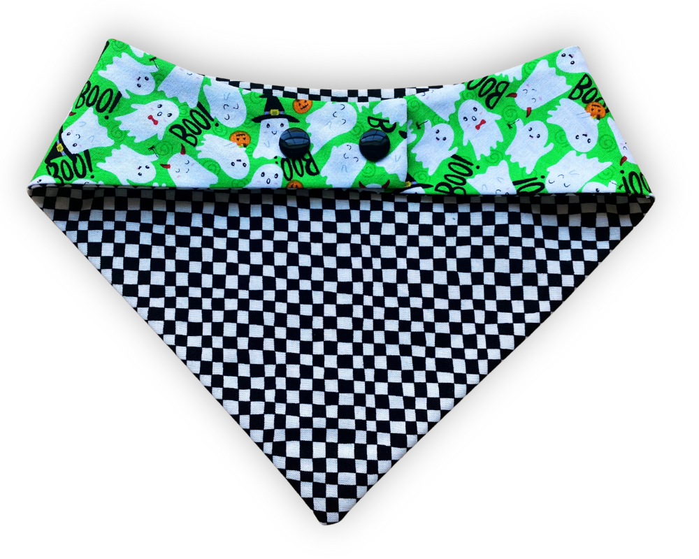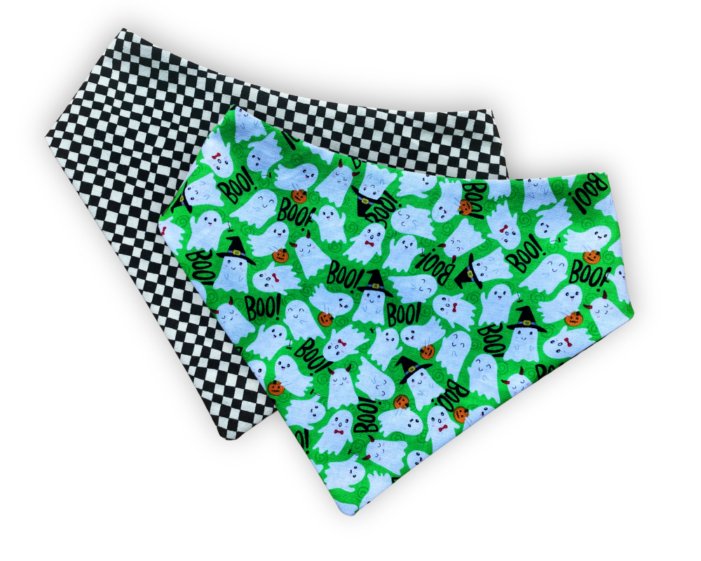 Halloween Friendly Ghost Dog Bandana?? This spook-tacular bandana is perfect for all the furry trick-or-treaters out there! With its playful ghost and pumpkin pattern set against a bright green, your pup will be the talk of the dog park.