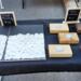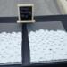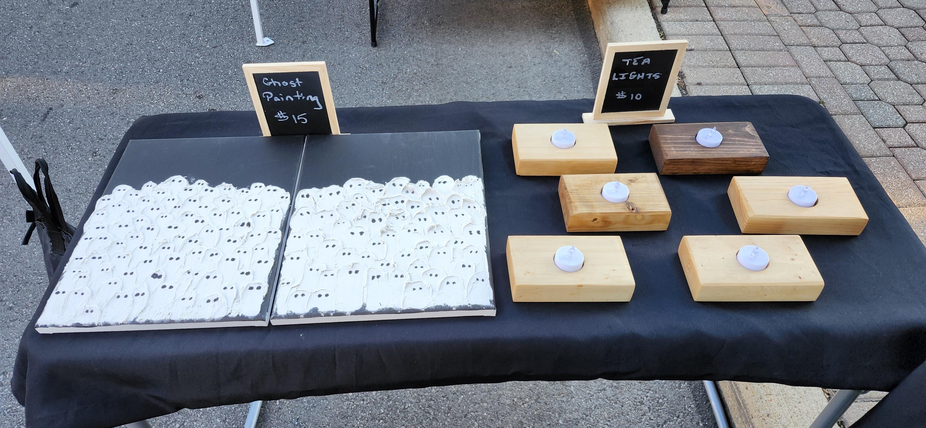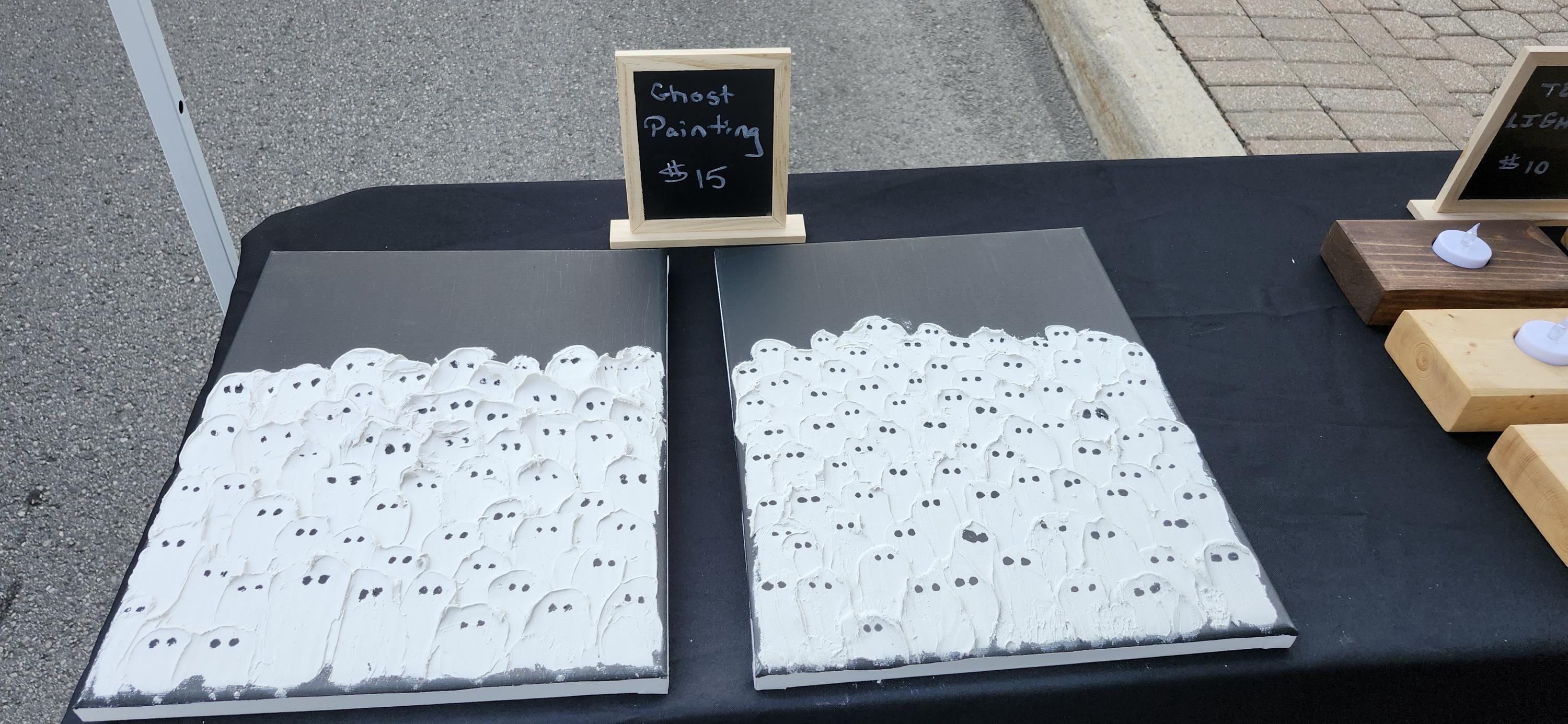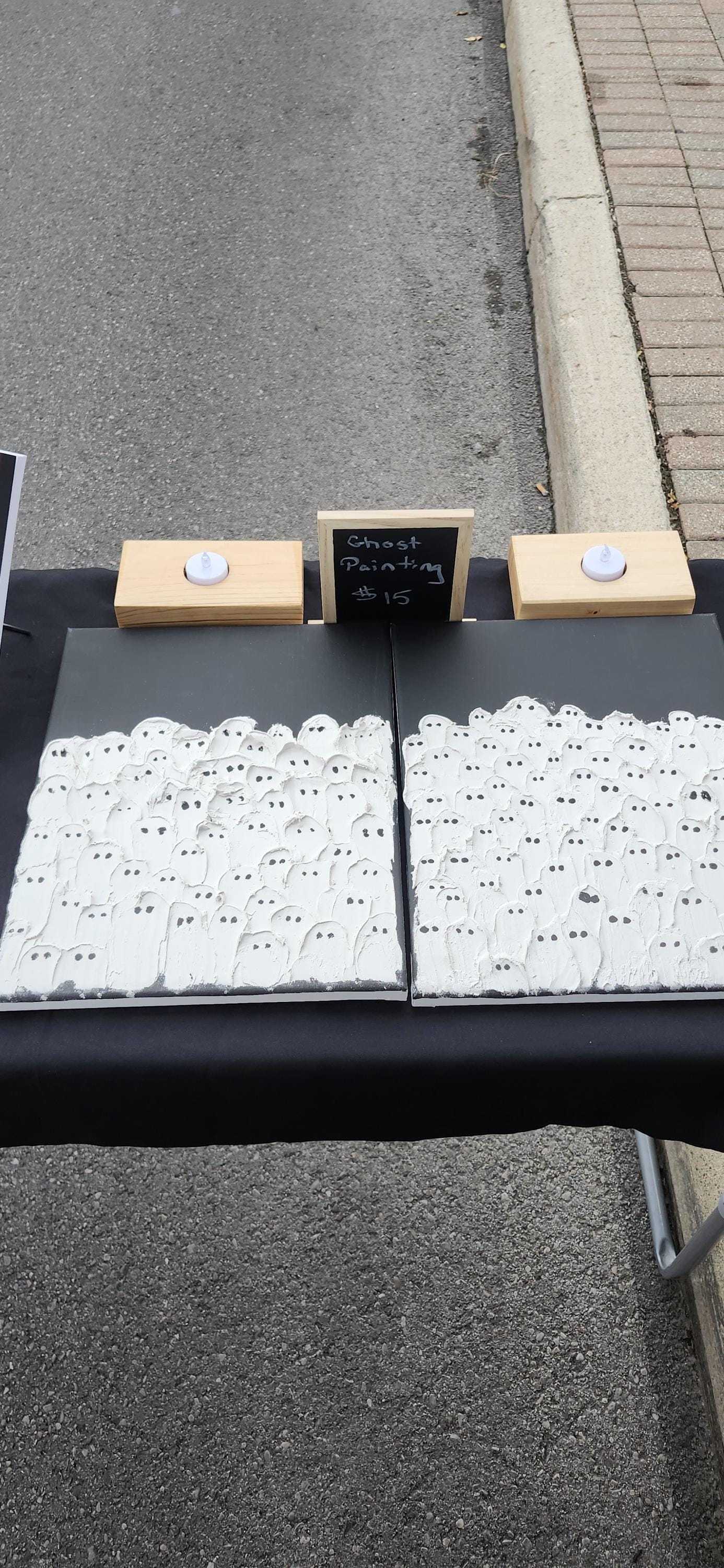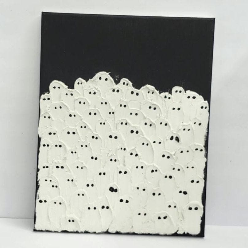 This fun Halloween painting was done with spackle on a primed canvas painted black. They eyes were done with acrylic paint.