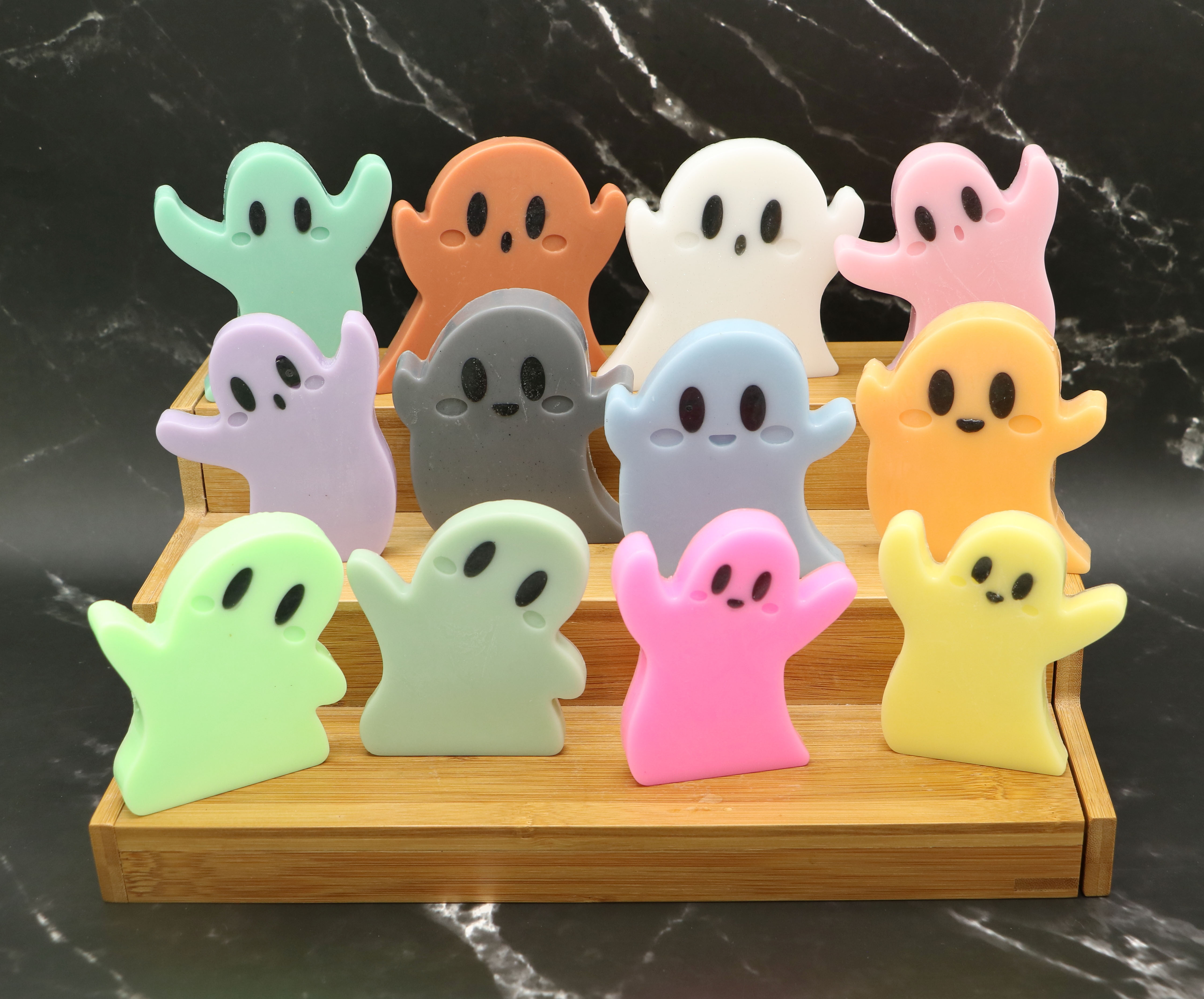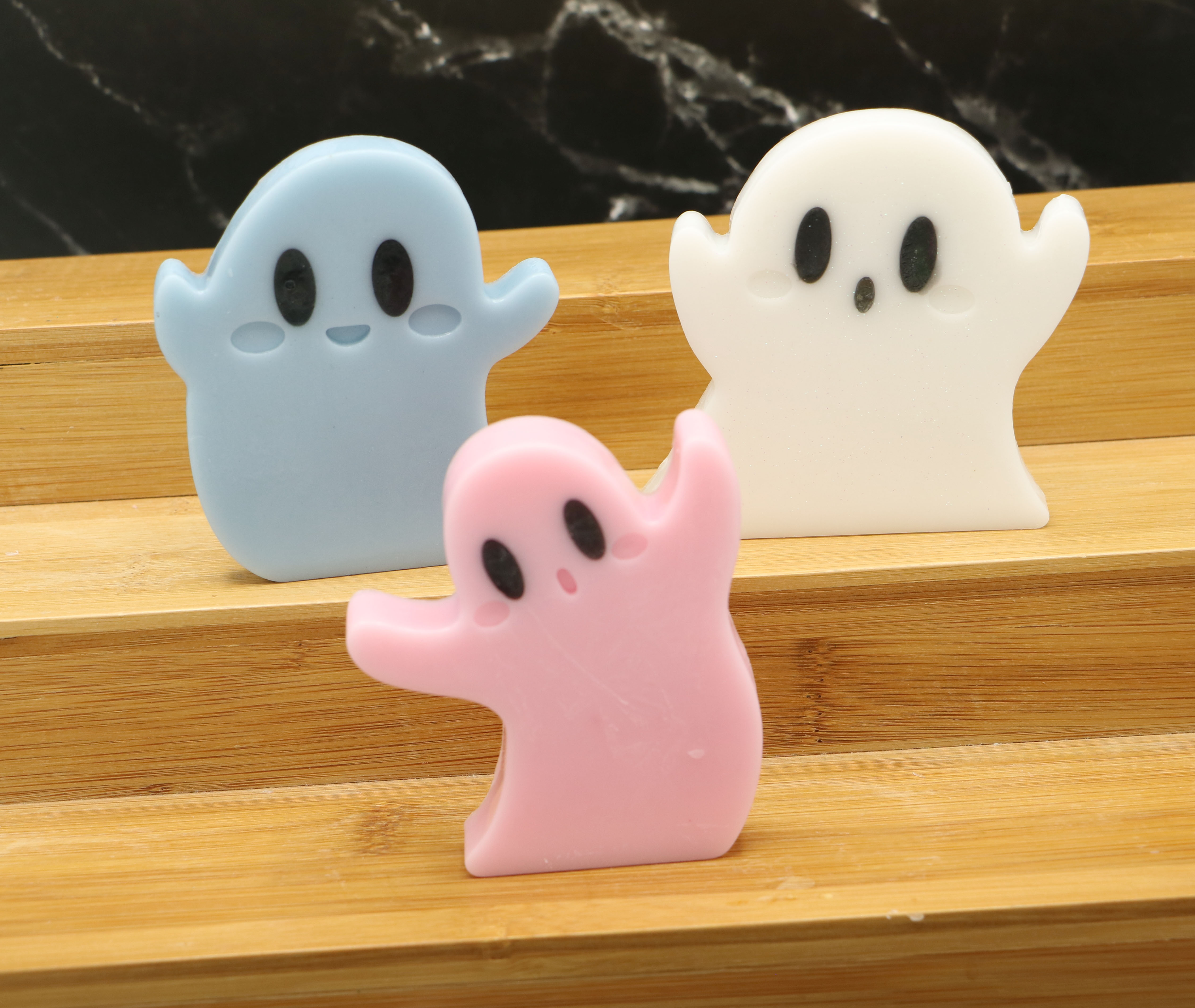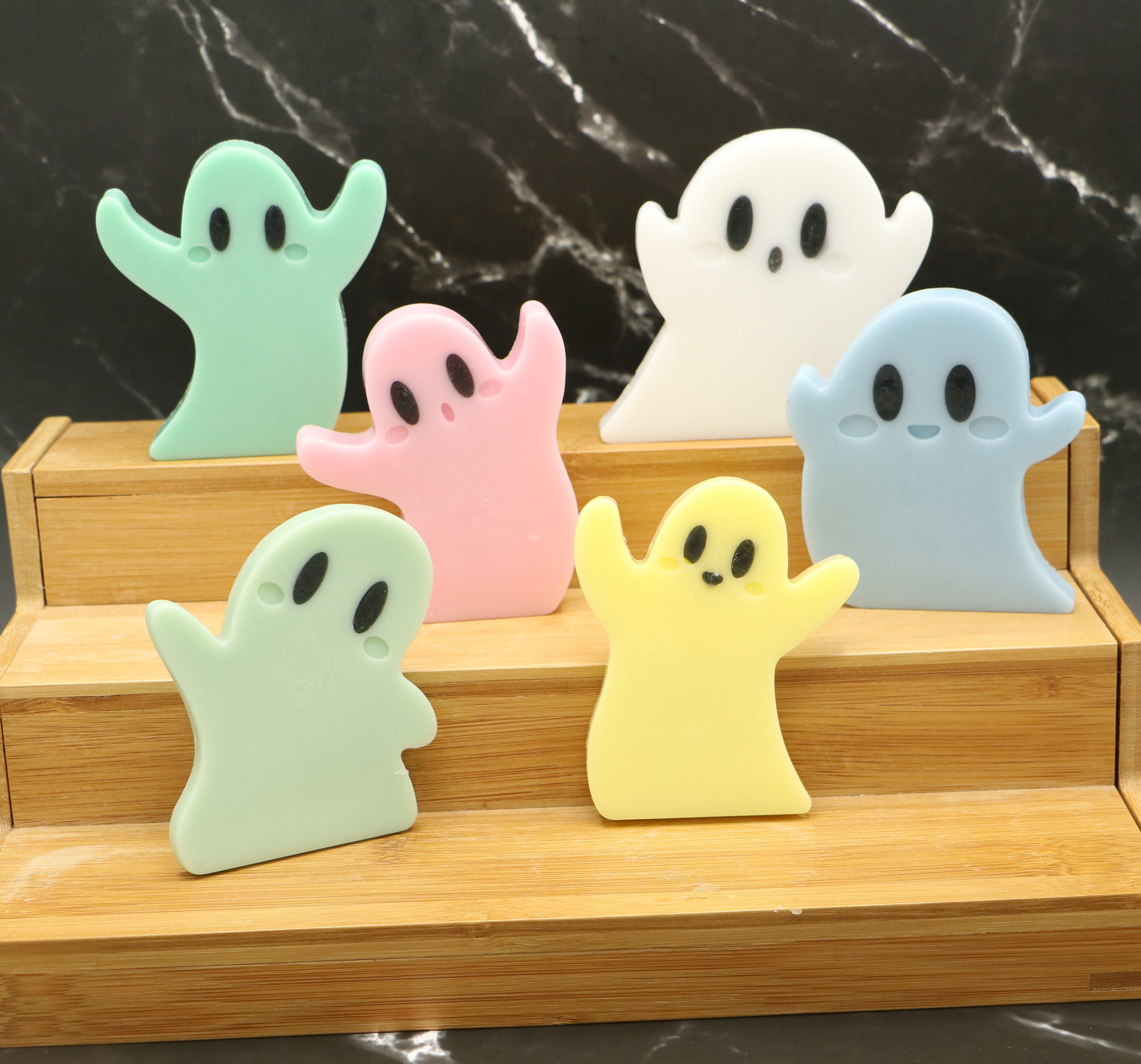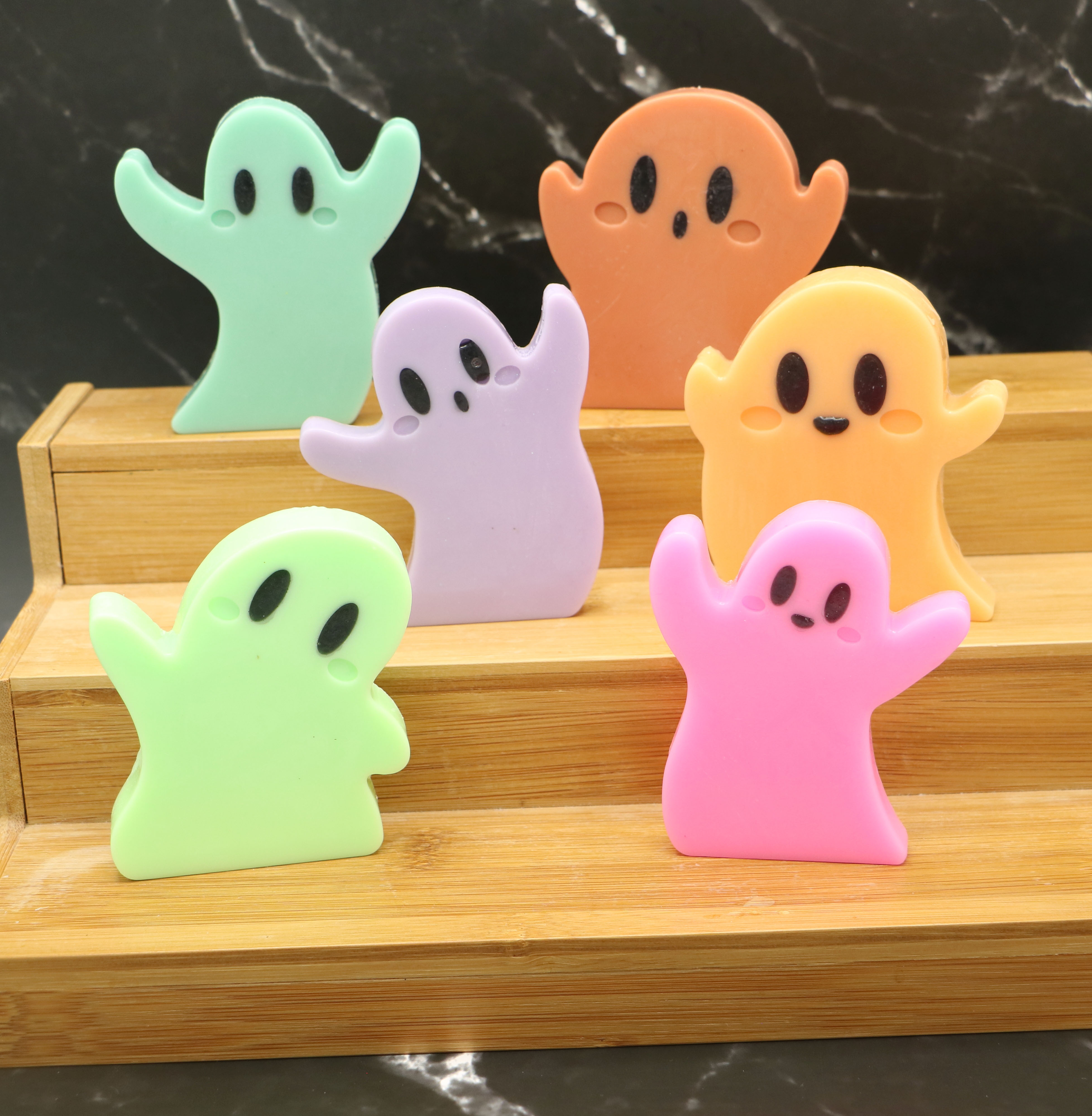 These adorable Goofy Ghost Soaps are too cute to be scary! Each quantity equals 6 soaps: one of each design. The 2 pictures with 6 ghosts show the six different designs.