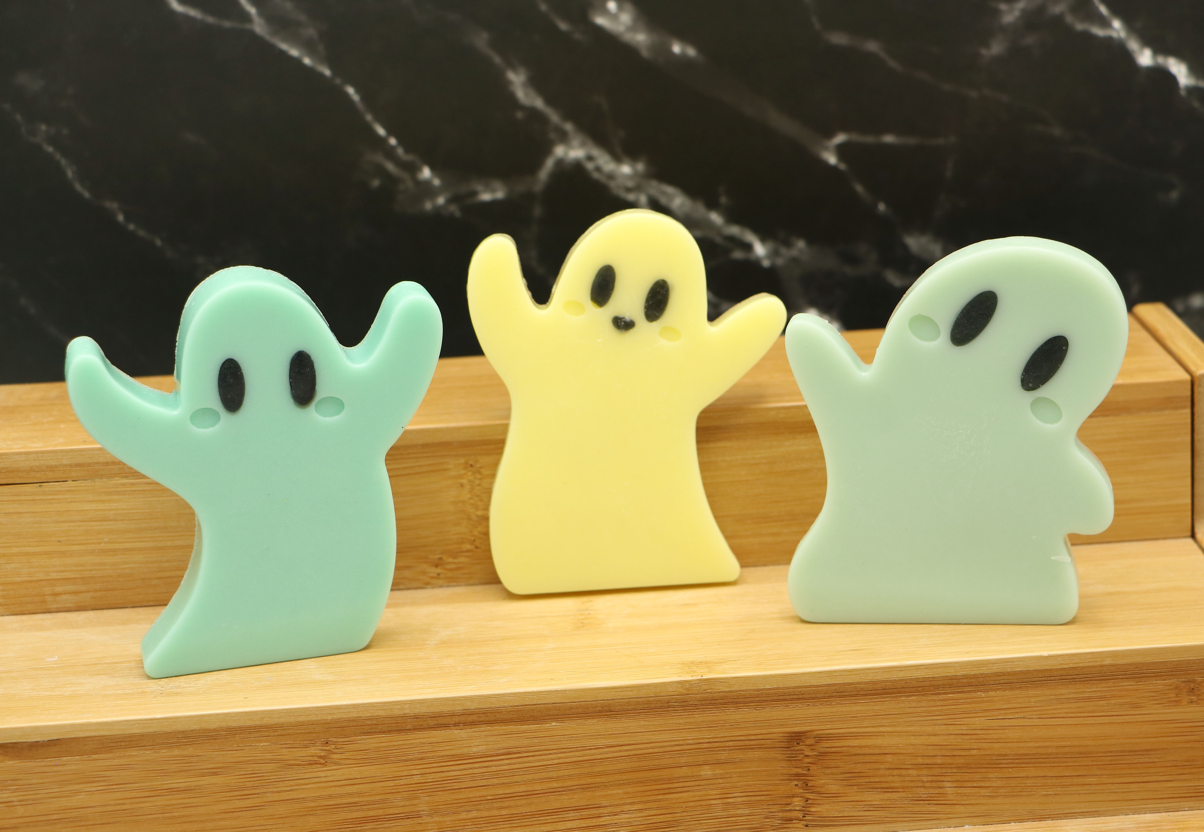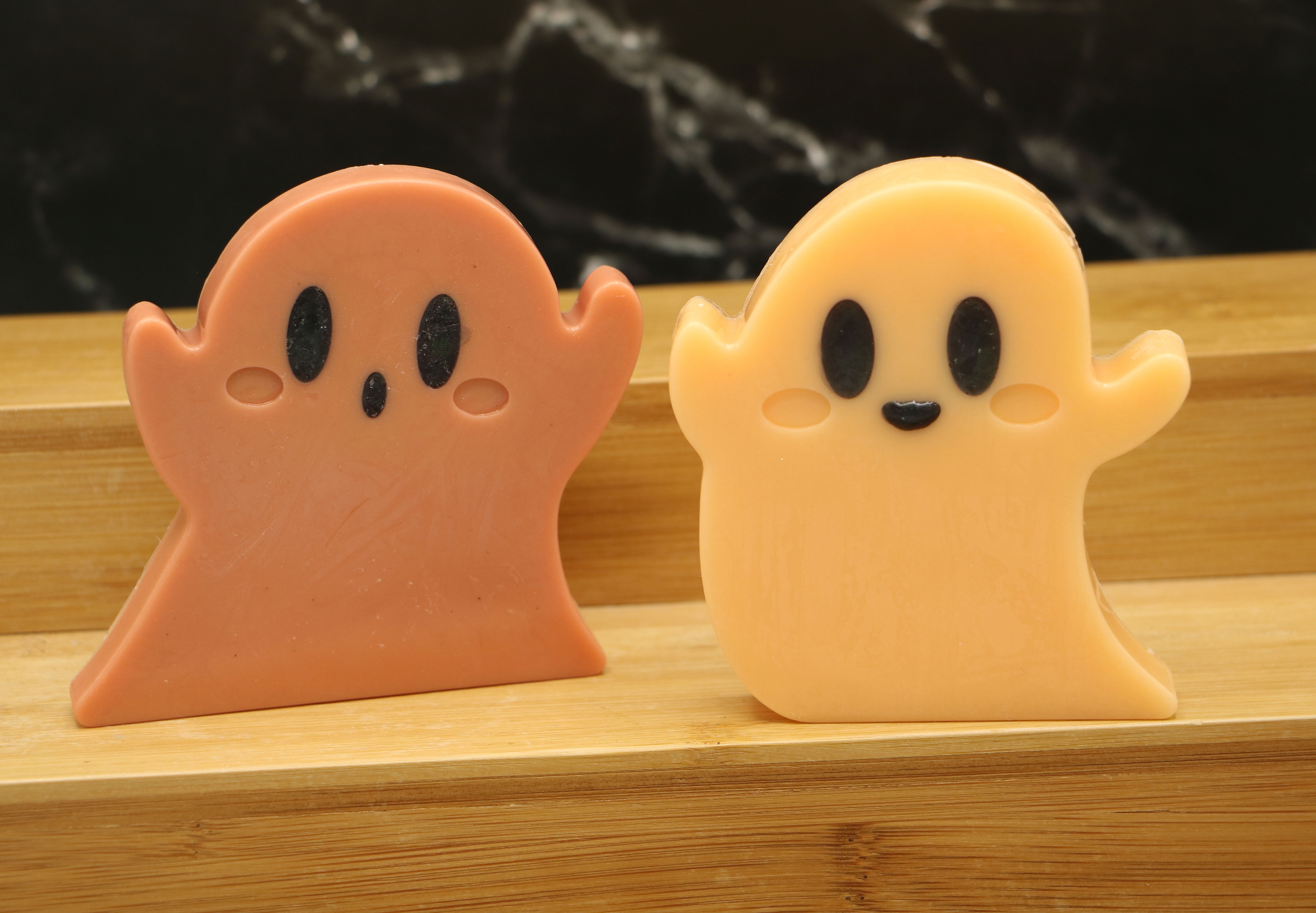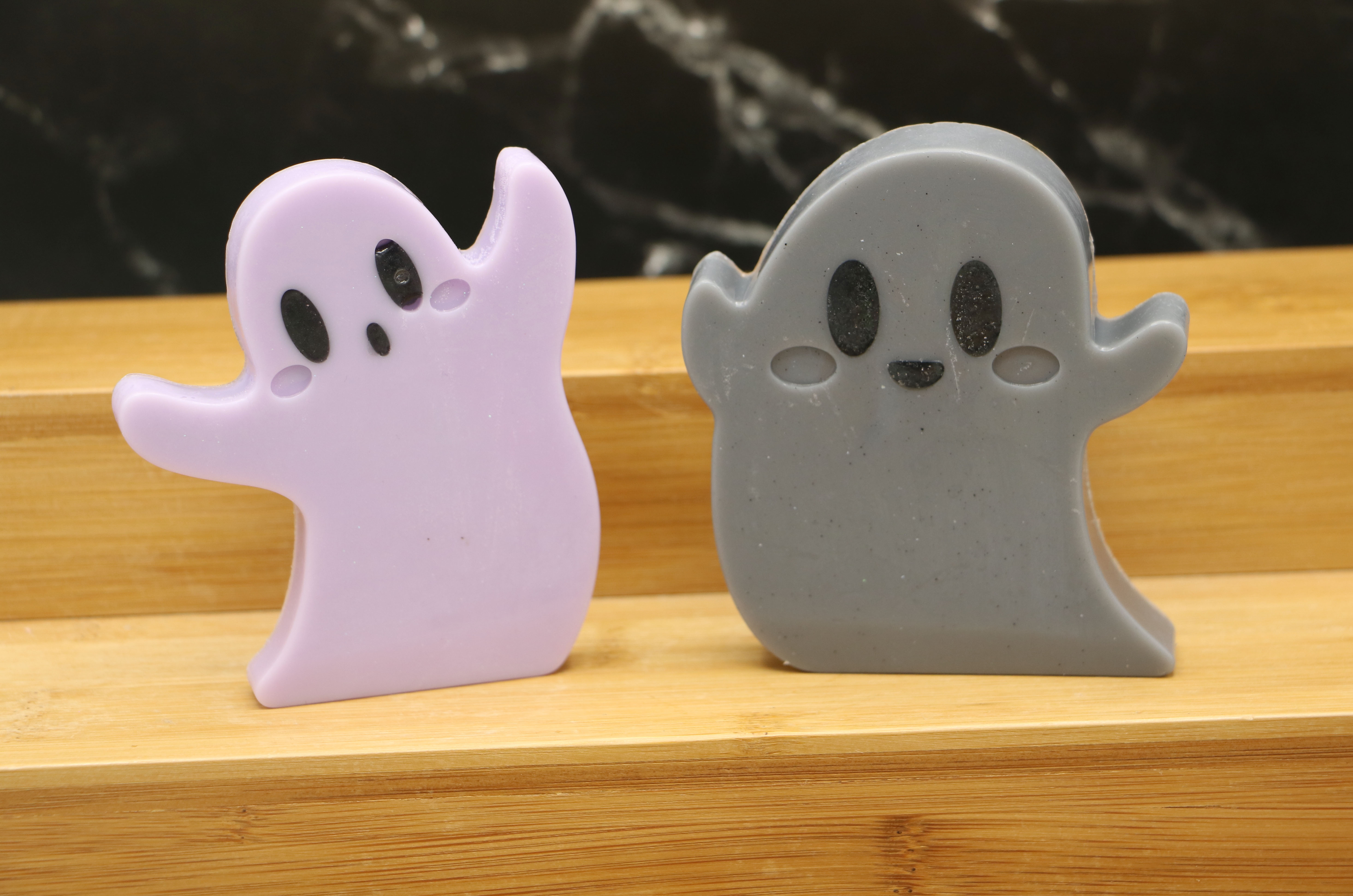 Soap is prepared using the customer's requested soap color and scent choice. The soap is then poured into the molds. When hardened, each soap is gently removed from the mold & placed on a clean sheet of parchment paper. I then melt a small amount of black soap. Using a small dropper, I place the liquid black soap into the areas for the eyes and mouth of each ghost. When this soap has hardened, each soap is then placed into clear bags and sealed. Gloves are worn throughout the soap crafting process. I routinely wash my soap molds between each use. All utensils/pitchers/items used are sanitized prior to use.