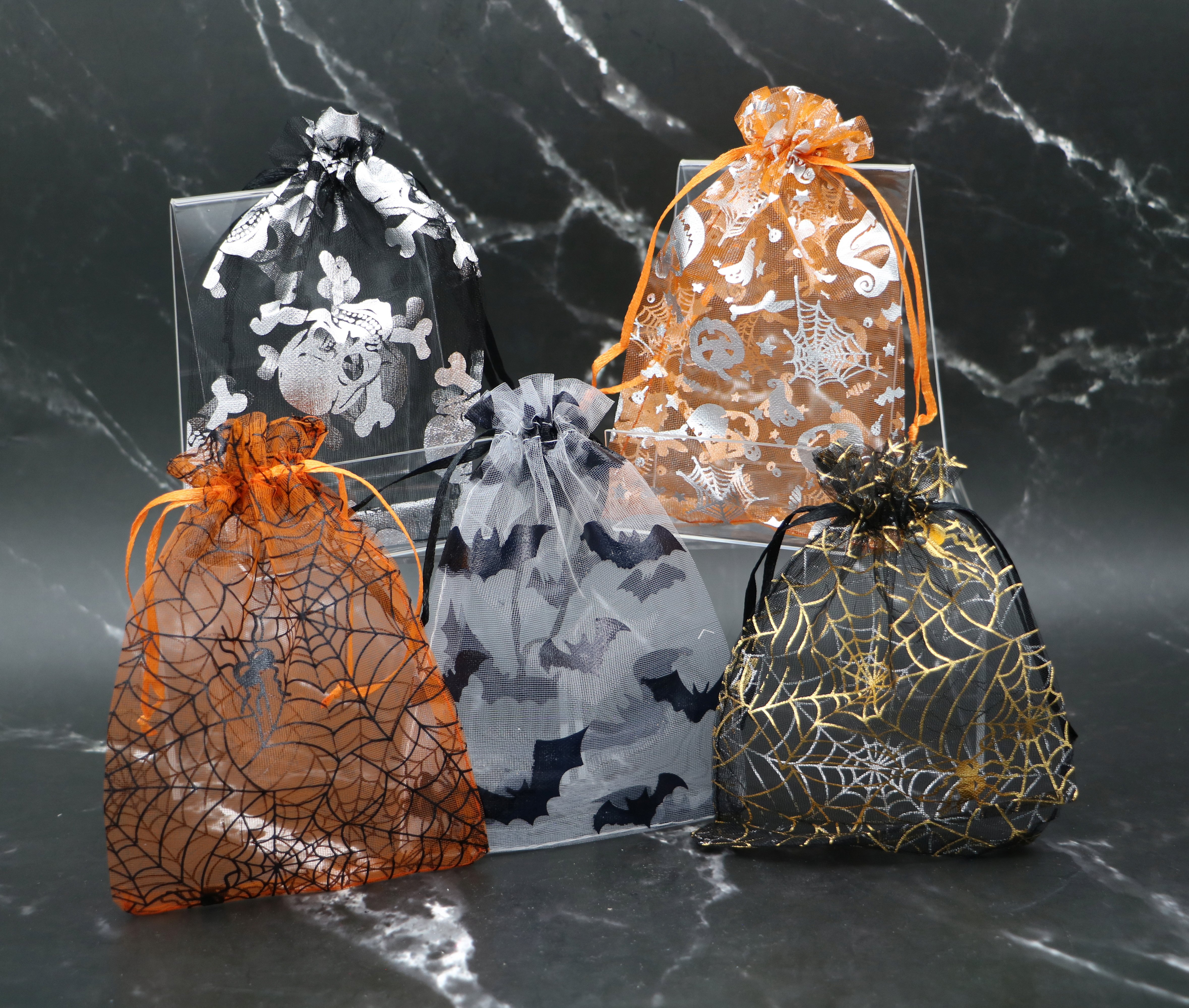 #3-Each soap in clear bag, then each soap will be placed in a Halloween themed Organza Gift Bag (6 total). These organza bags will arrive in assorted colors of white, black & orange. They are decorated with spiders, cobwebs, skulls & pumpkins.