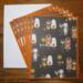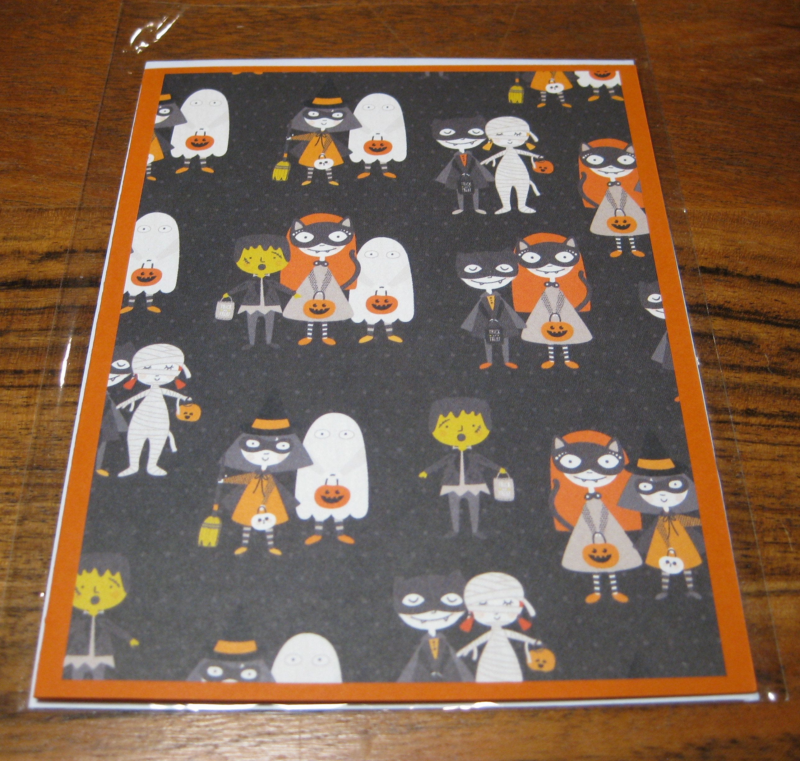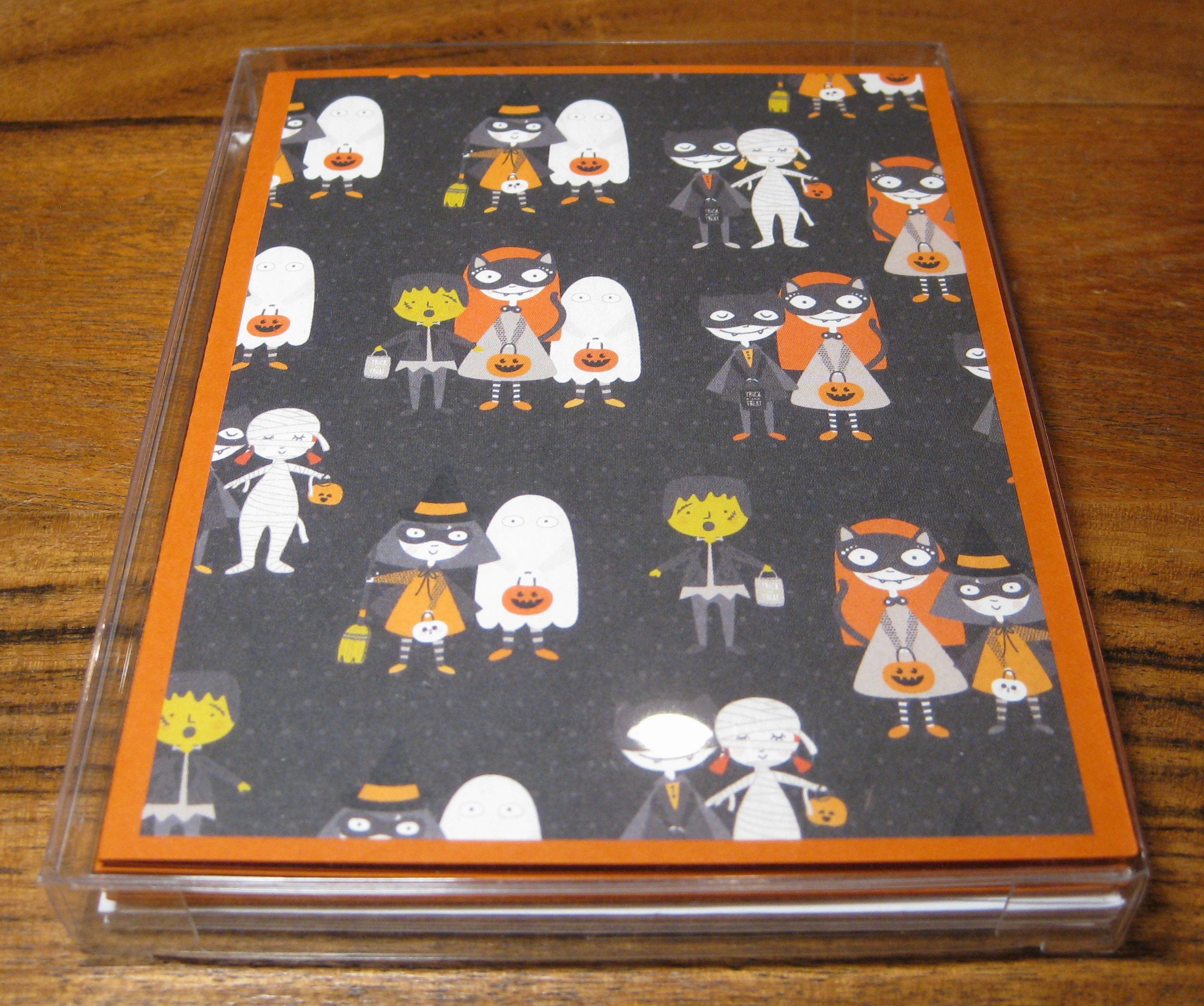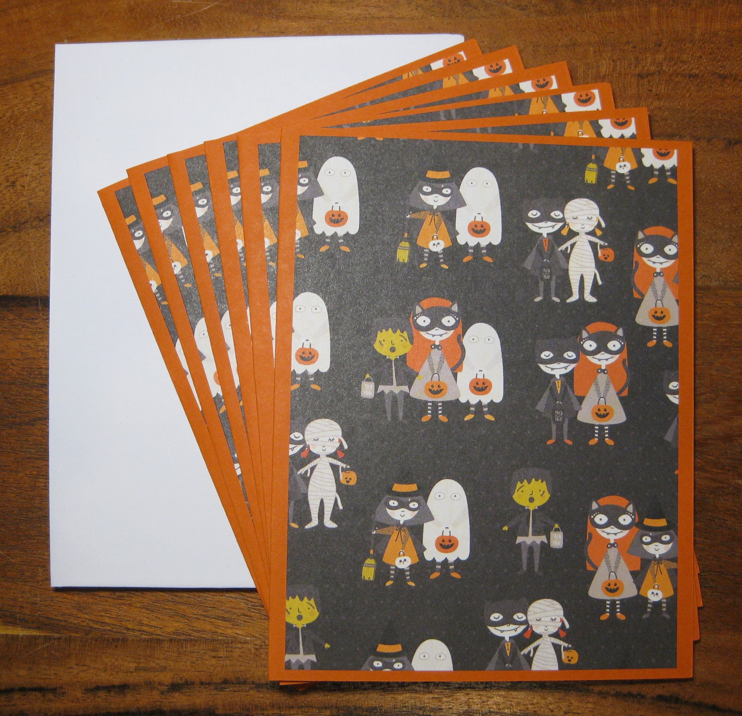 6 Kids Halloween cards and 6 white envelopes, Black background filled with trick-or-treaters. The cardstock is orange.