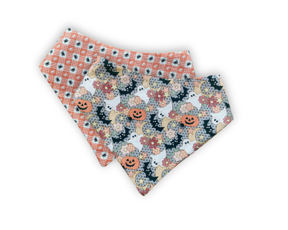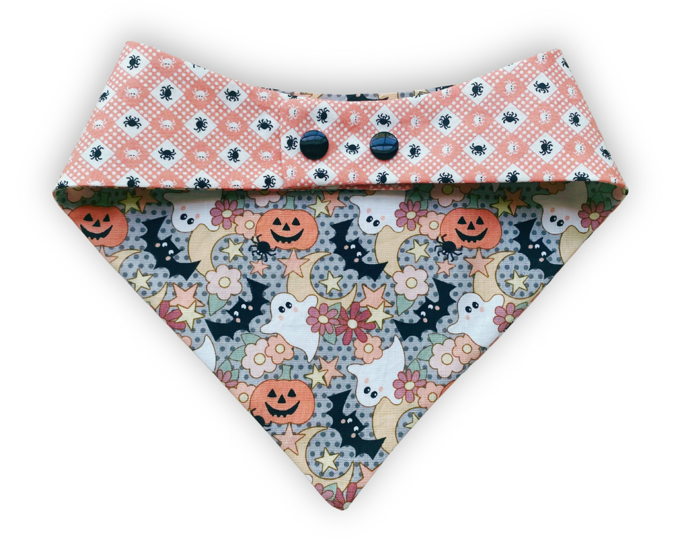 Halloween-Themed Reversible Dog Bandana Featuring Spiders, Pumpkins, Bats, and Ghosts—perfect for adding a spooky touch to your pet’s ensemble this season!