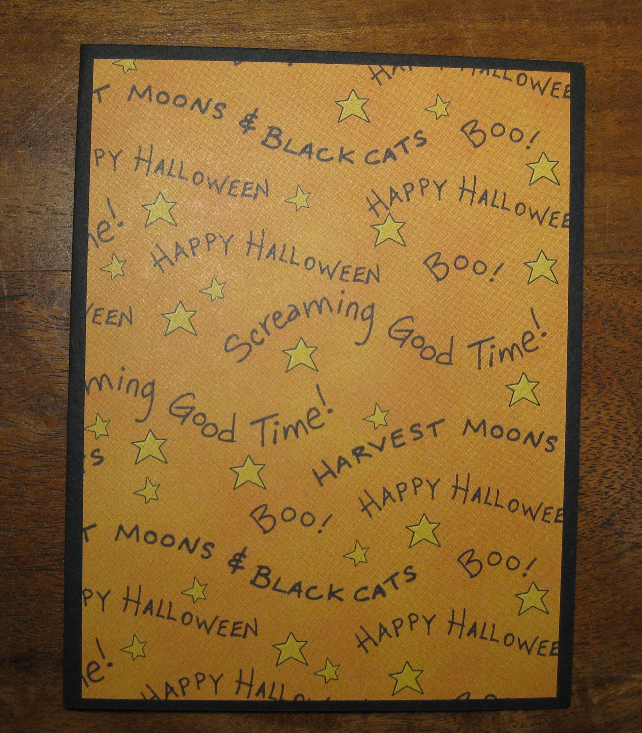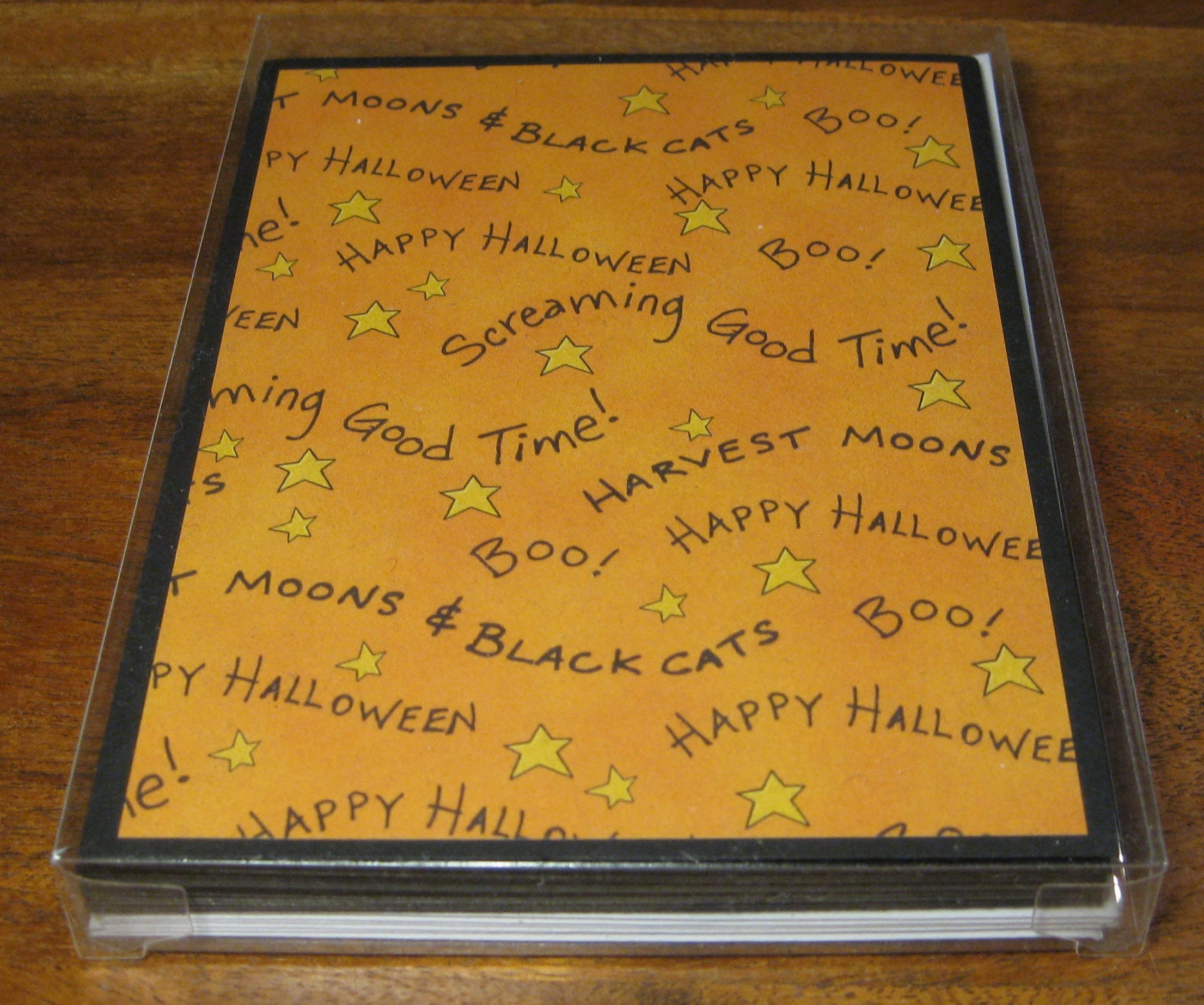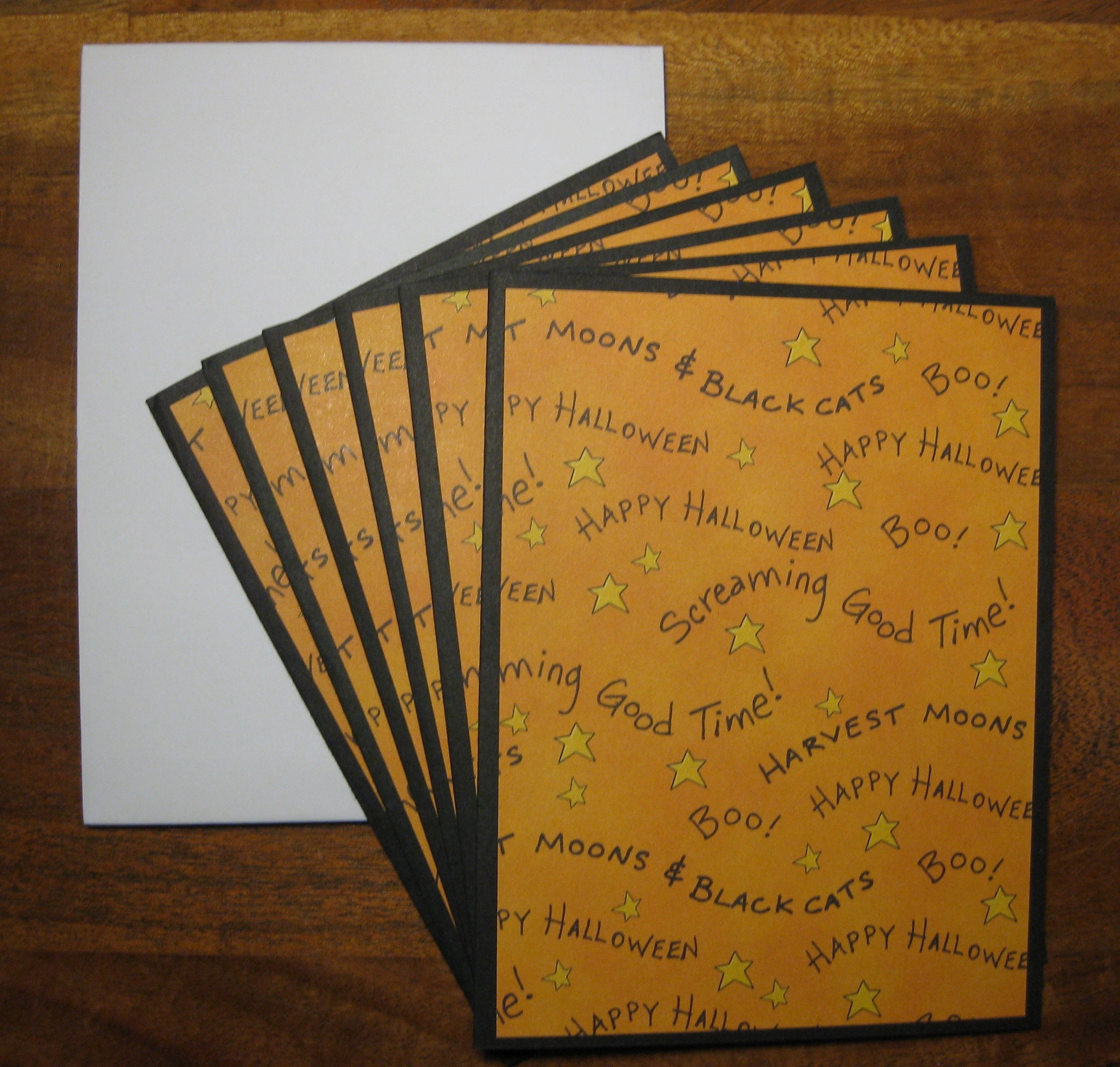 6 Halloween note cards and 6 white envelopes Orange background filled with Halloween words. The cardstock is black with white cardstock inside.