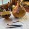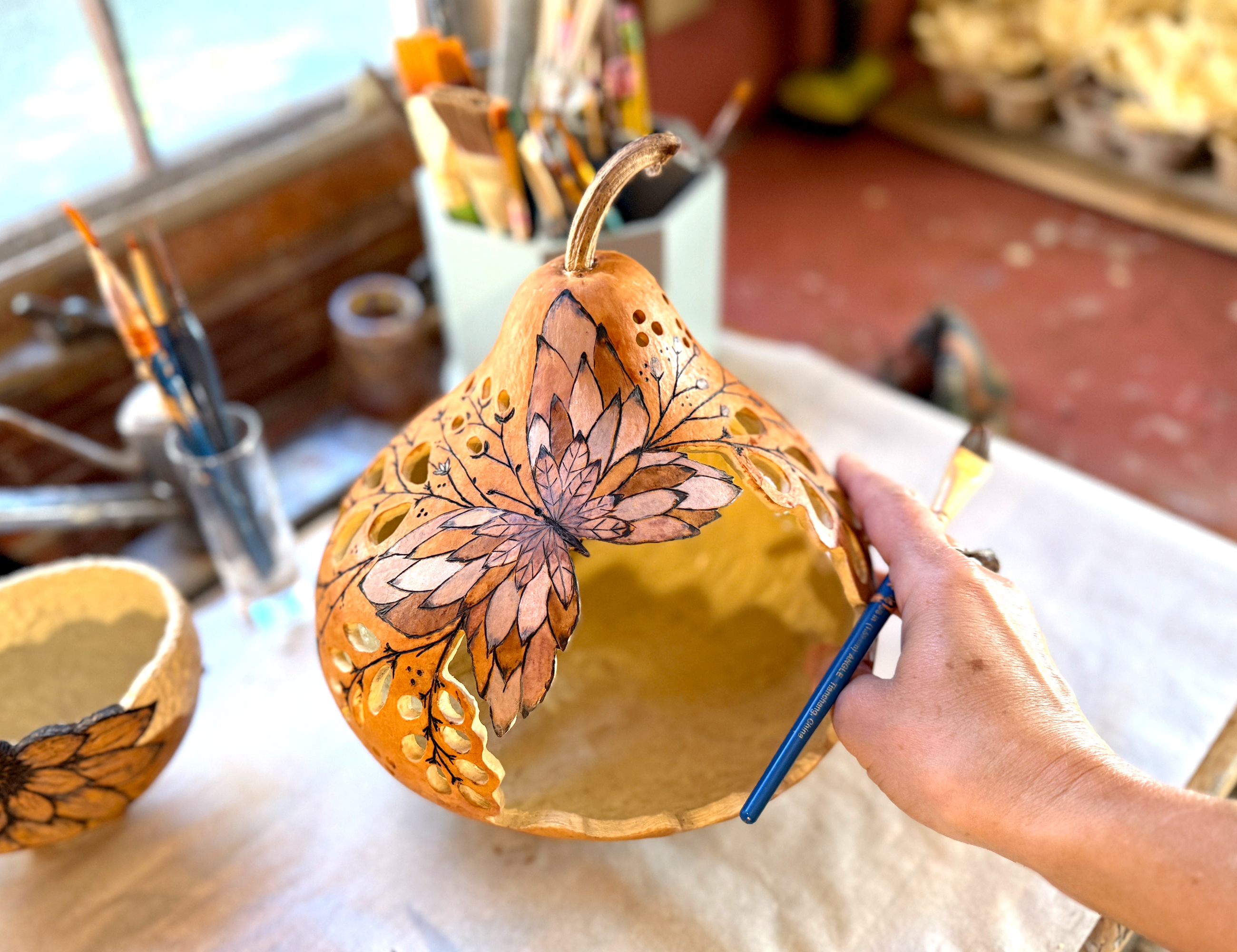 I use the gourds to create whimsical fall pumpkin characters with a ton of personality. I also enjoy turning the gourds into decorative bowls, vases, and vessels. Each gourd shape is unique, so each gourd piece is a one-of-a-kind!