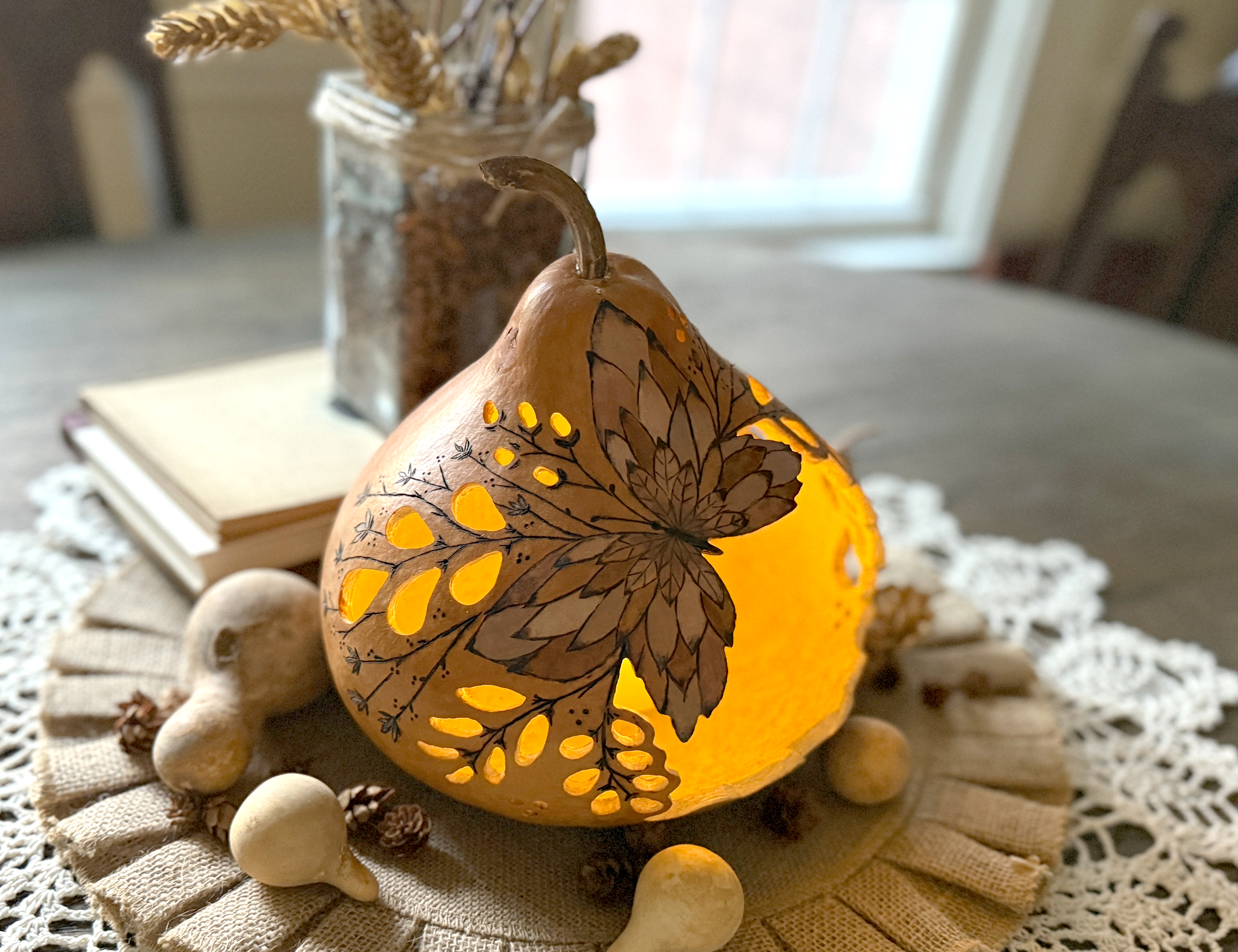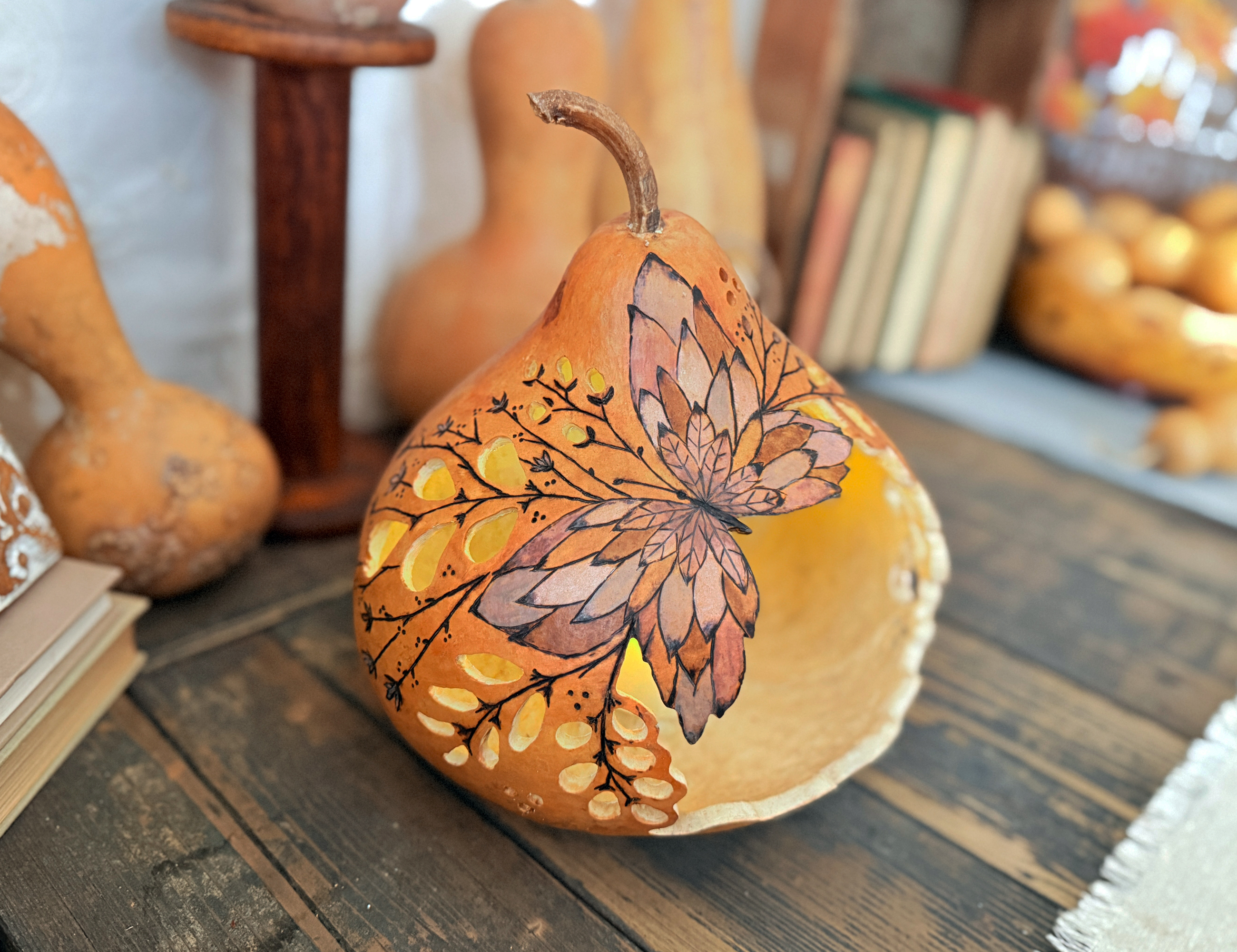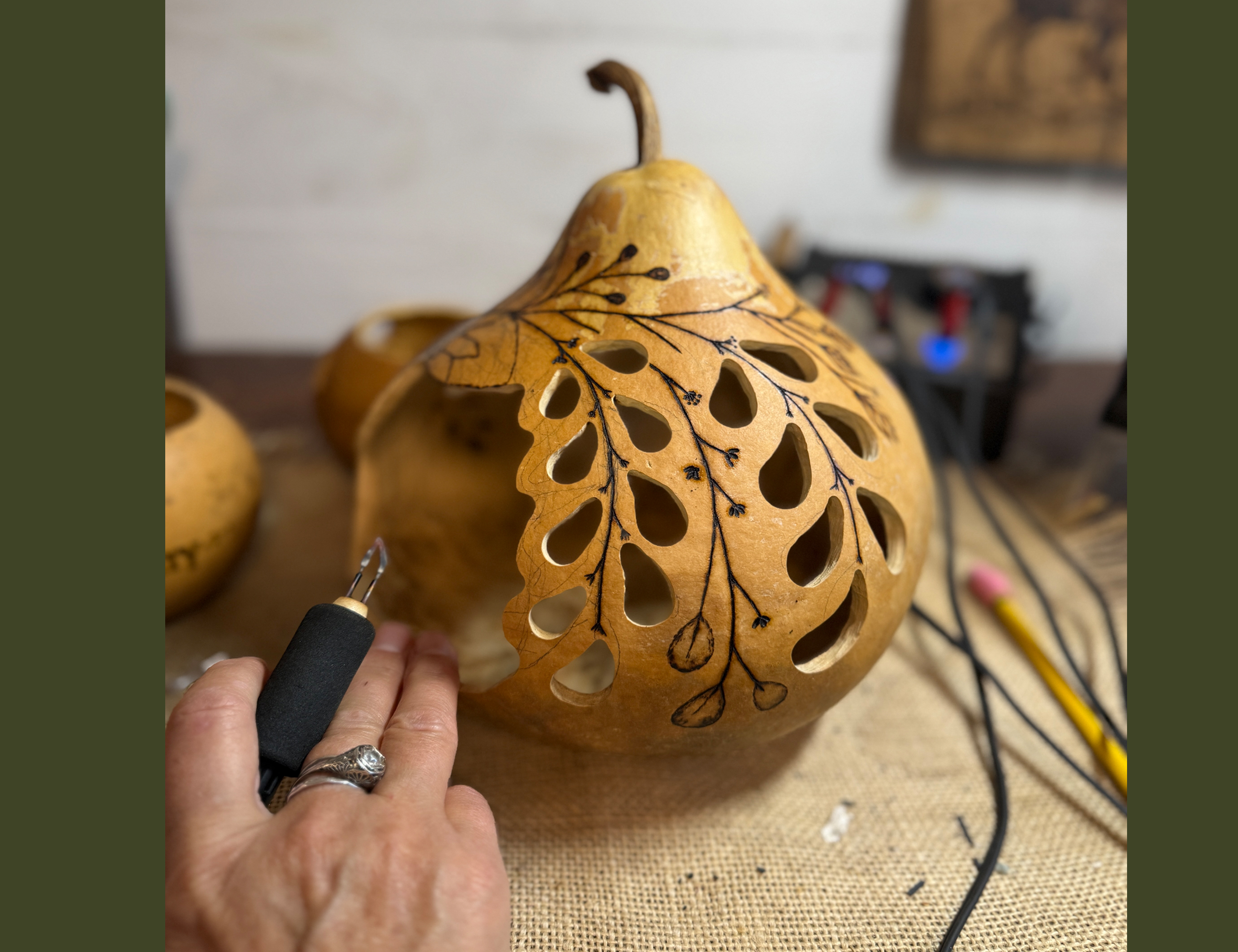 When I discovered the incredibly versatile dried gourds, it was love at first sight! I instantly added them to my creative routine. I've always adored pumpkin carving, and here was a similar natural vegetable that will for many years without the shelf life of a fresh pumpkin. The dried gourd shells are very hard and perfect for carving and pyrography!