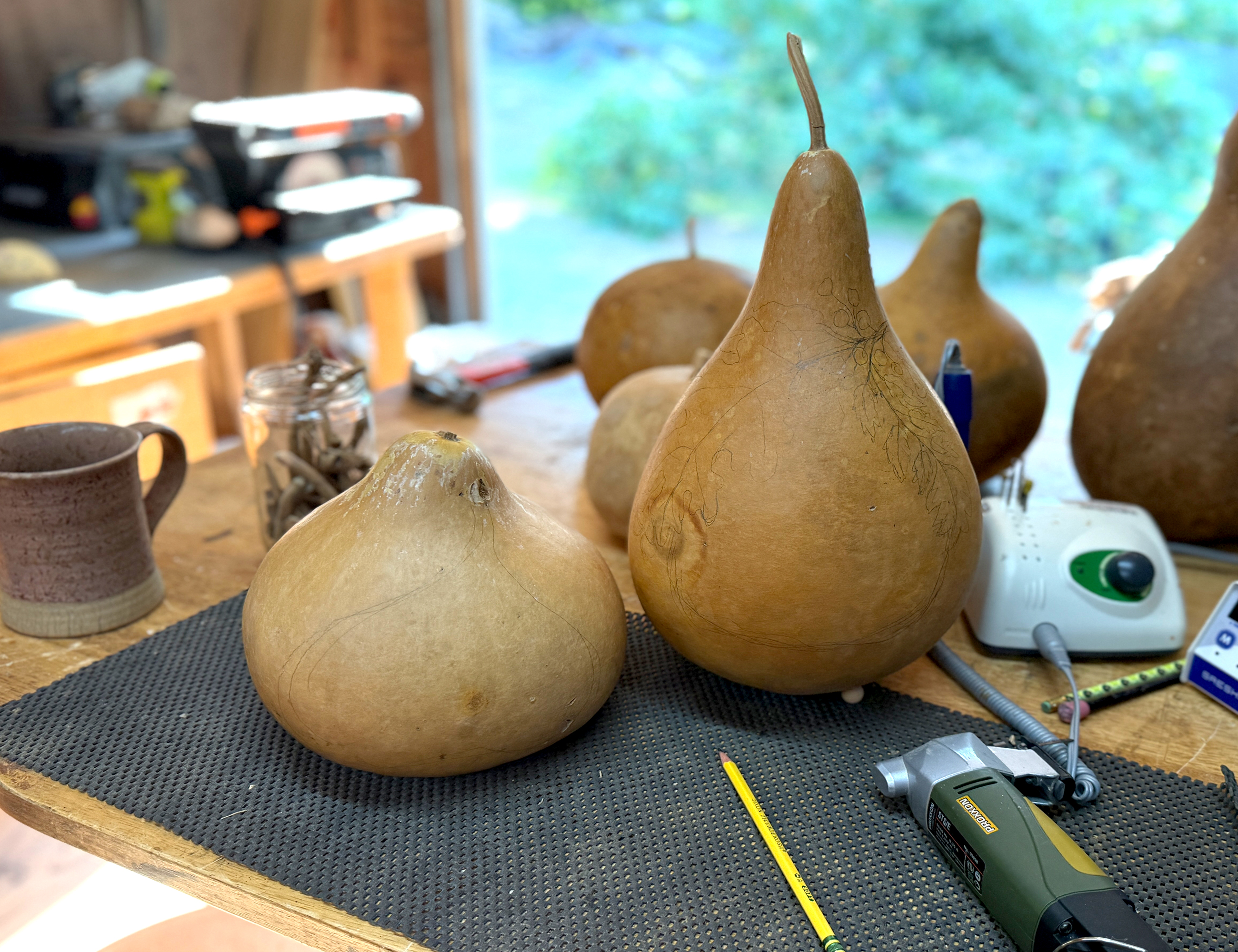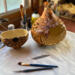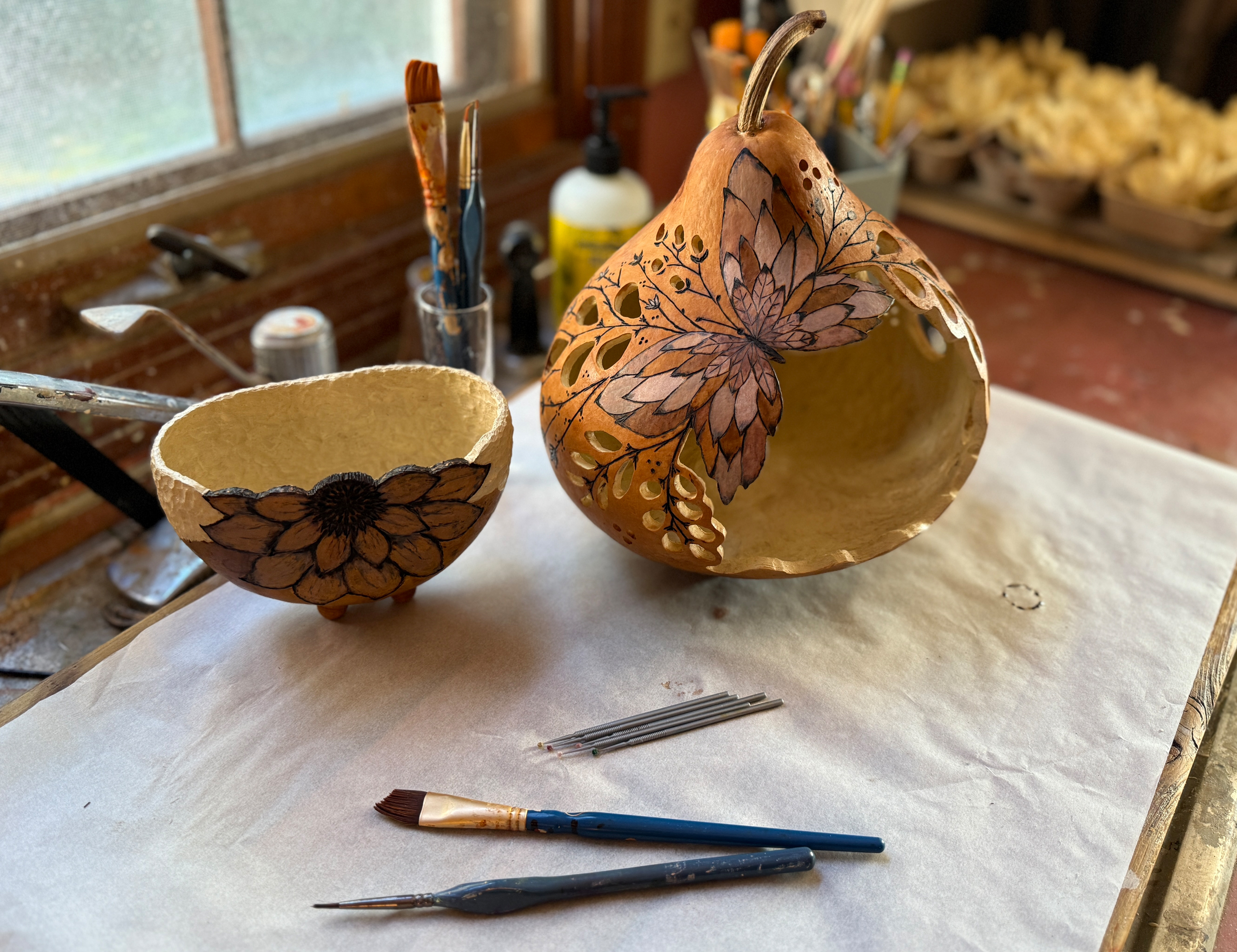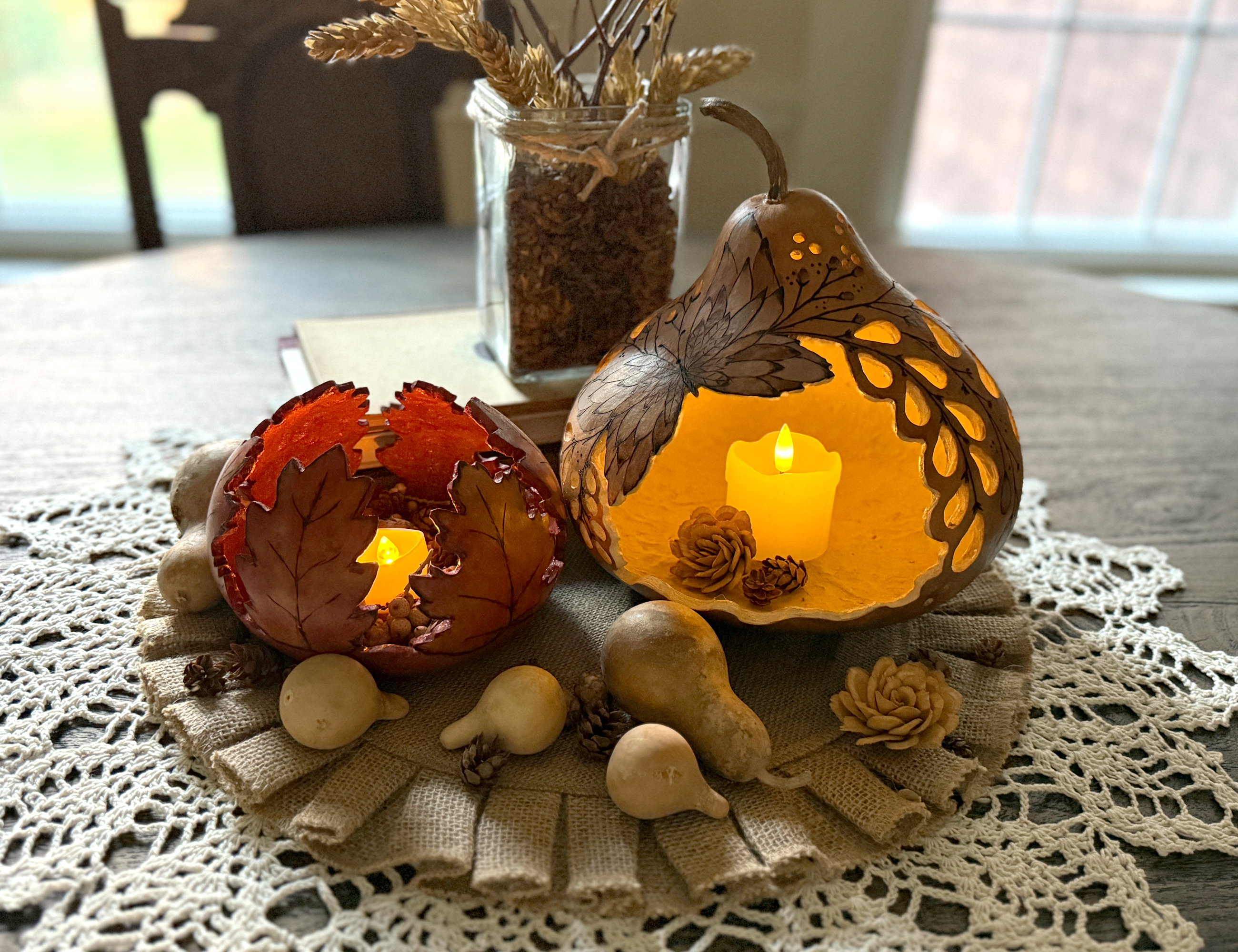 When I discovered the incredibly versatile dried gourds, it was love at first sight! I instantly added them to my creative routine. I've always adored pumpkin carving, and here was a similar natural vegetable that will for many years without the shelf life of a fresh pumpkin. The dried gourd shells are very hard and perfect for carving and pyrography!