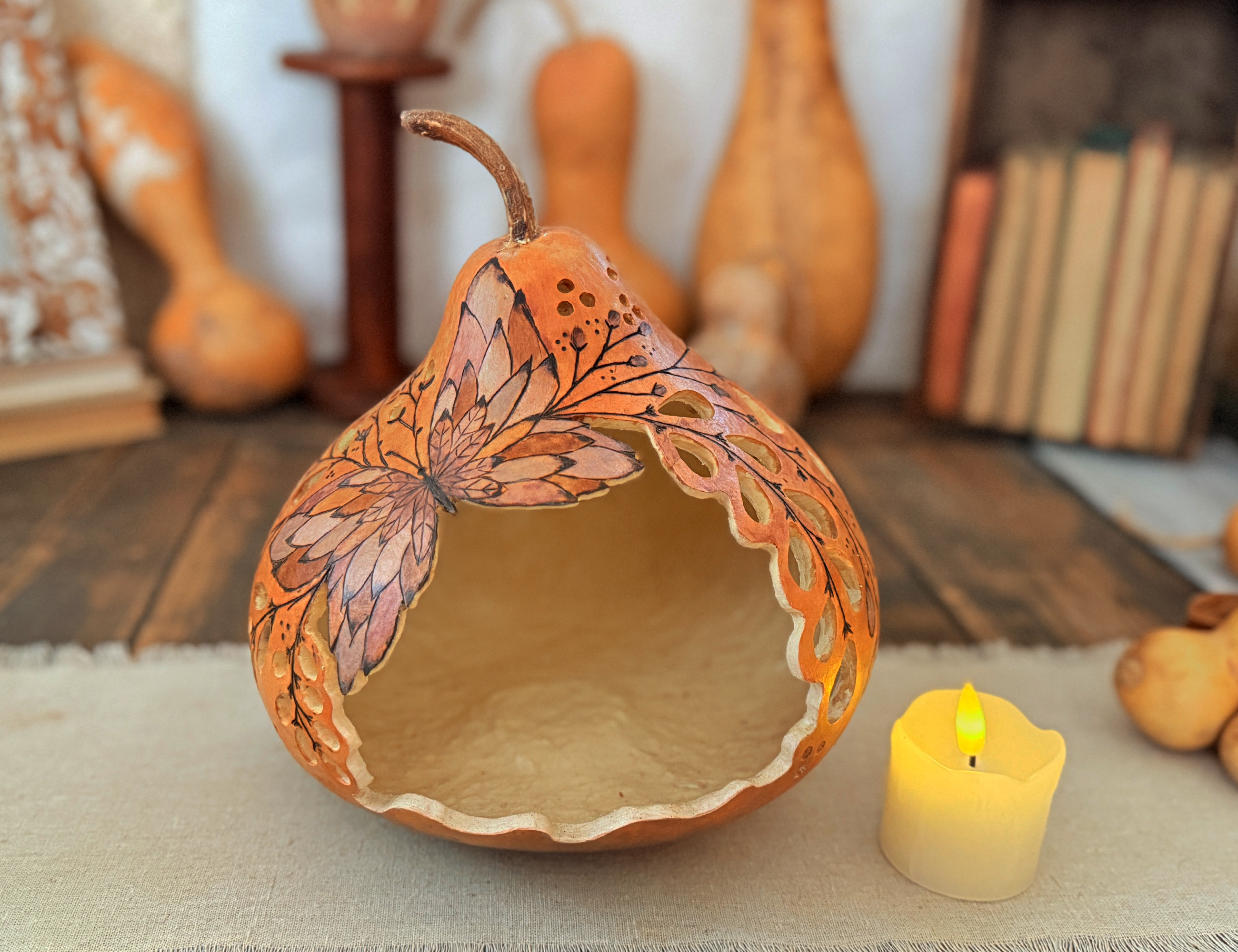Brighten your home with this handcrafted butterfly gourd luminary, a warm and inviting piece of natural home décor made from a real, farm-grown gourd. This unique luminary features hand-carved lacey leaf cutouts and detailed butterfly artwork, allowing the included battery-operated candle to cast a soft, glowing light through the carved openings.