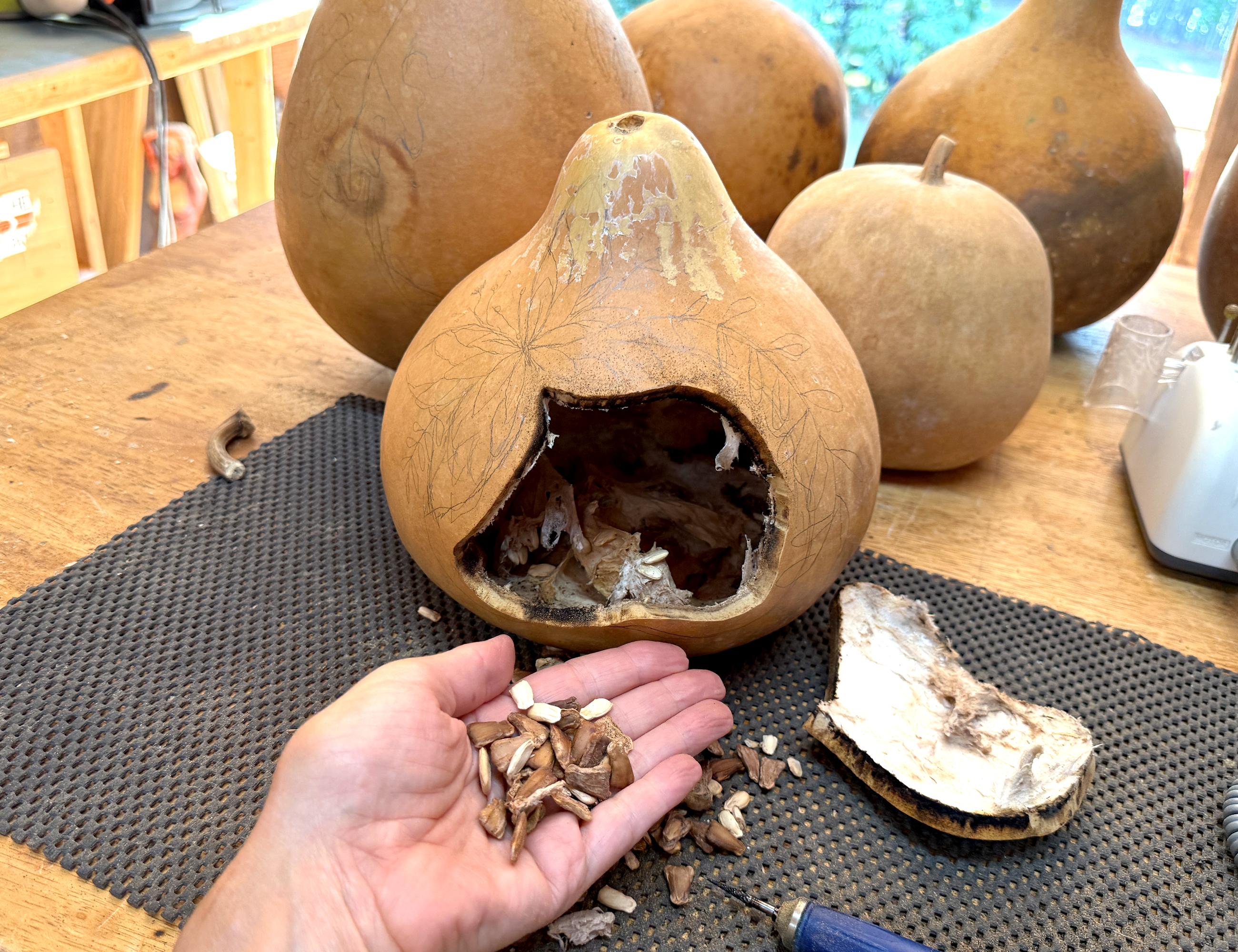 Every luminary begins with a carefully selected dried gourd chosen for its shape and character. The gourd is opened and fully cleaned, removing all dried seeds and inner membrane.