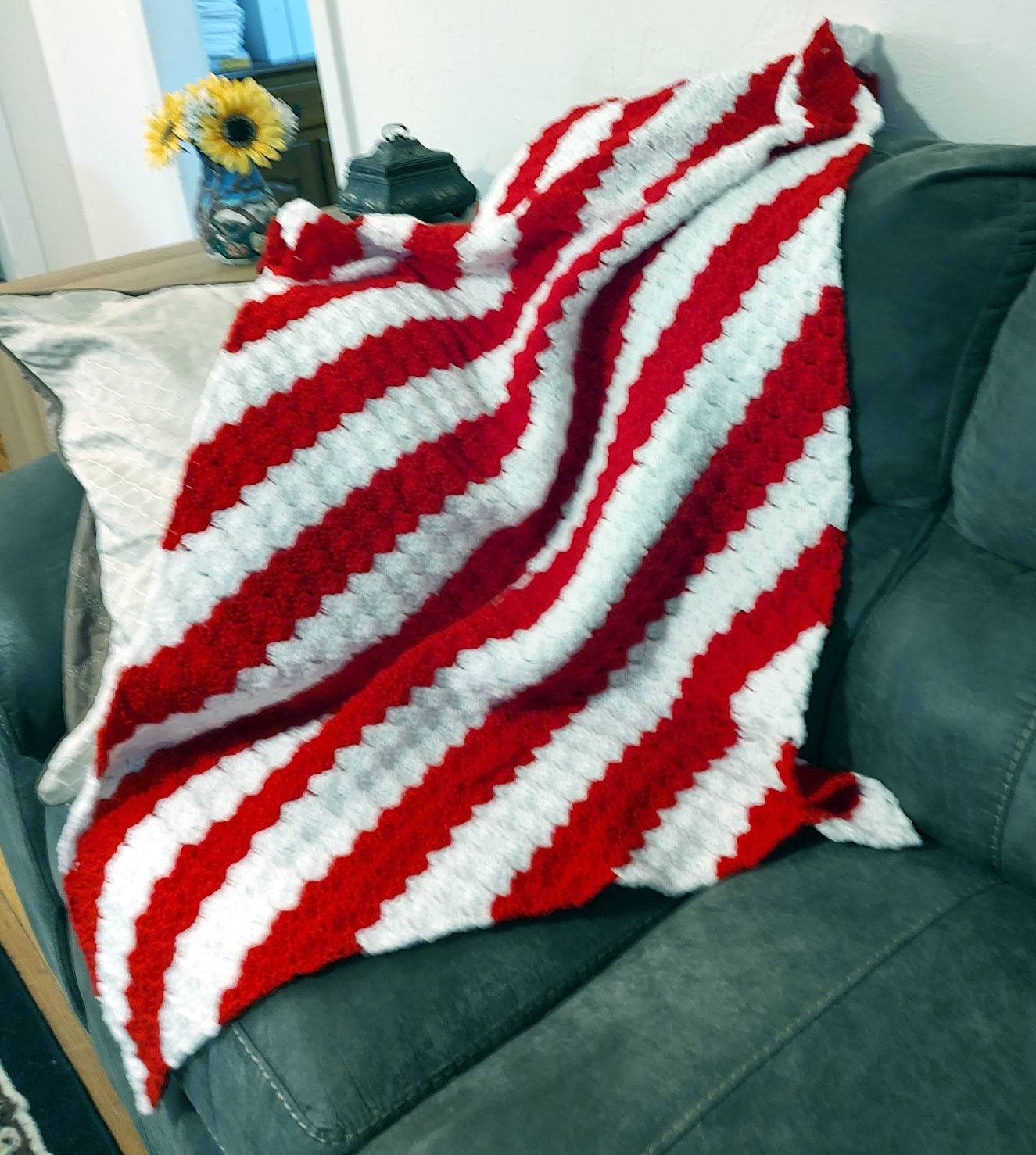 Striking cardinal red and bright white make this gorgeous candy-cane styled, hand-stitched afghan a bright accent for any room, at Christmas and any time of year, and the warmth of this personal-sized blanket will come in handy on any chilly winter night.