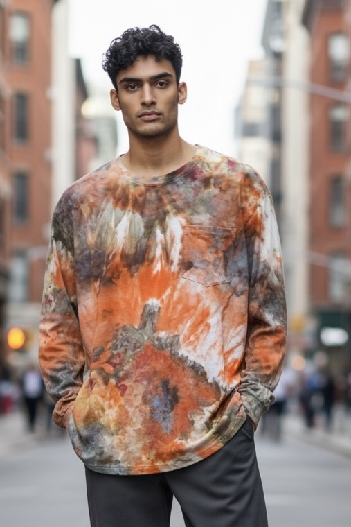Enjoy the comfort of an ice-dyed long-sleeved shirt in multiple colors of orange, mist grey, amber, bronze and more. The ice dyeing process causes the dyes to separate, so many unplanned colors emerge to create one-of-a-kind patterns.