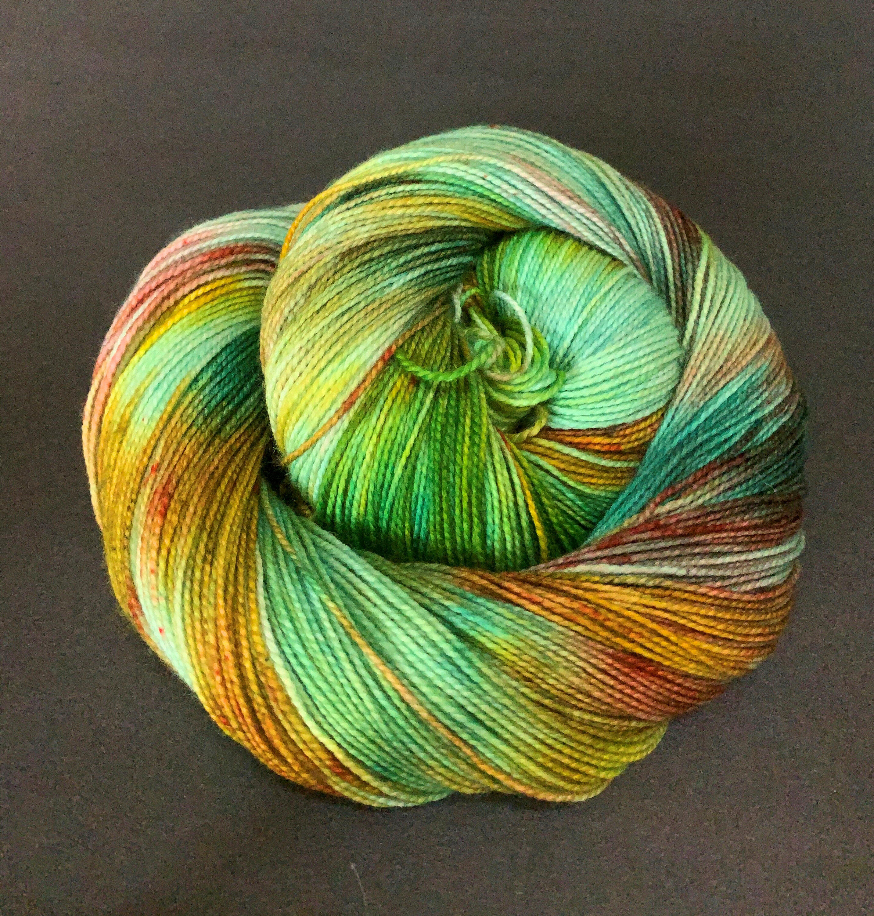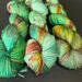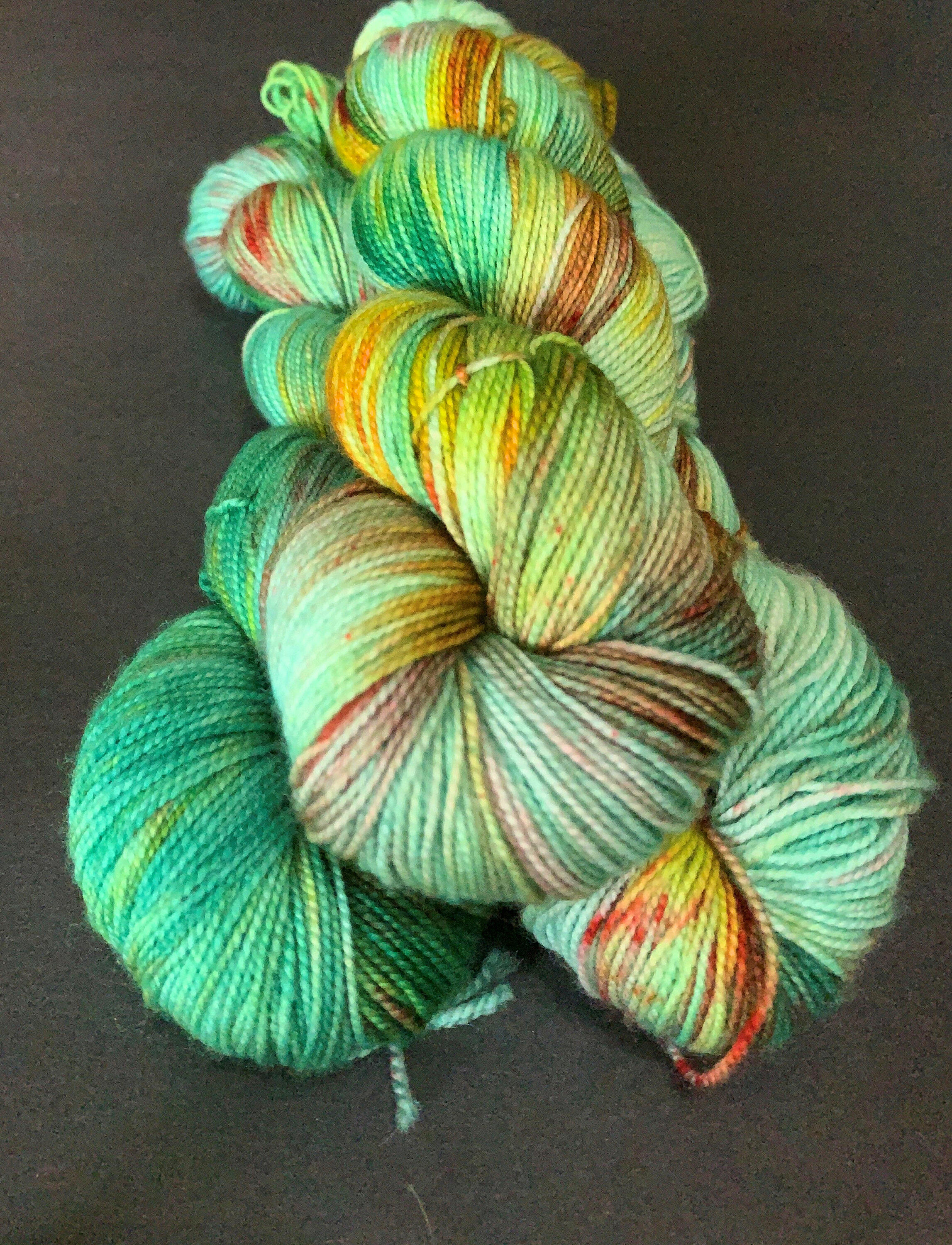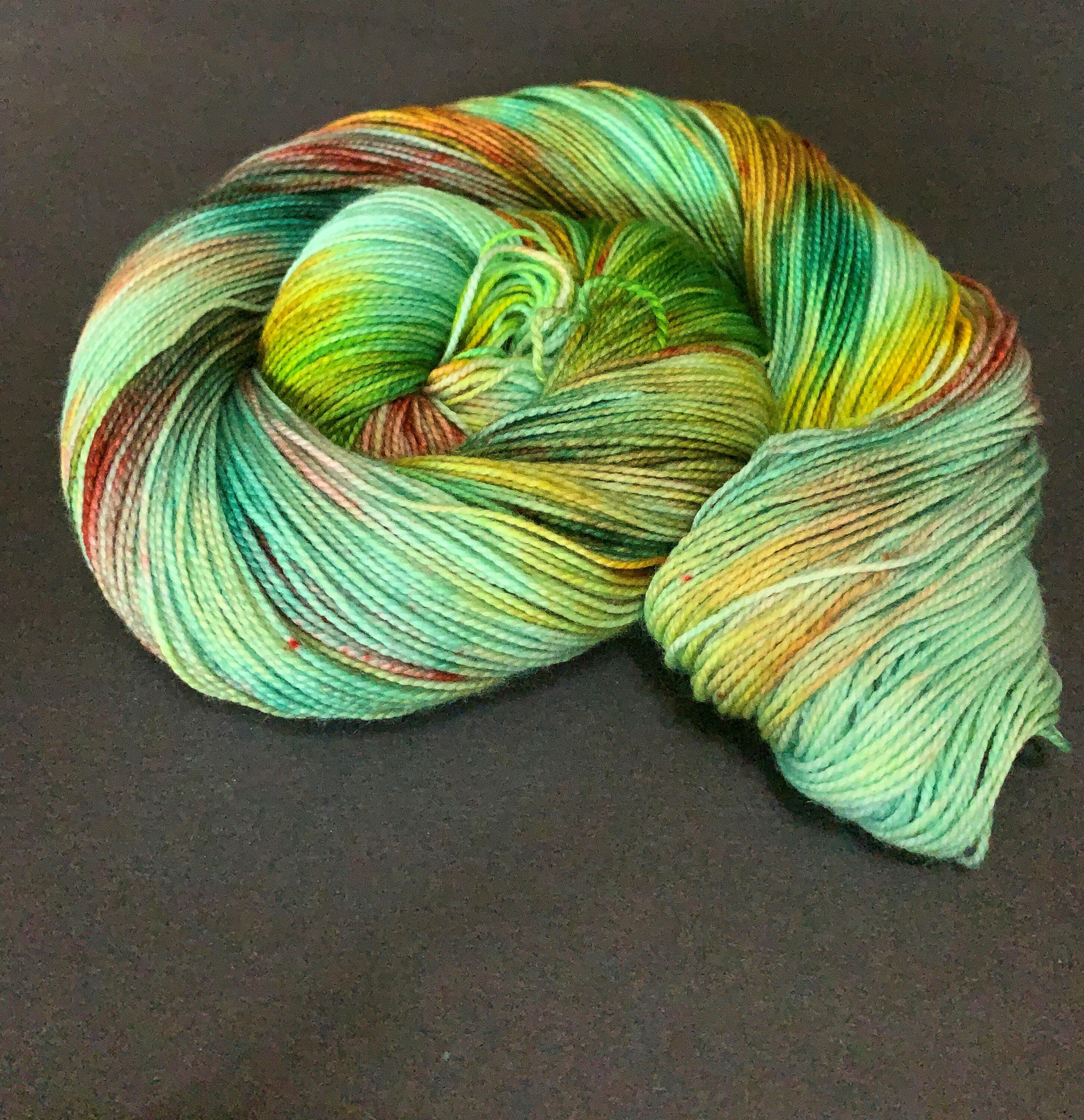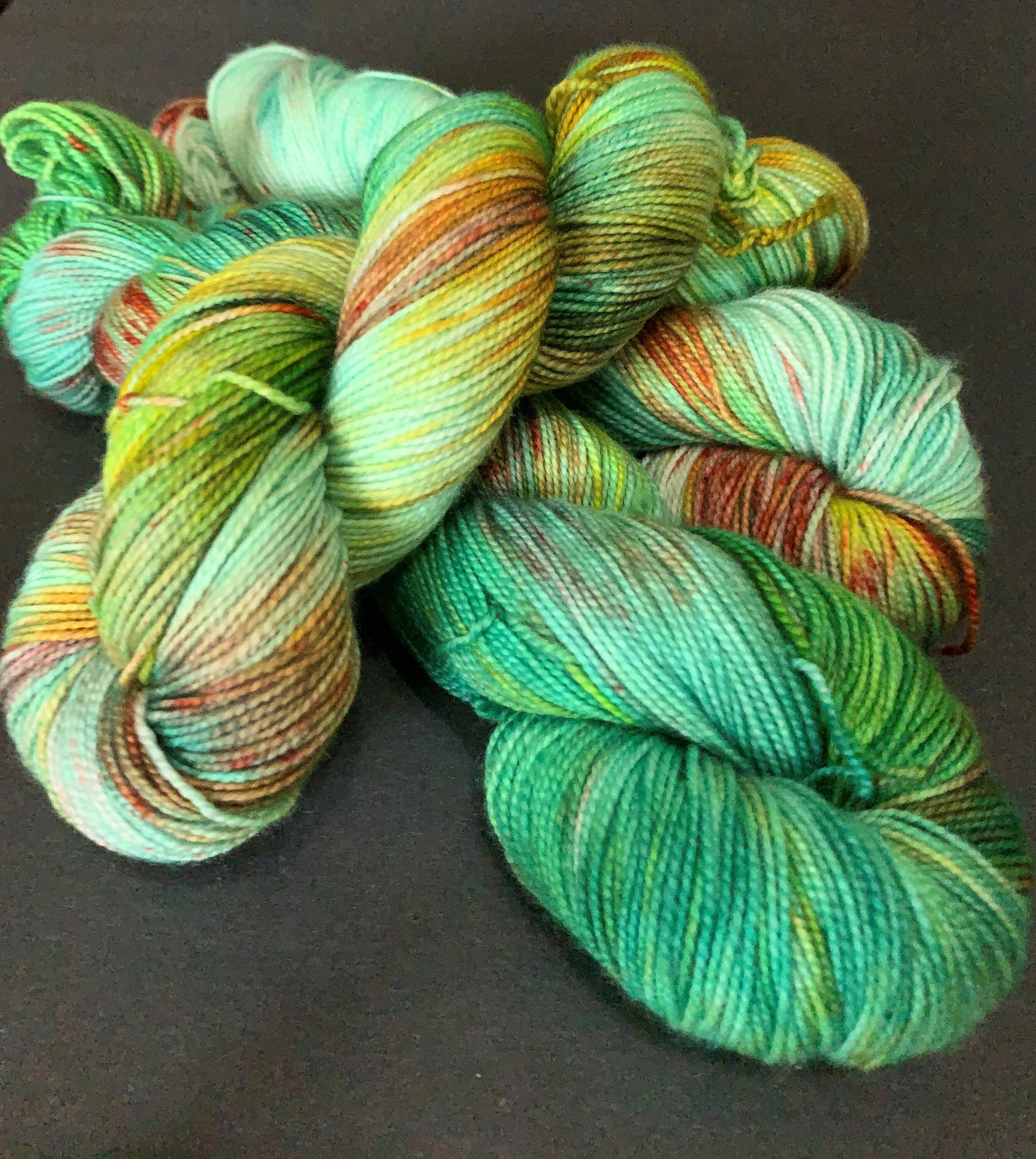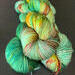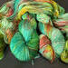 SEASIDE RENDEZVOUS - This 80% merino/20% nylon sock yarn is a lovely variegated green, with splashes of red, blue and yellow.