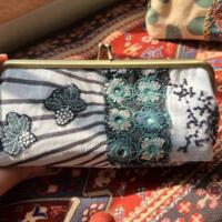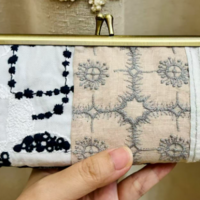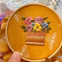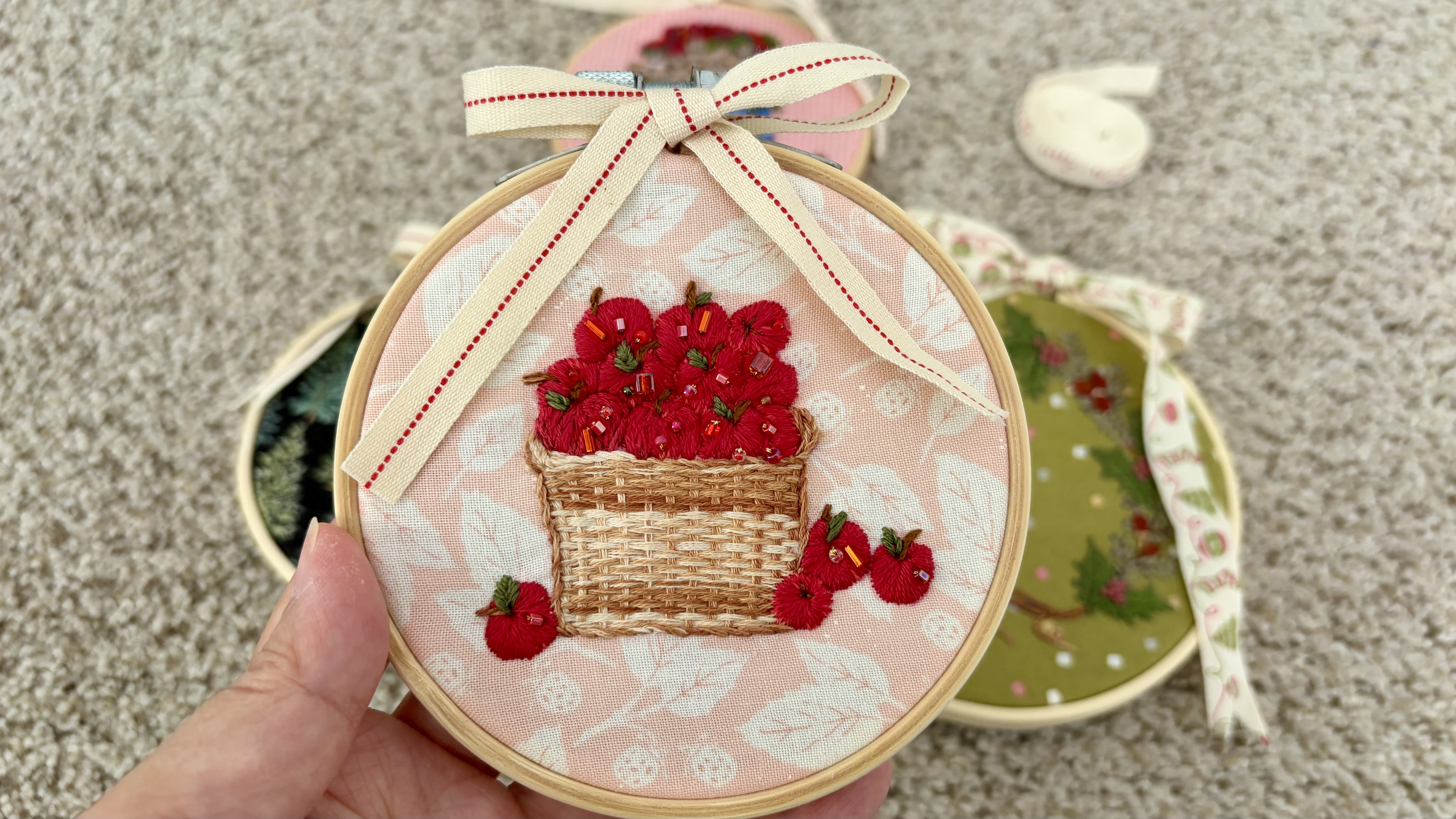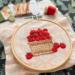 This is a piece of hand-stitched embroidery depicting a basket of apples. As it is the harvest season now, the bright red apples symbolize abundance and joy. This embroidery required considerable time and effort to complete, and the background fabric is from Moda. Some beads of varying sizes are also sewn onto it—don’t you think it looks lovely?