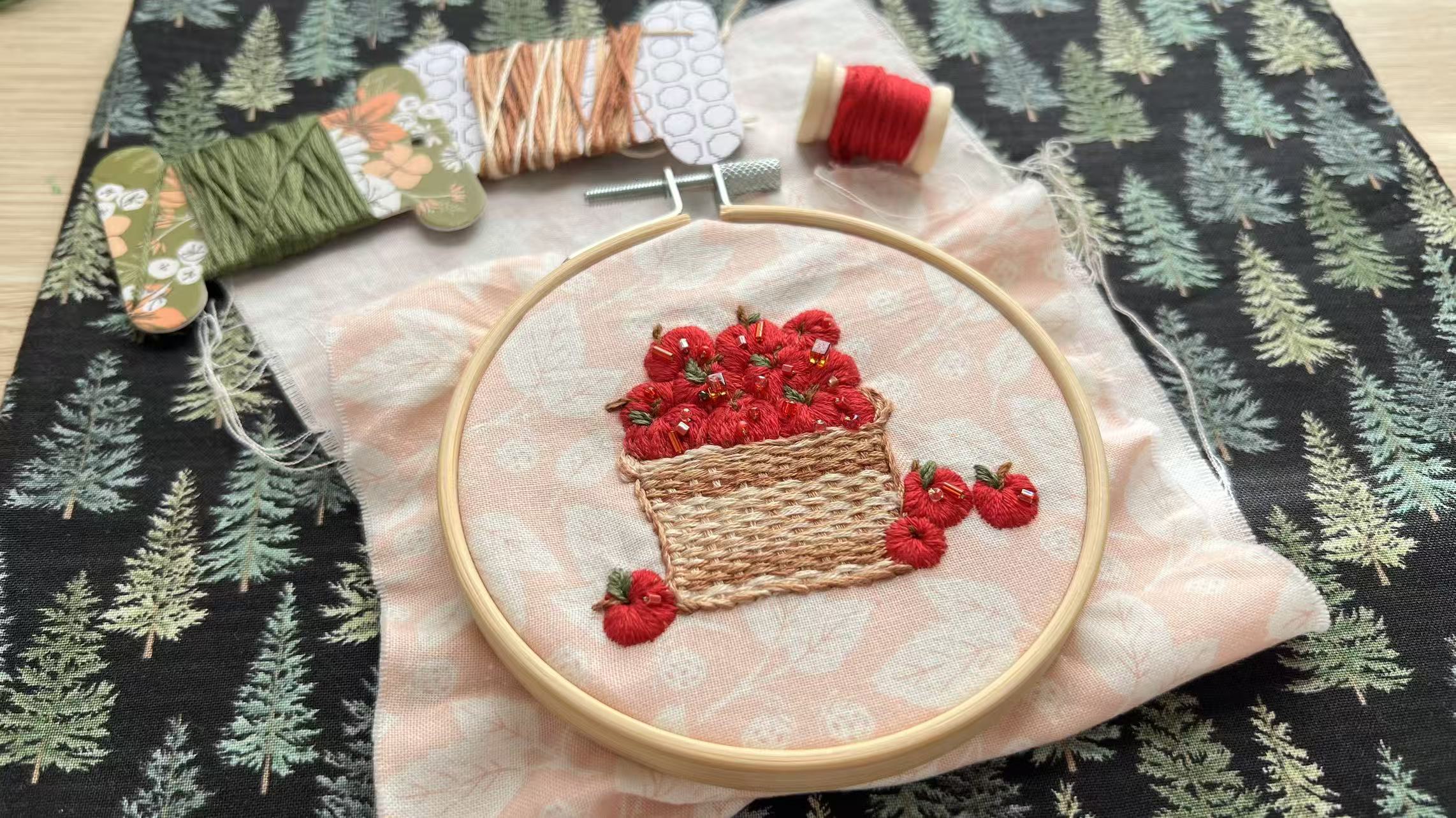 For the basket , I used gradient threads. On the apples, I sewed beads of various sizes and shapes, which added a playful and cute touch to the once monotonous design.I like autumn, and the large baskets of apples symbolize the joy of harvest.I especially love apple bushels and even have a beautiful vintage sewing bushel basket.