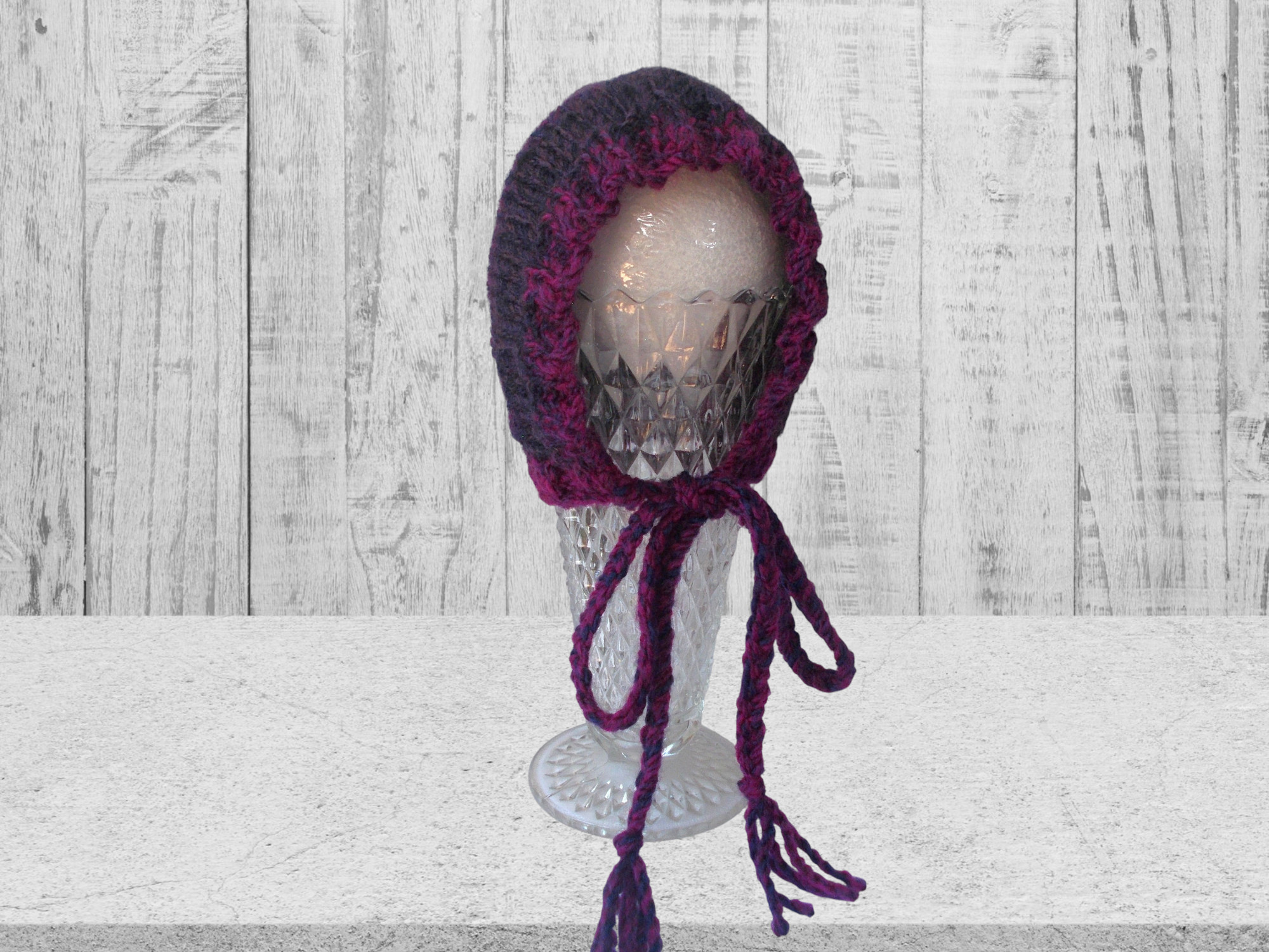 Knit in a heavier weight yarn with colors of violet, purple and raspberry – Ties are 15” long including tassels