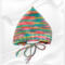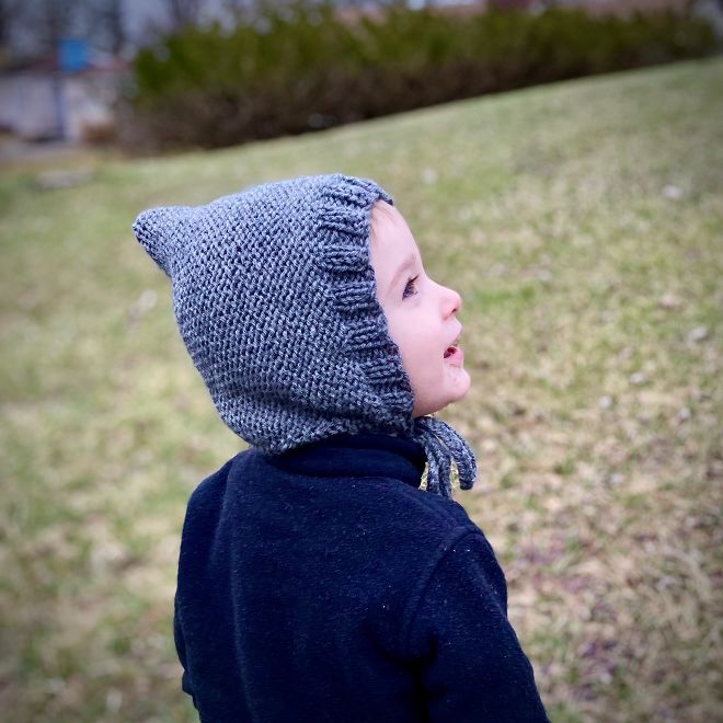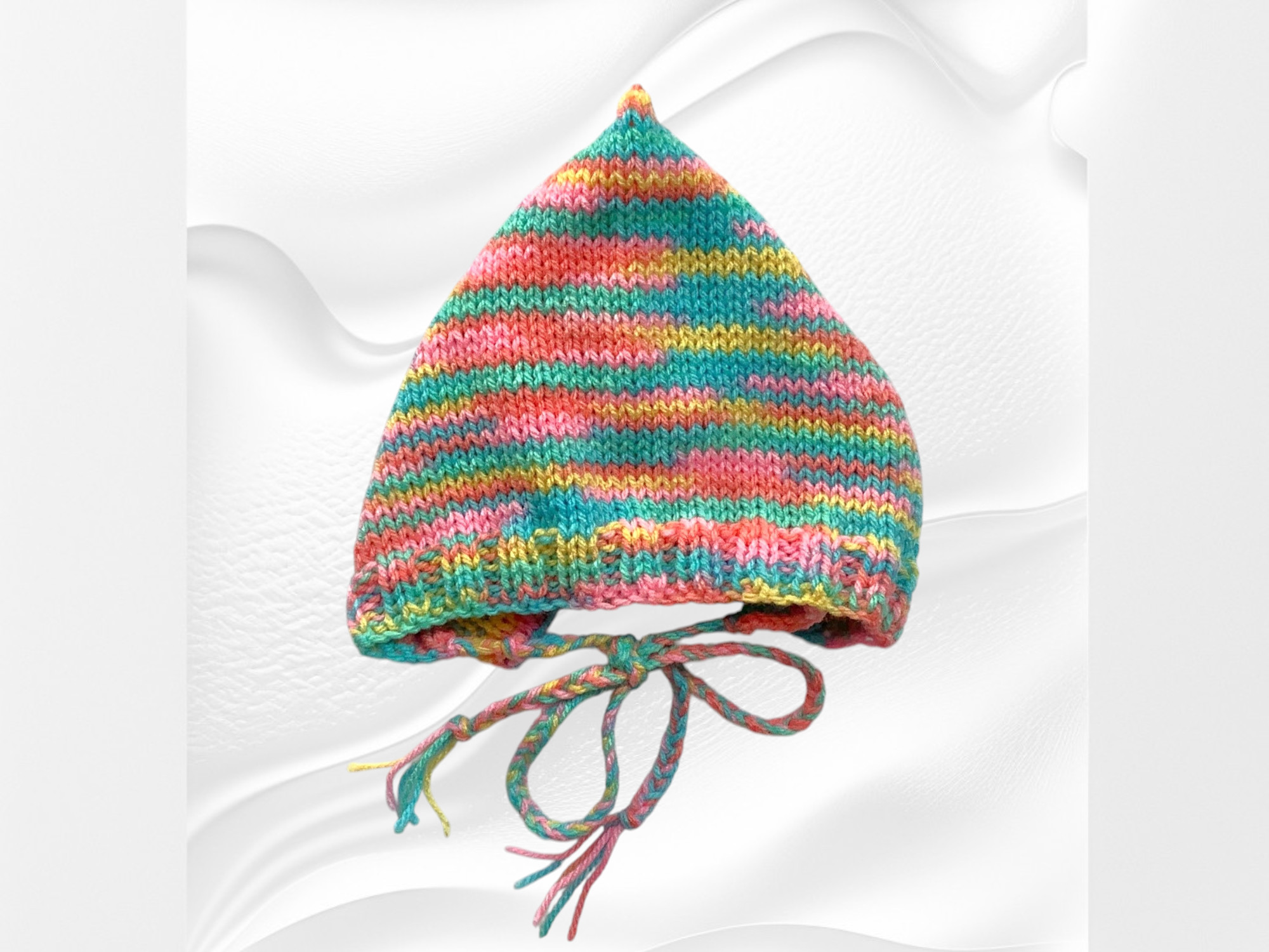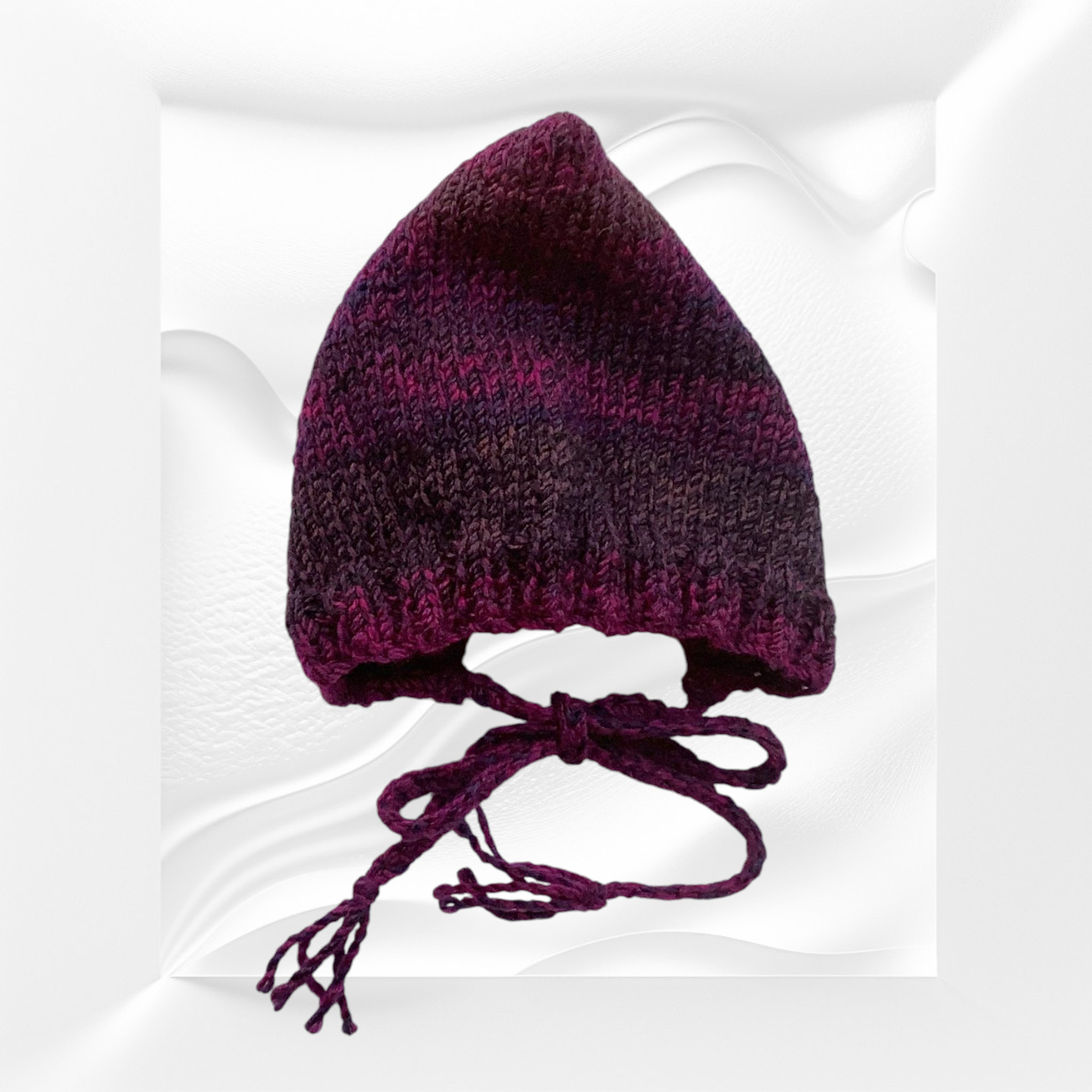This pixie hat has an adorable point at the back, a ribbed border to frame the face and is curved in at the neckline. It has braided ties with a small tassel at the ends