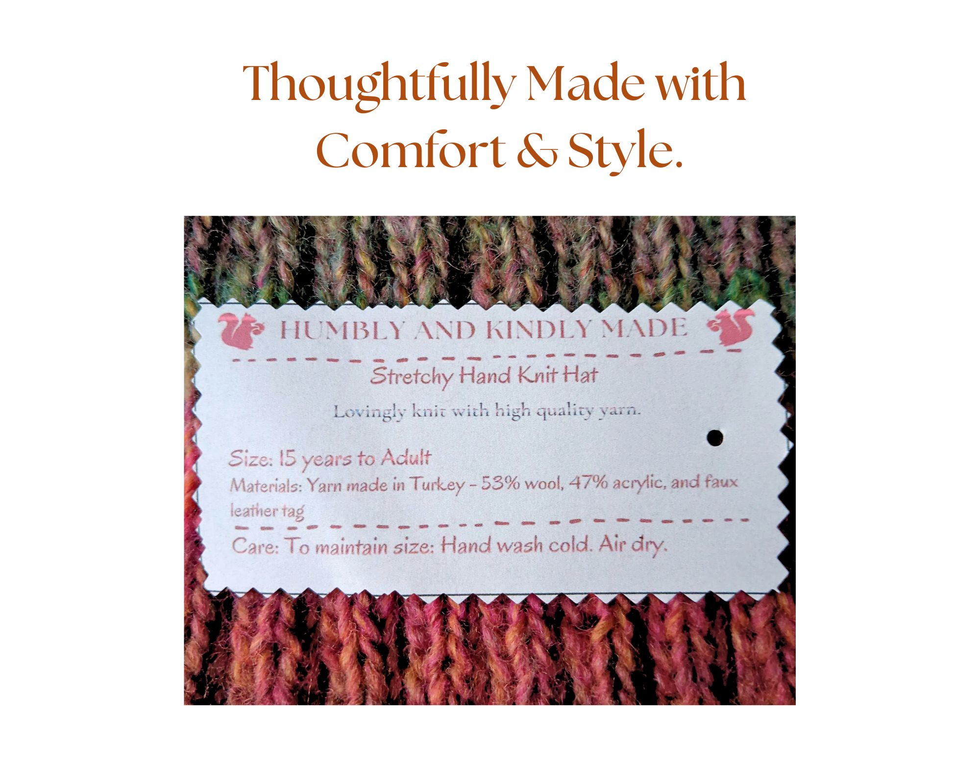 Each stitch is thoughtfully knit with a wool acrylic blend yarn that’s soft to the touch, warm without being itchy, and flexible enough to fit most teens and adults.