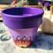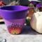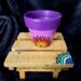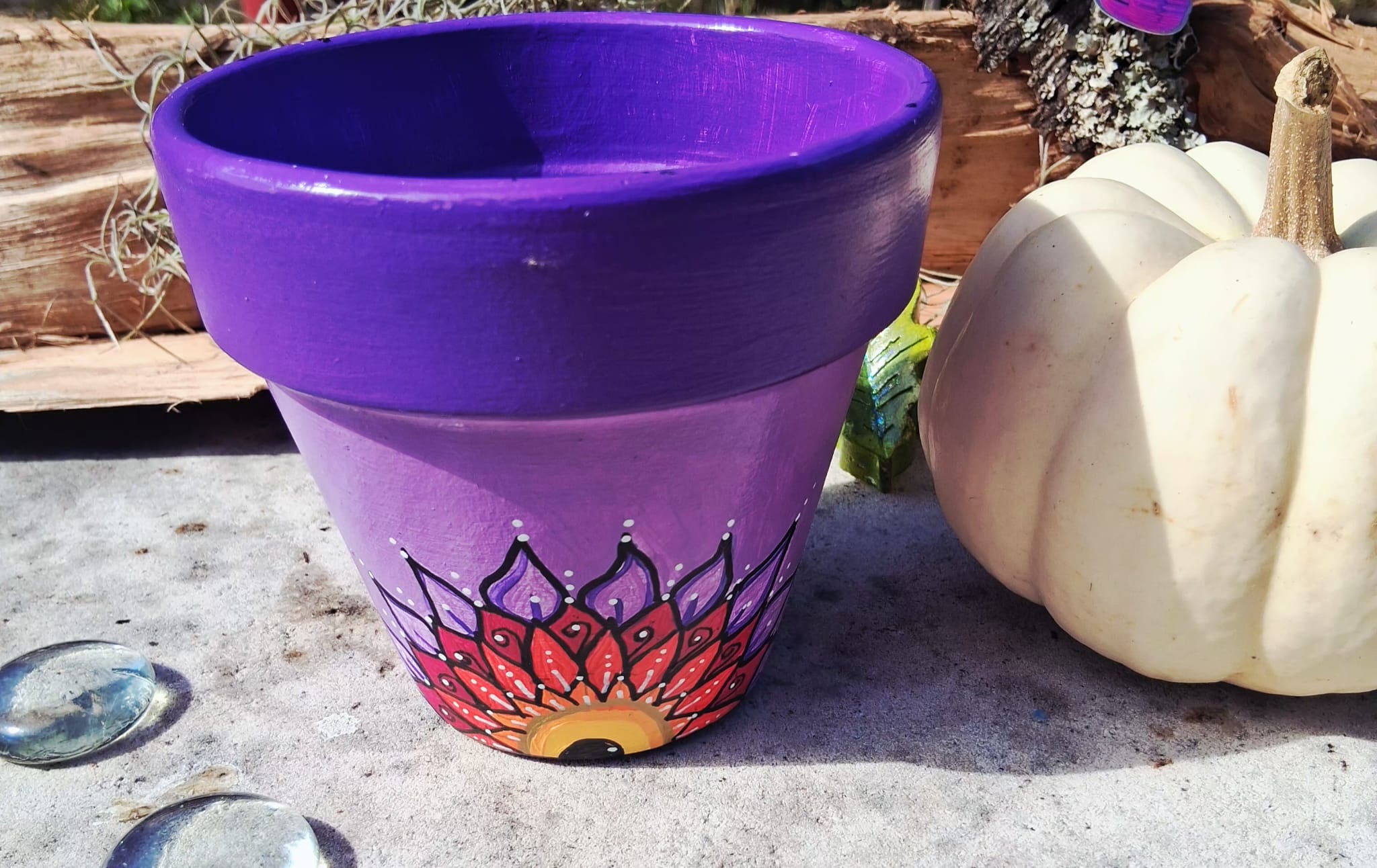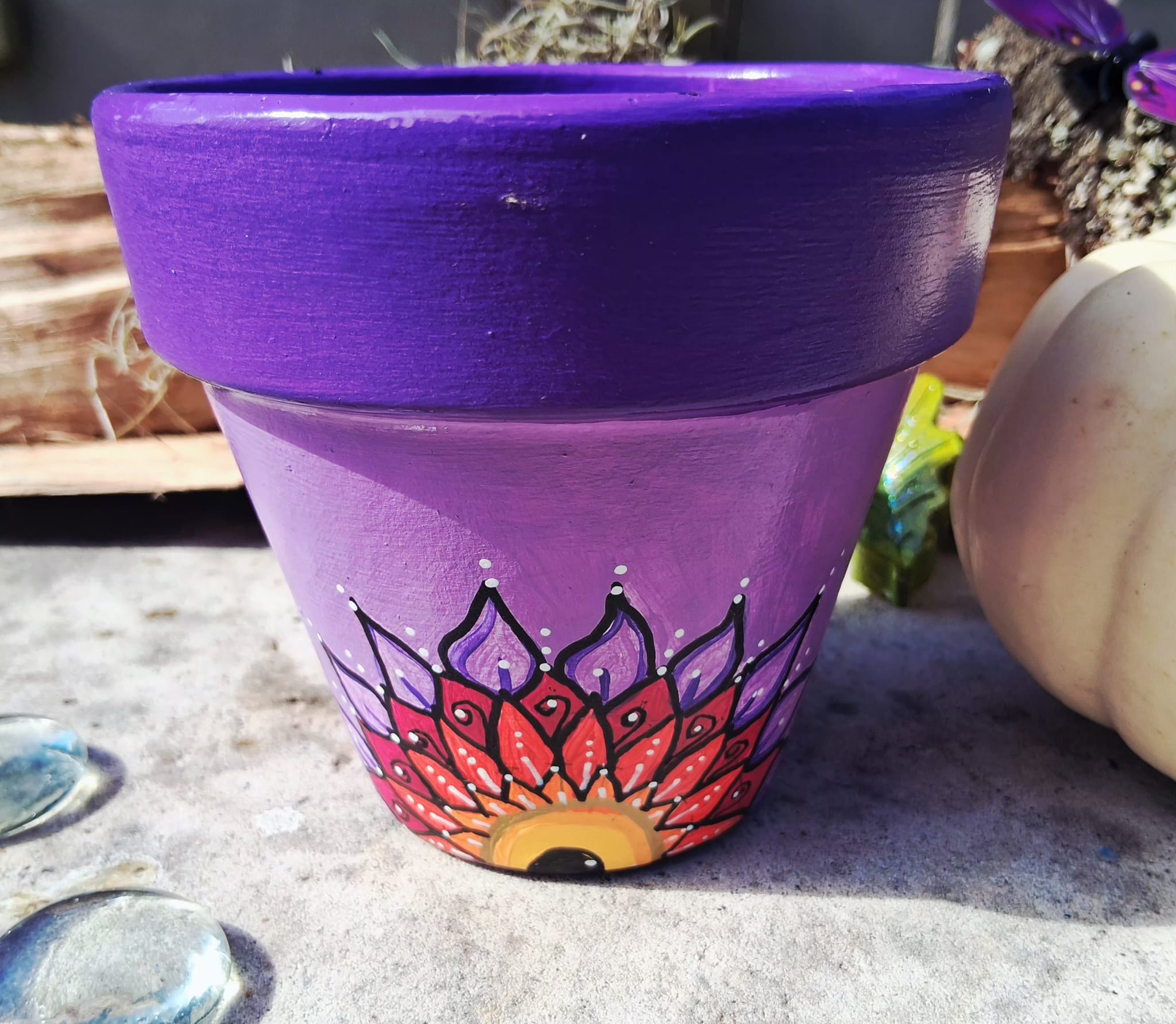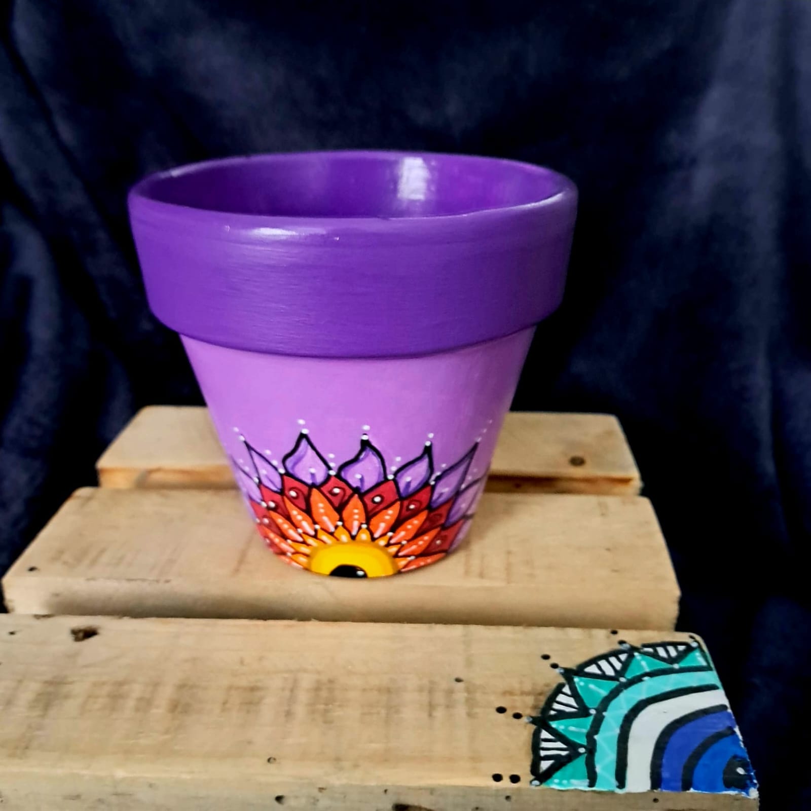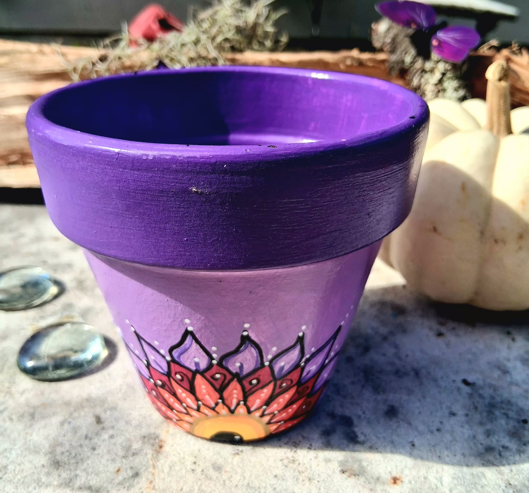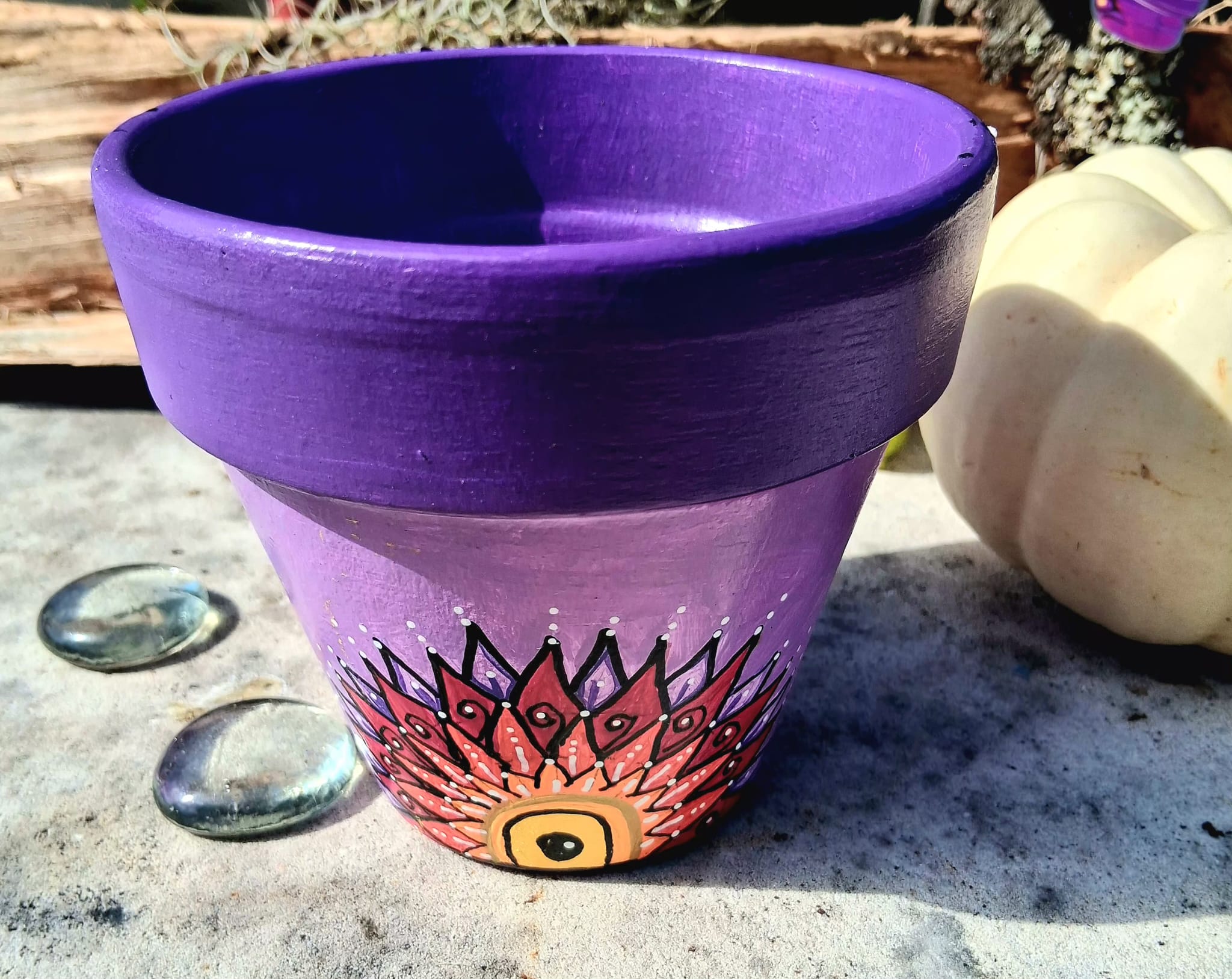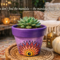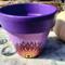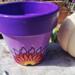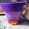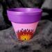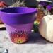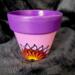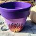 This pot features a vibrant purple and soft pink background, hand-painted with an original mandala-inspired floral design in warm tones of red, orange, yellow, and black. At the center of the design is a symbolic focal point that represents growth, awareness, and balance.