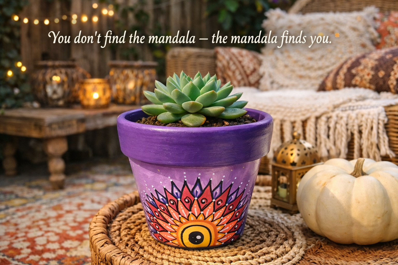 Our collection features hand-painted handbags, candles, hats, planters, and decorative home accents, each adorned with original mandala designs. These creations are more than decorative objects—they are functional pieces of art designed to bring warmth, personality, and soulful expression into everyday life.