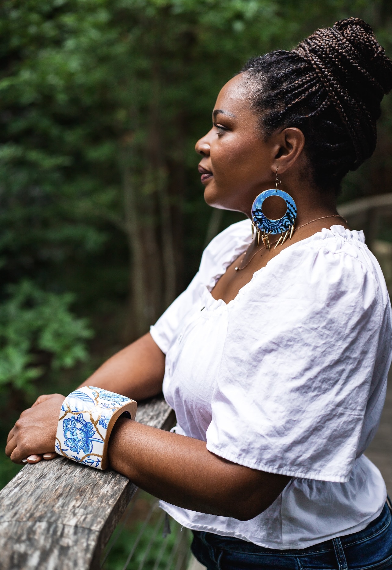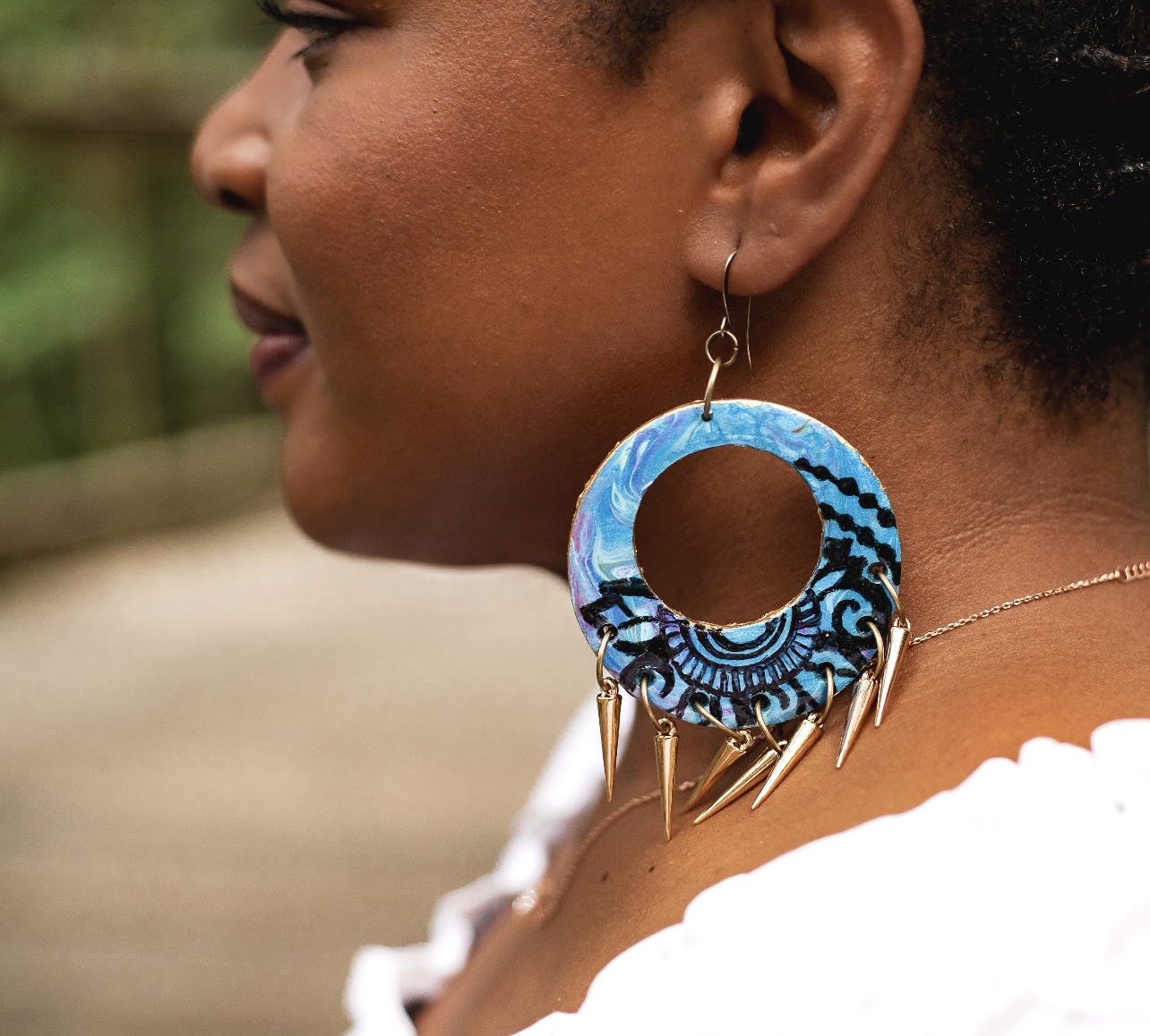 This unique pair of wooden earrings is truly one of a kind! When painting these hoops, I drew inspiration from mehendi patterns , as well as my love for the paint pouring technique. If you love statement jewelry, then these are the earrings for you!