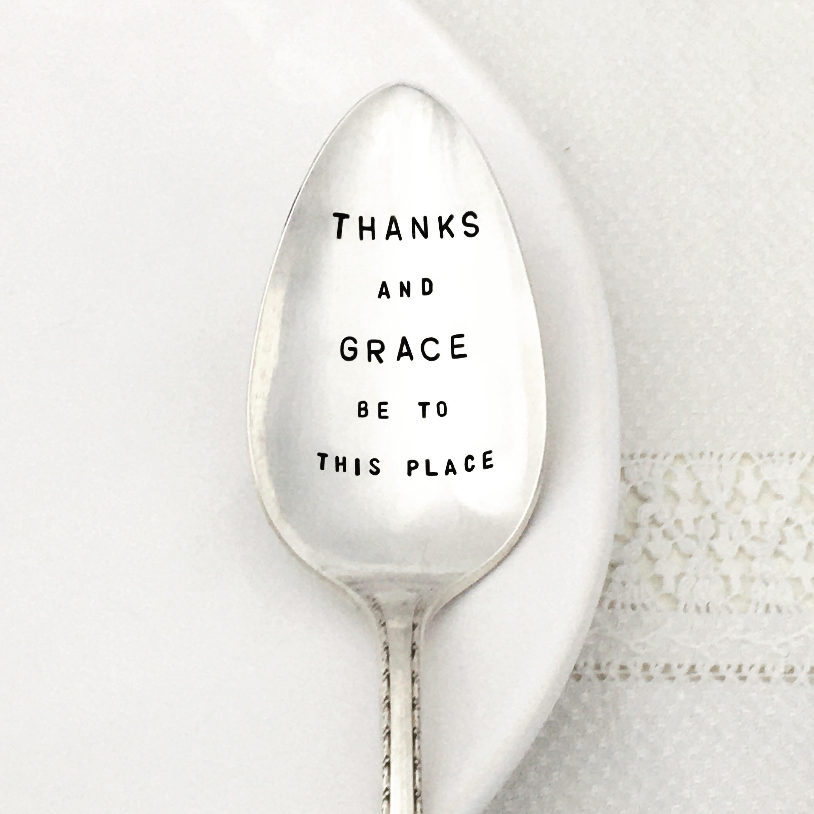 Add a little grace to each and every meal with this hand stamped silver serving spoon. A perfect hostess or housewarming gift - or a lovely treat for your own family table. This antique silver serving piece is hand stamped with the sentiment .. Thanks and Grace be to this place.