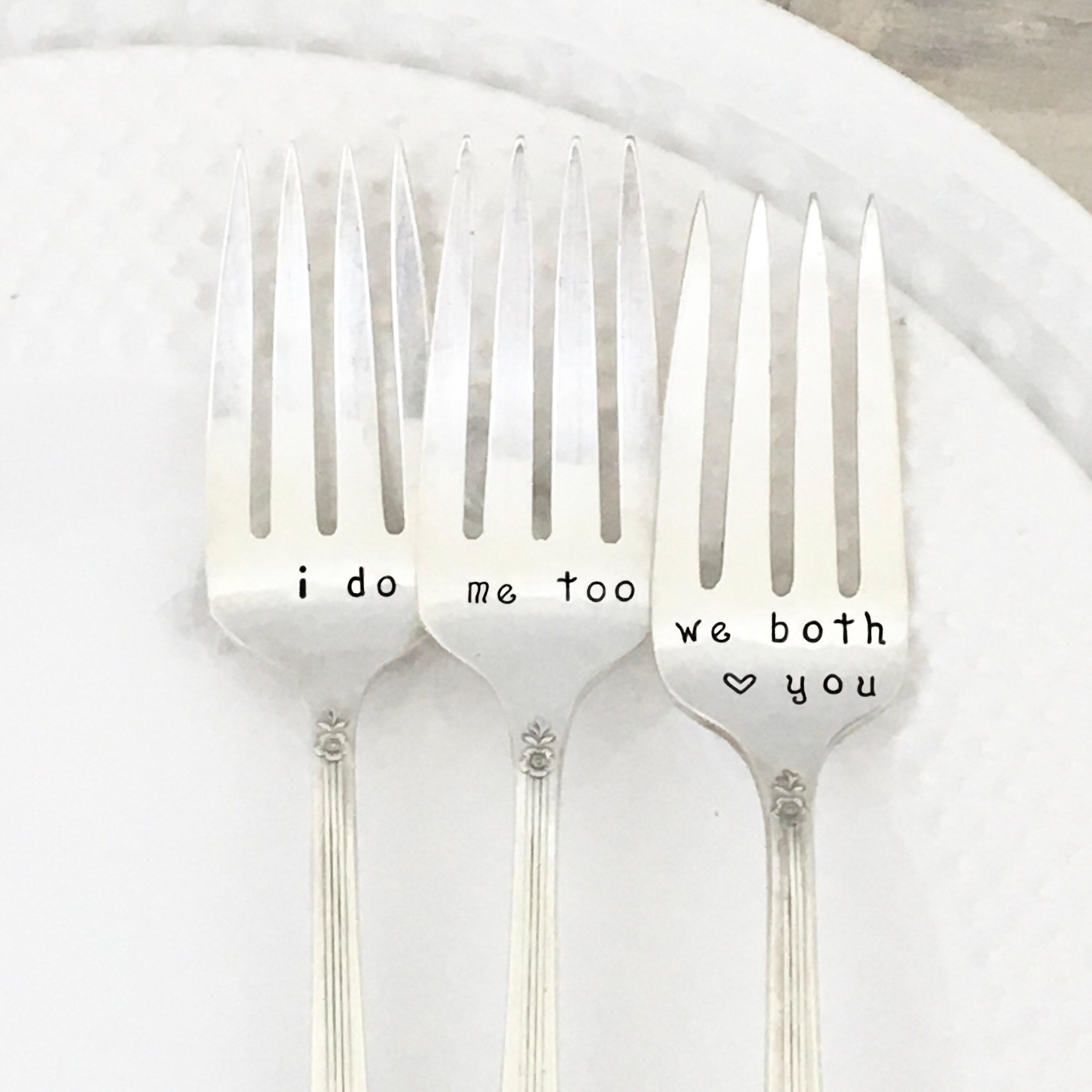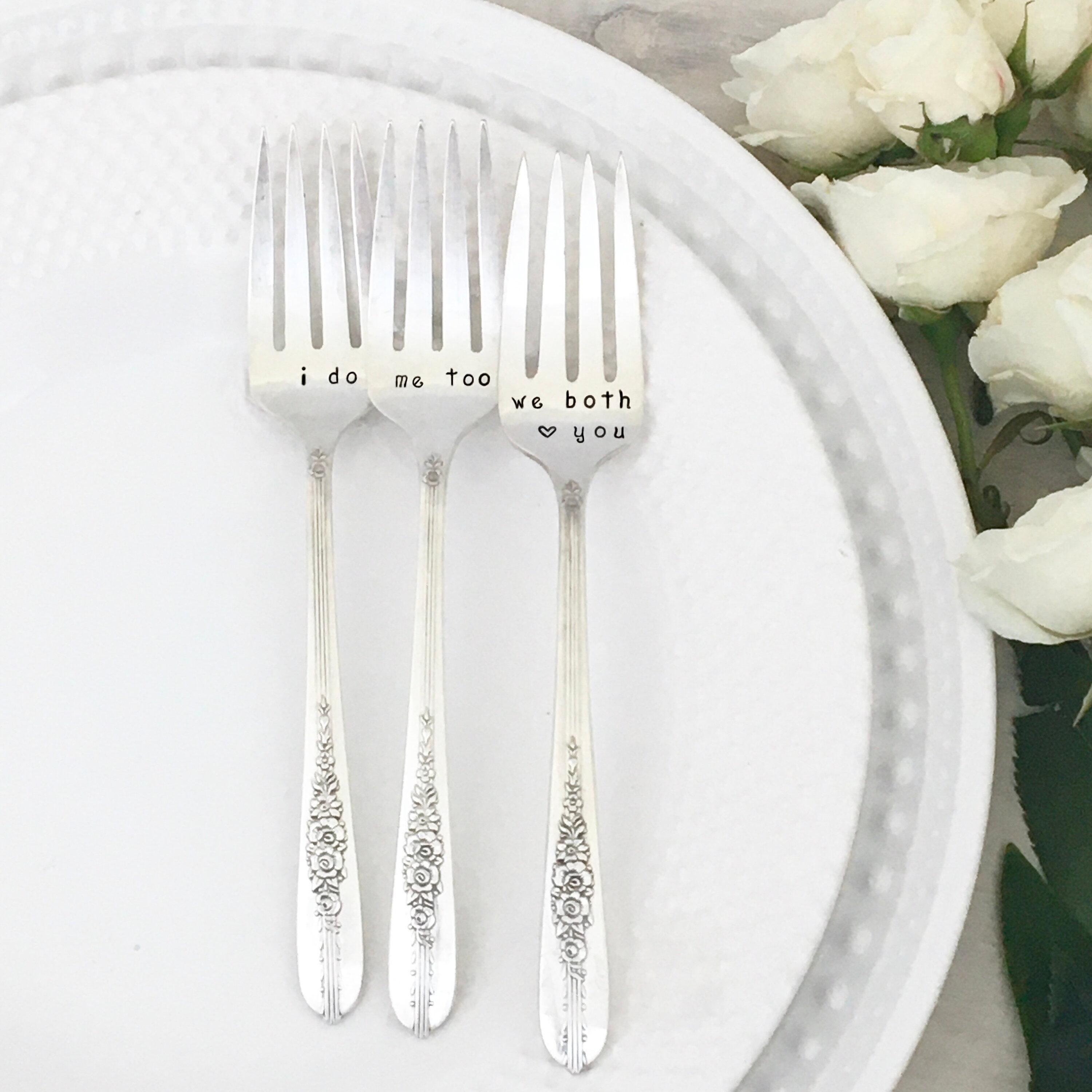Because sometimes a wedding doesn't just join two people, it creates a family - and what better way to include children than with cake! Each set of forks will include a pair of "i do" and "me too" forks - you can then choose from the drop down menu how many "we both love you" forks to be included with your order. All the forks in the set will match (unless you request differently) but the silver pattern may vary from the examples shown.