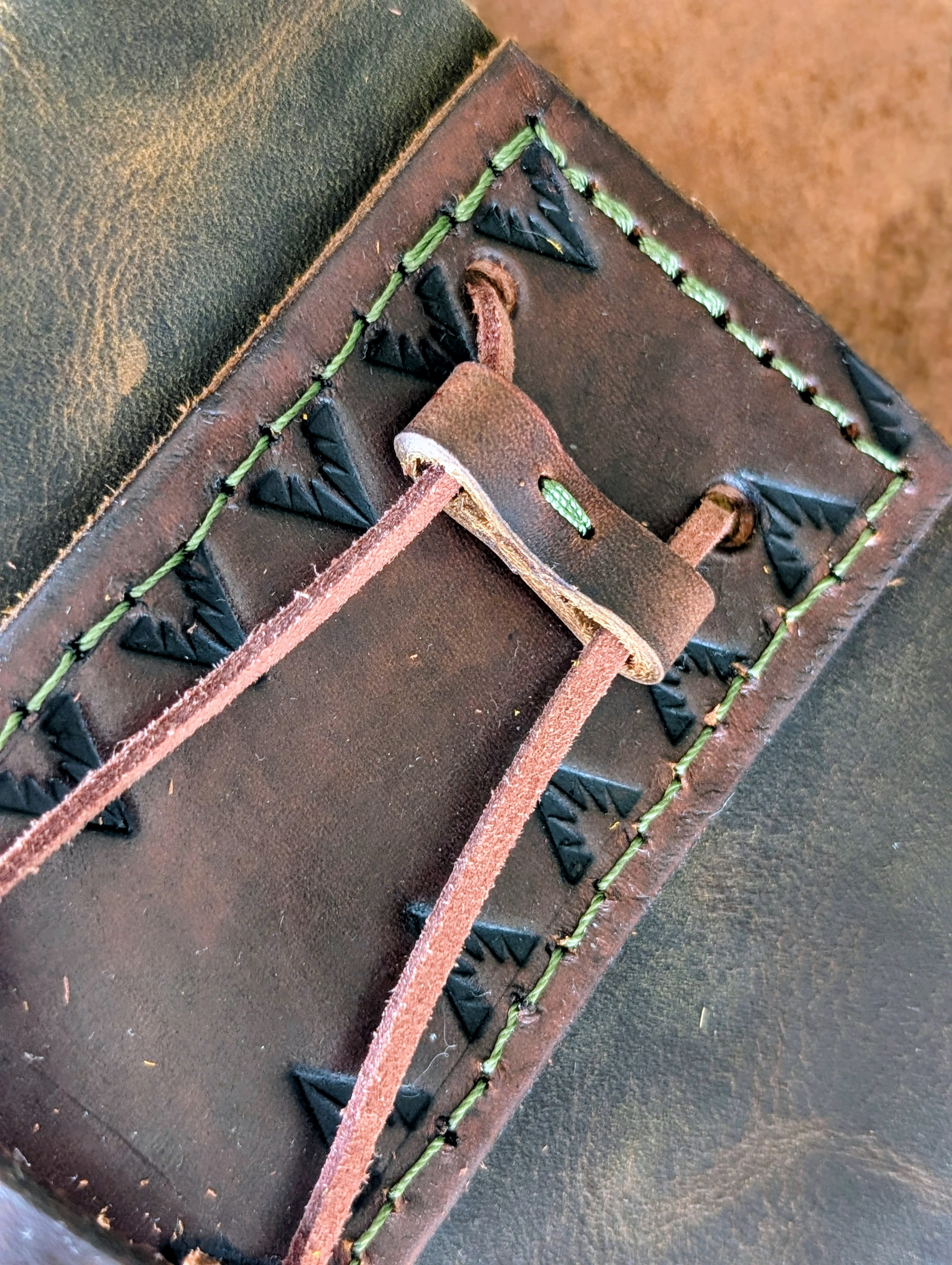 100% hand cut, carved, painted, dyed and sewn from natural veg tan and oil tan leather.