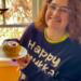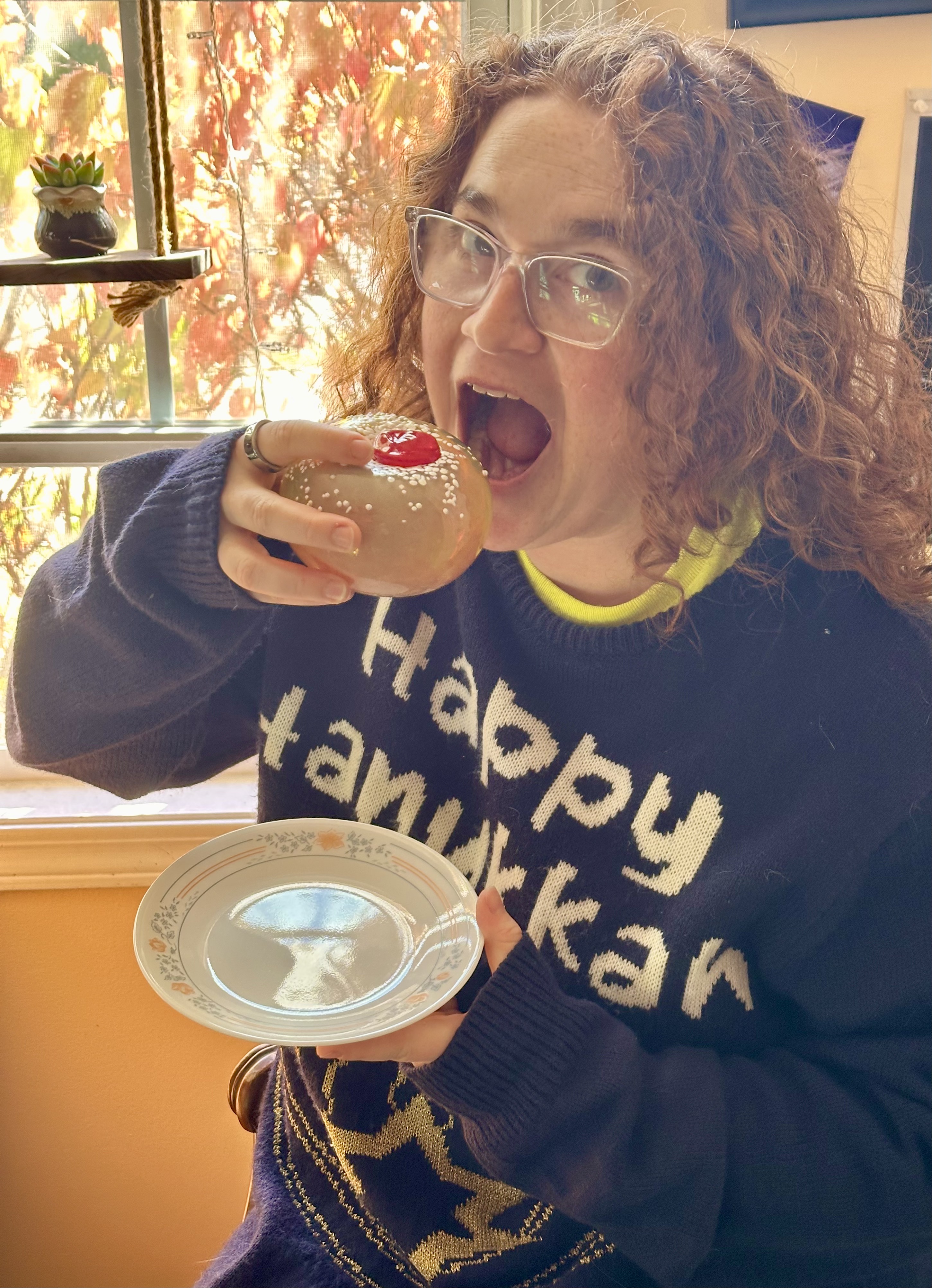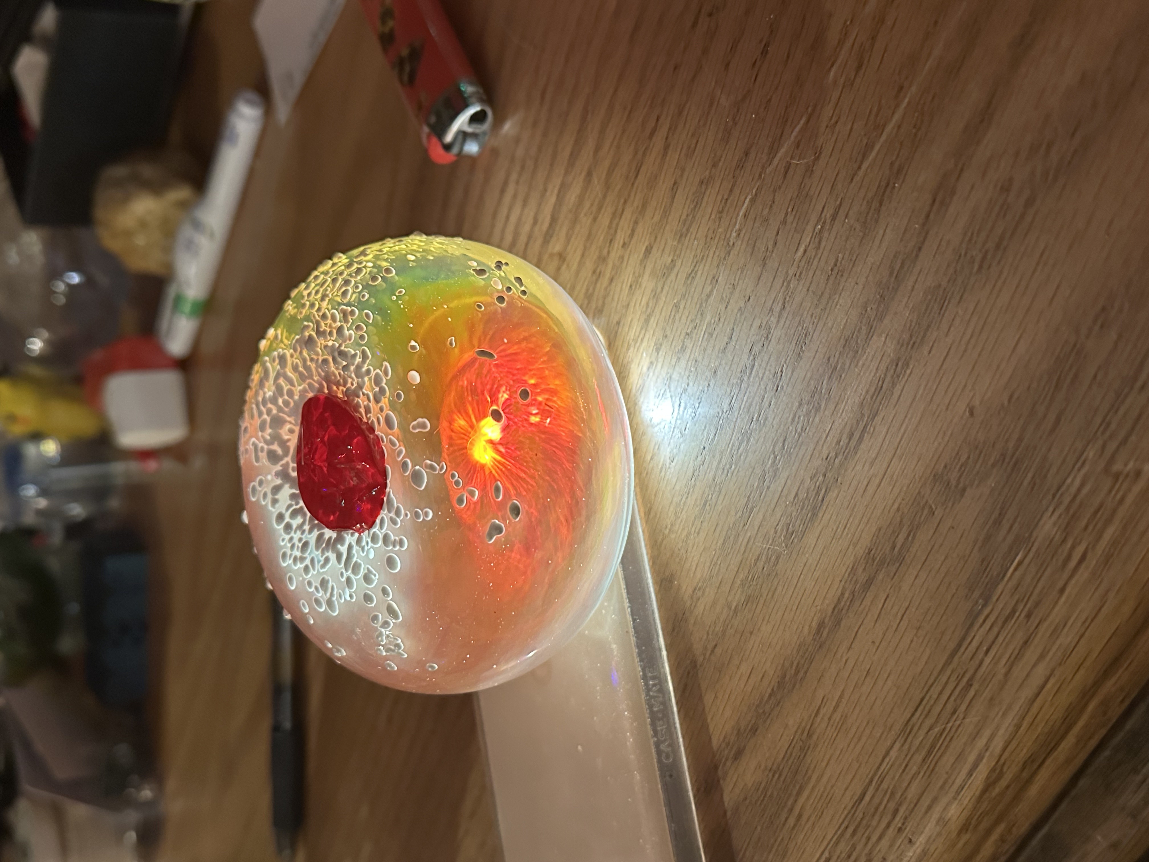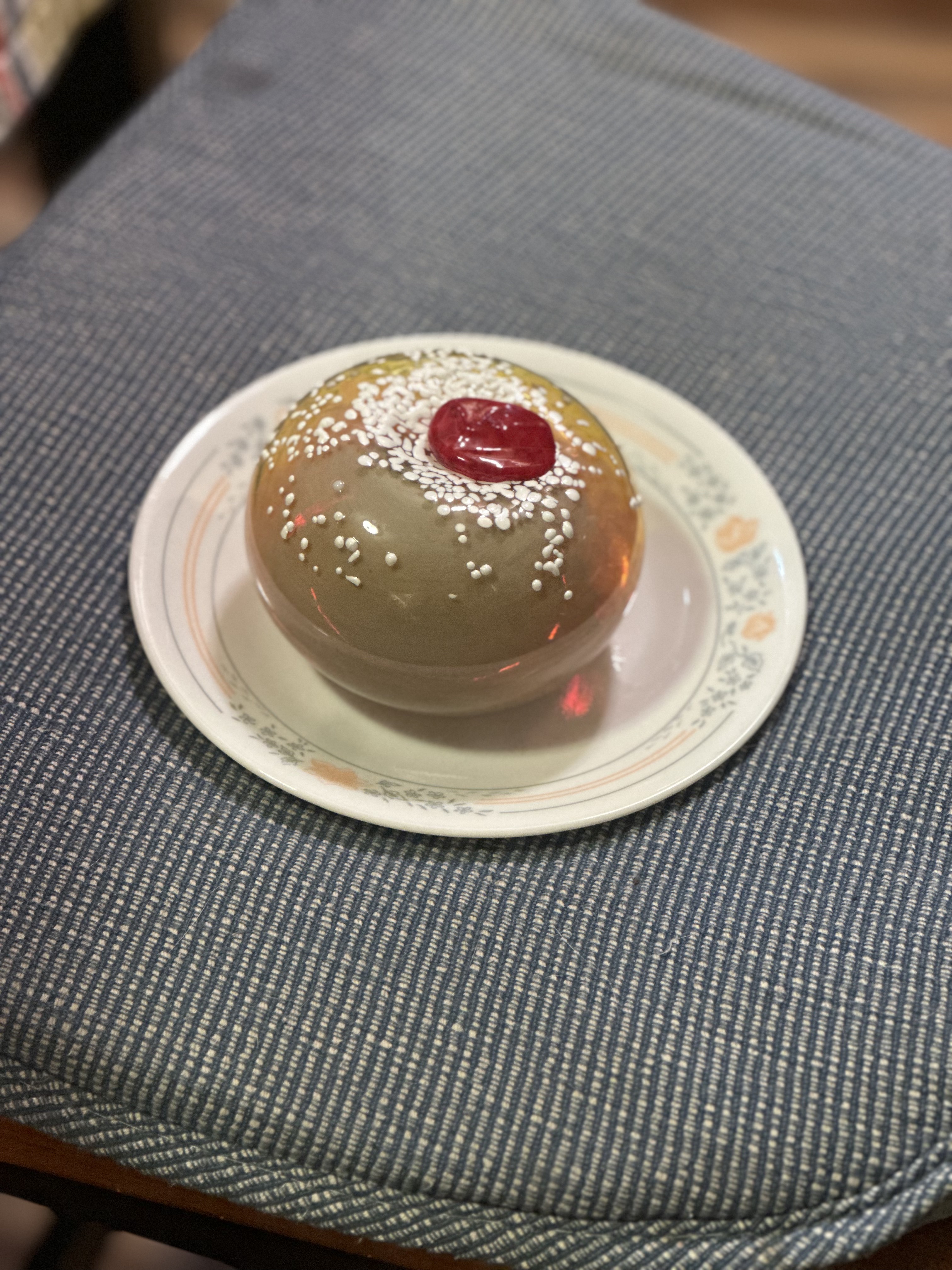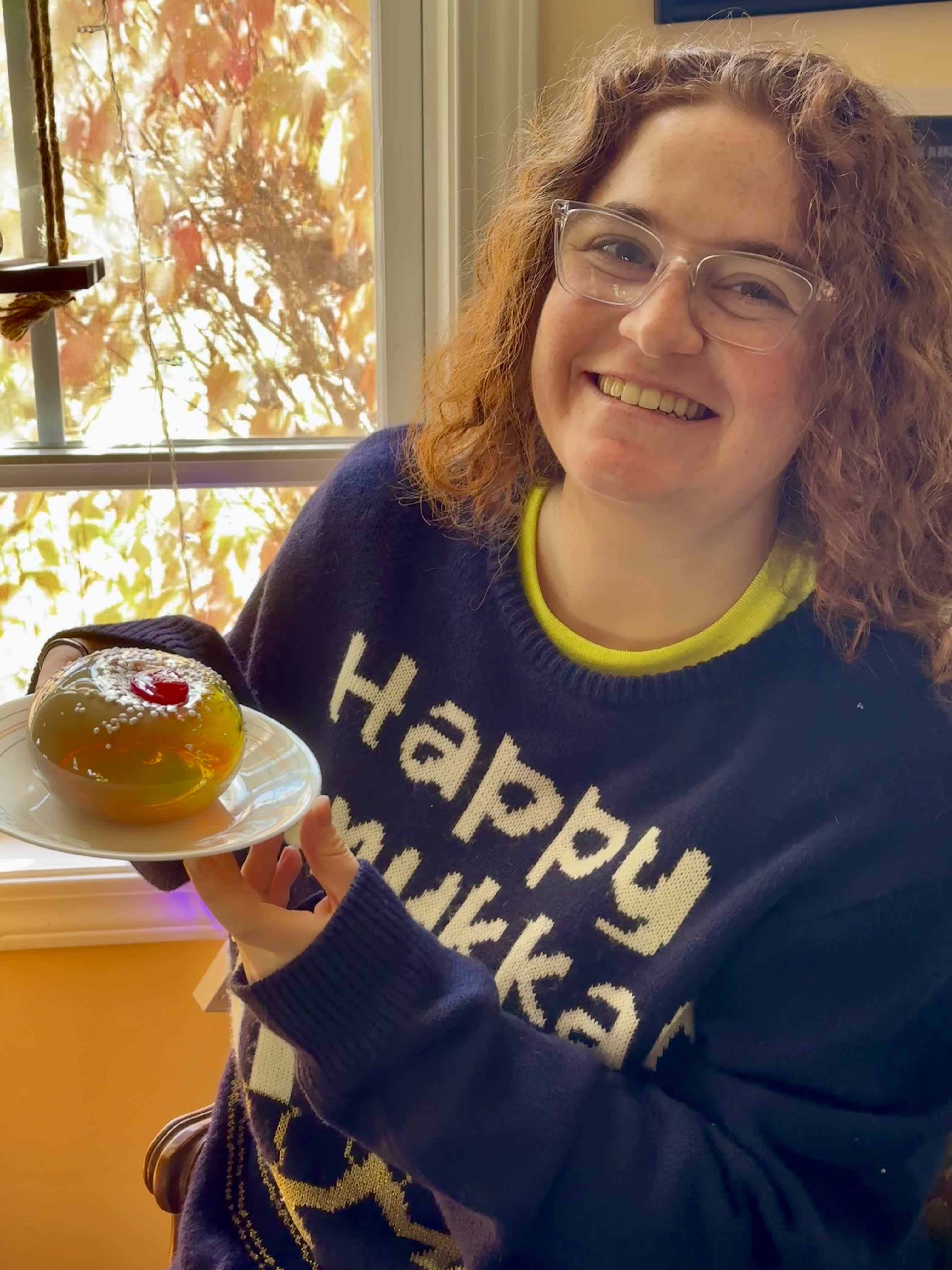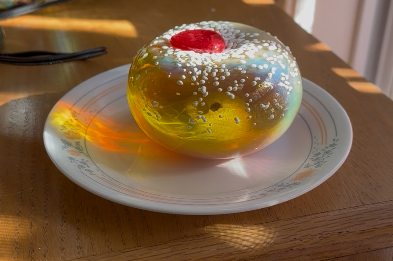 This holiday season I’m selling hand blown glass sufganiot, or jelly donuts, a traditional food served with plenty of love during Hannukah, the Jewish festival of lights. Made with iridescent glass, the donut radiates rainbows when light passes through it.