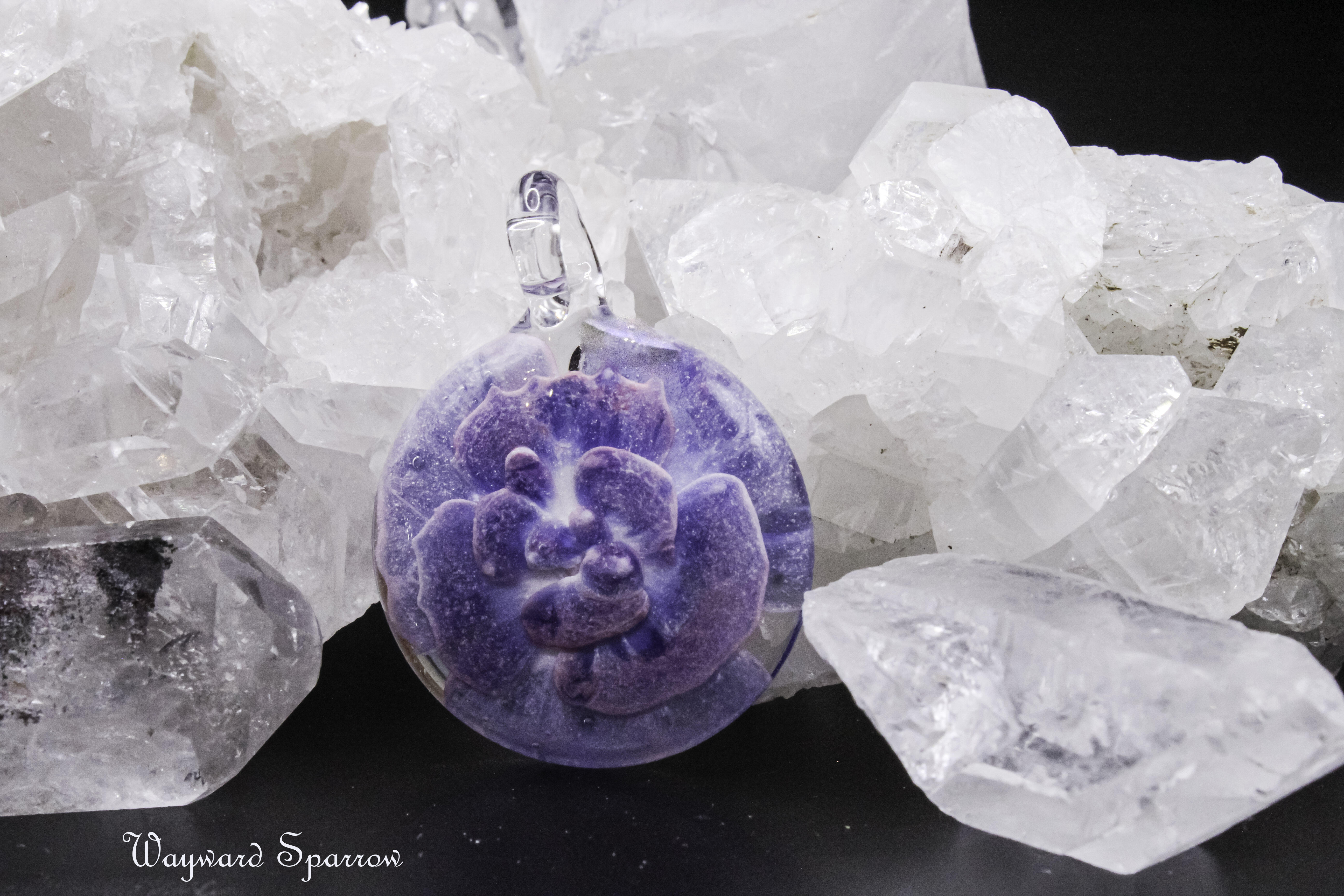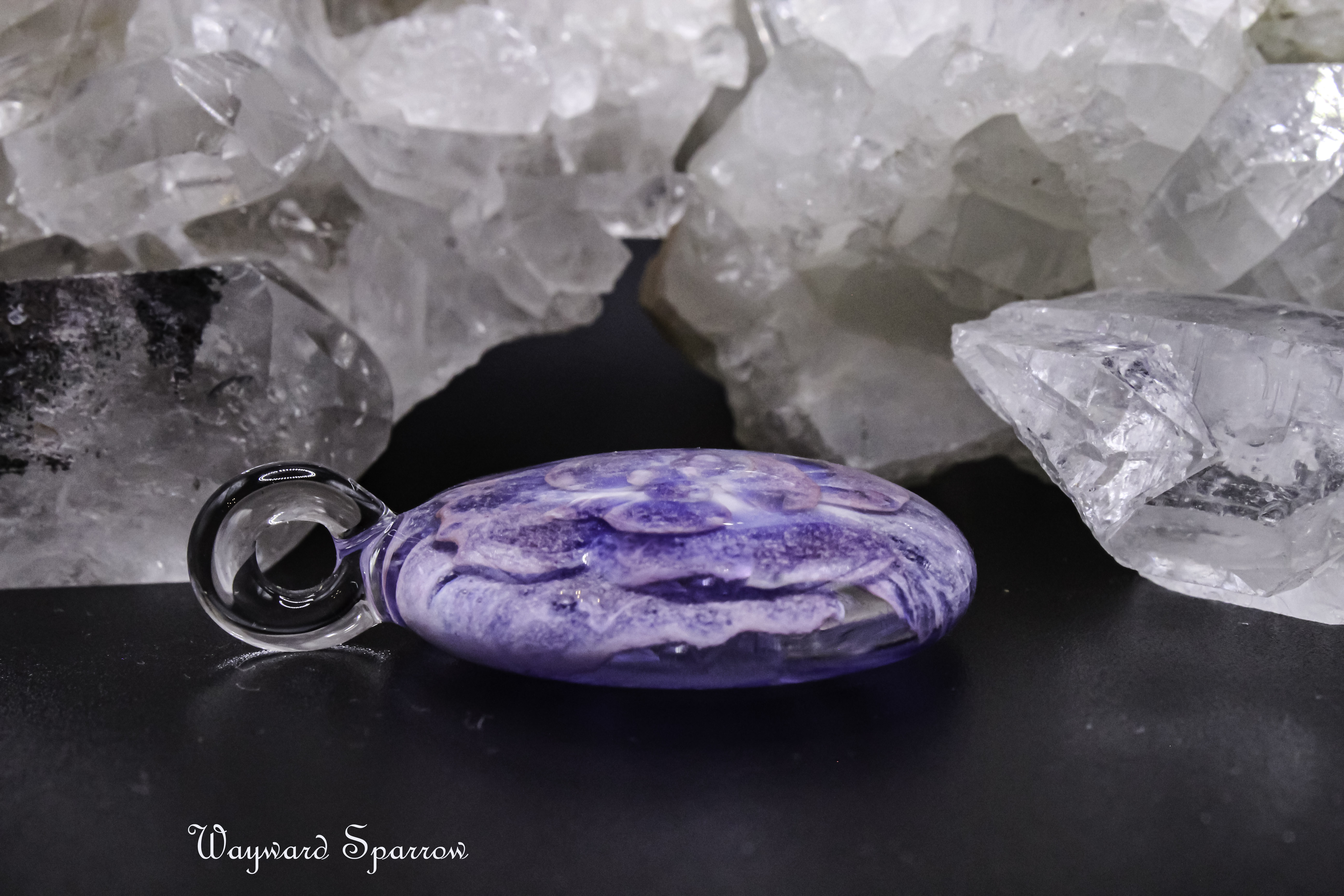 Handblown glass pendant created by Master Glassblower Phillip LeJeune. Pendant measures 1.75 inches in length and 1.5 inches wide.
