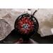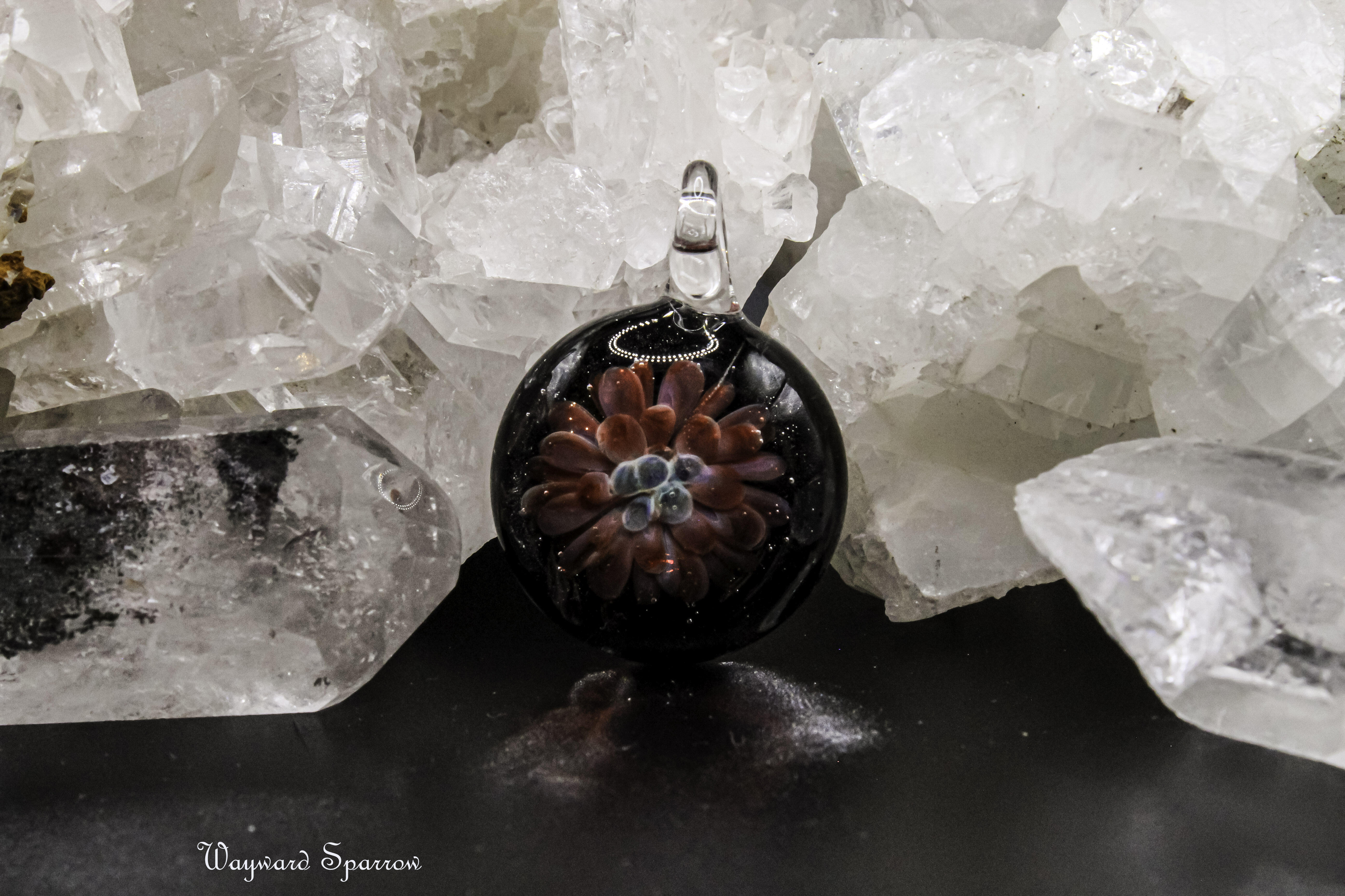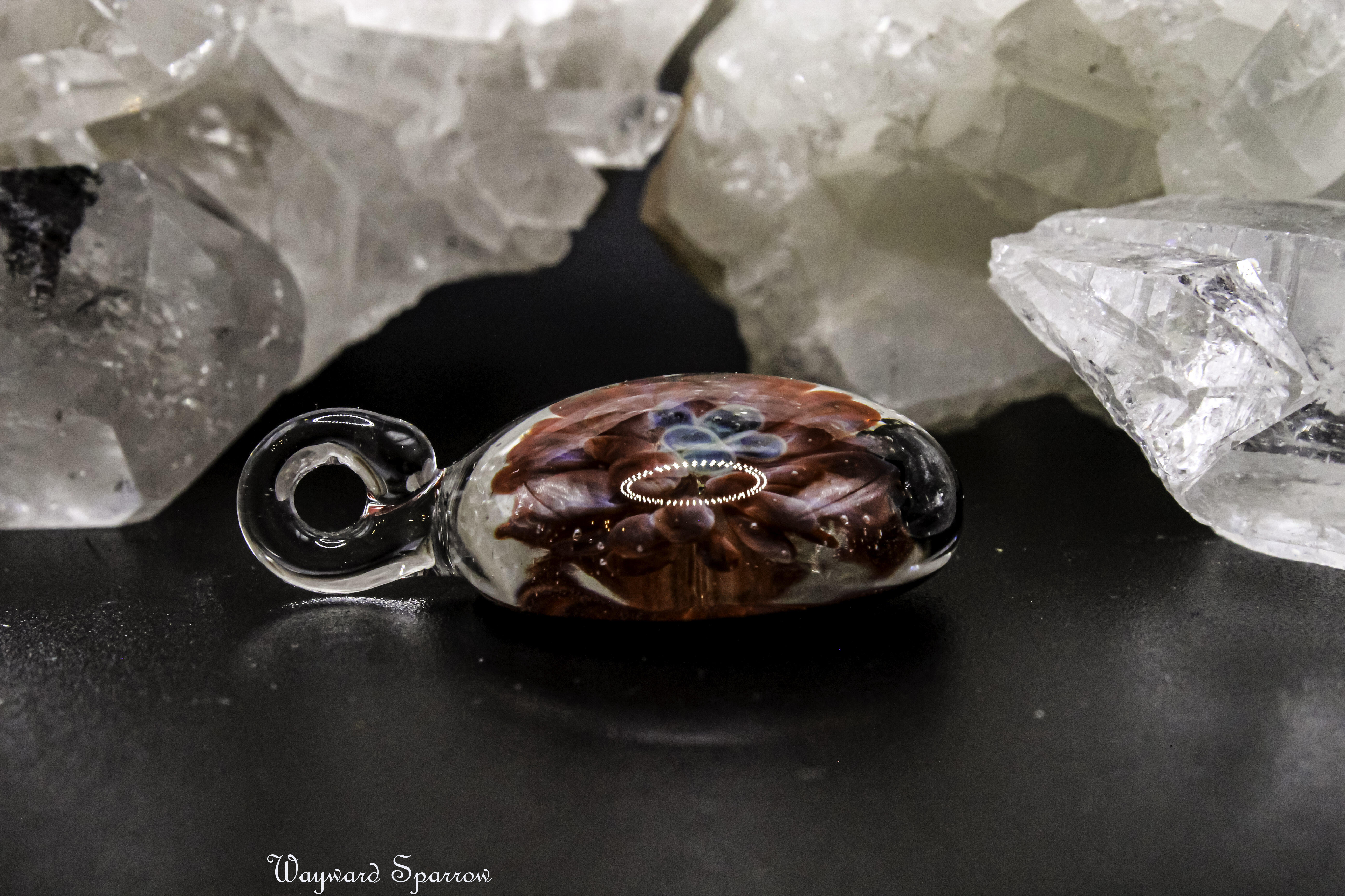 Handblown glass red mum pendant created by Master Glassblower Phillip LeJeune. Pendant measures 1.25 inches in length and 1 inch wide.