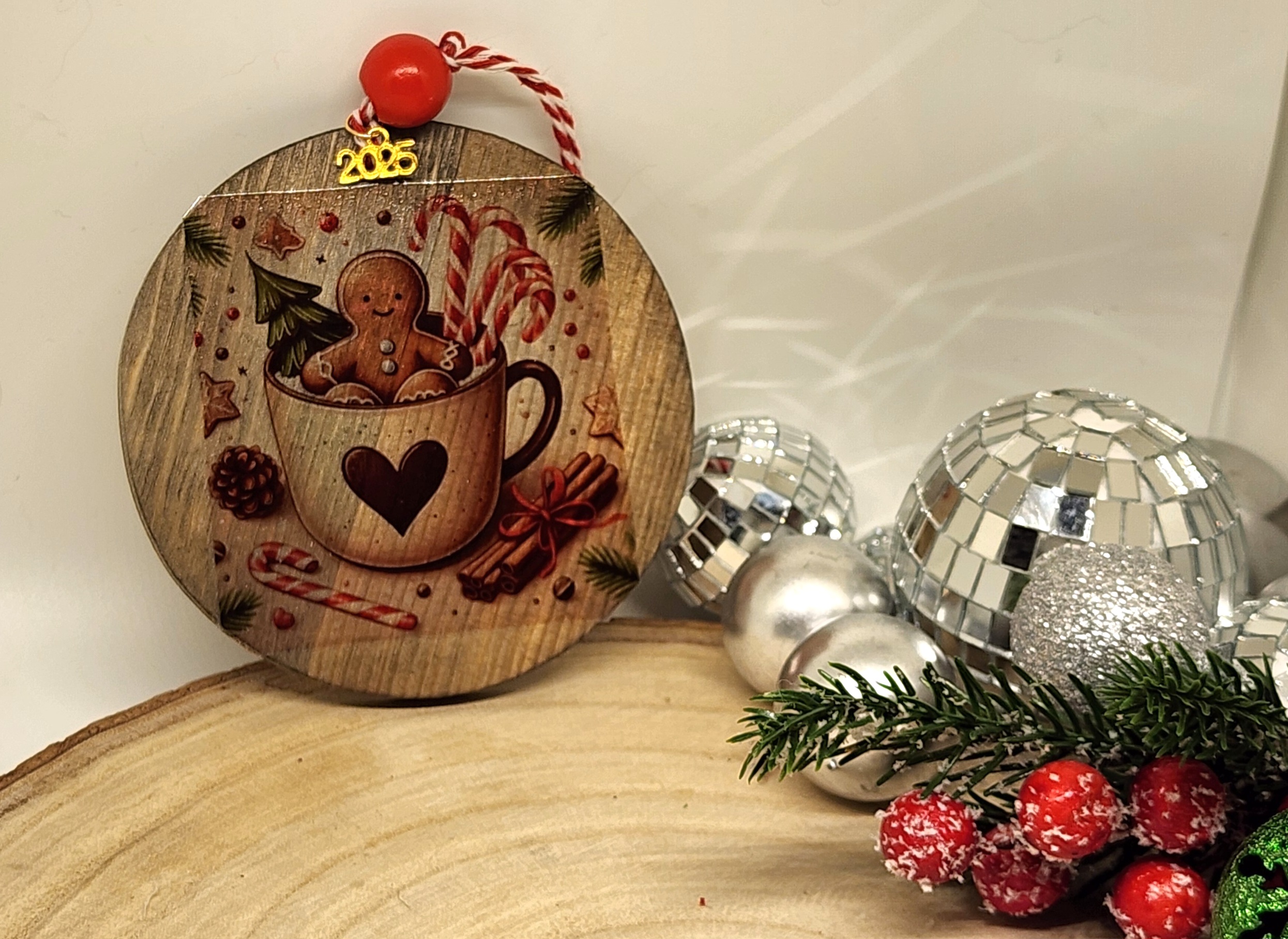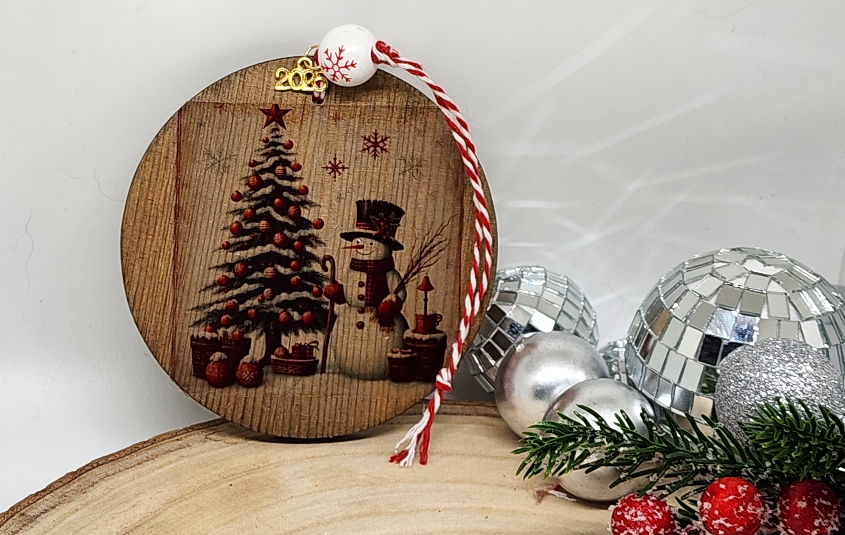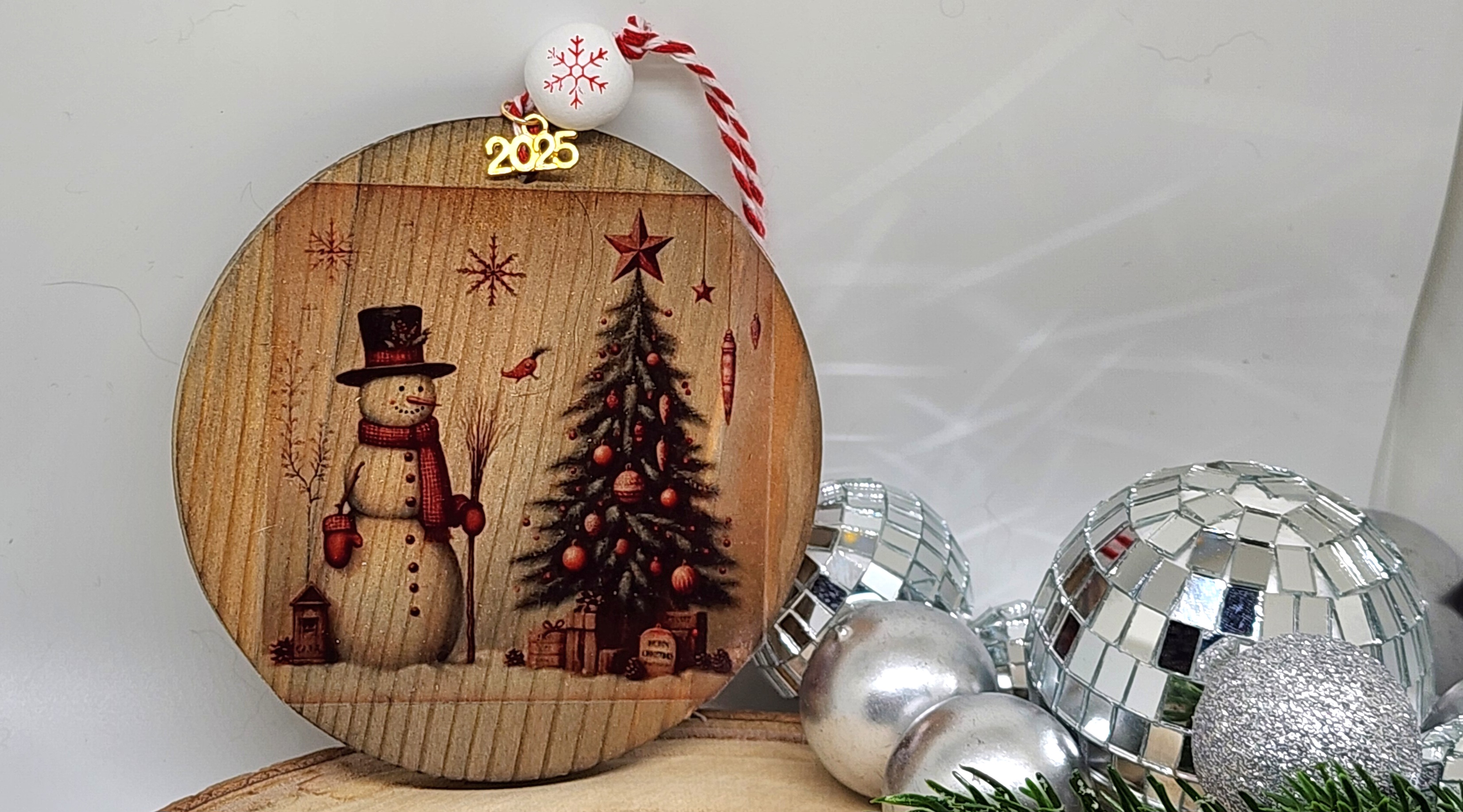 Celebrate the season with a handcrafted 4" round wooden Christmas ornament, designed to evoke warmth, nostalgia, and festive charm. Each ornament features a unique holiday scene—from cheerful snowmen and cozy gingerbread mugs to vintage trucks and classic Christmas trees—printed with care and topped with a gold "2025" charm.