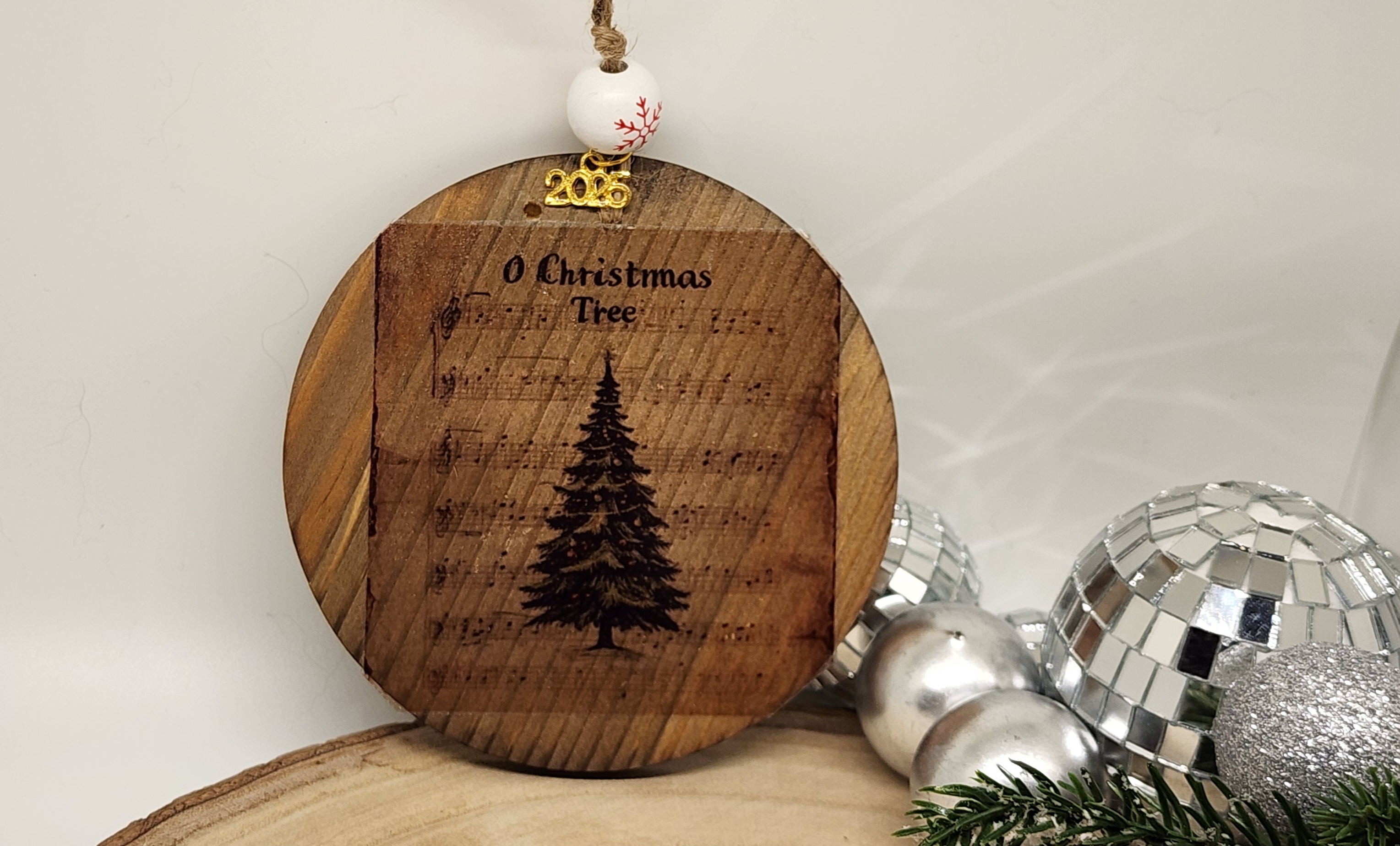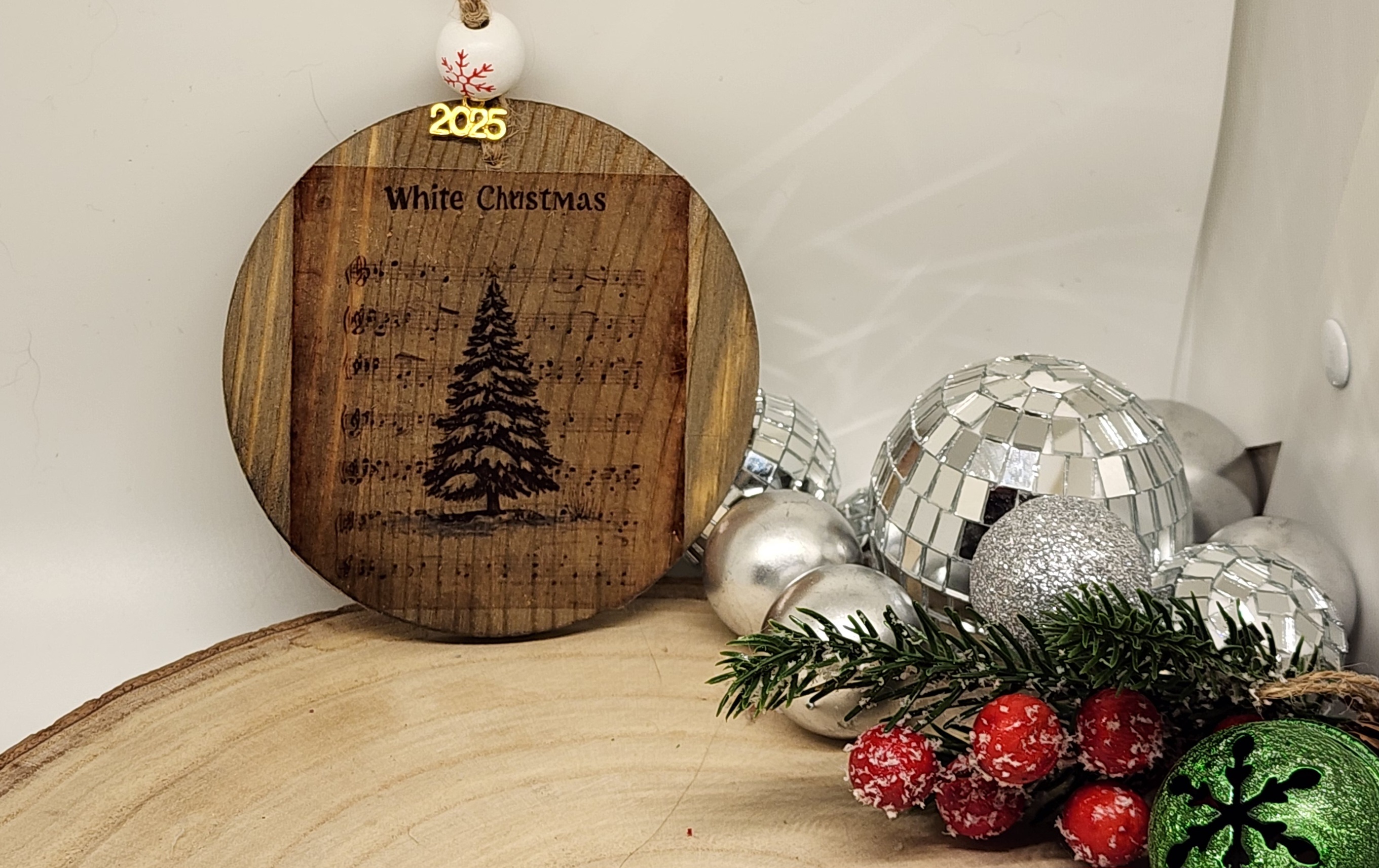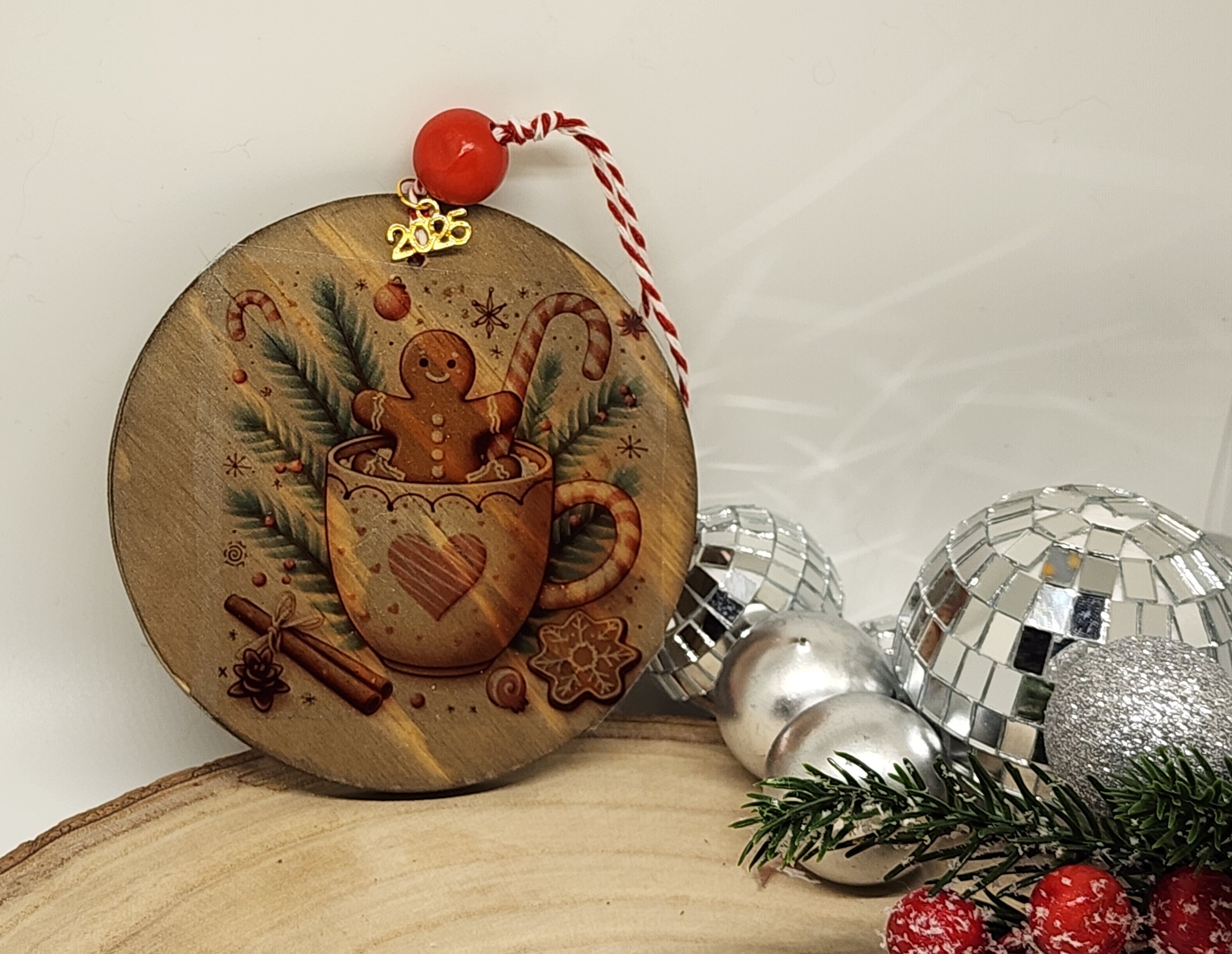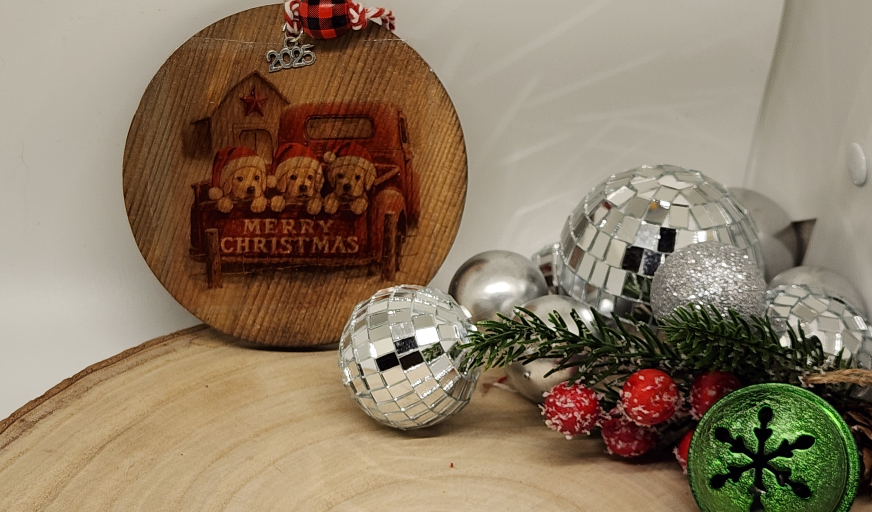 Celebrate the season with a handcrafted 4" round wooden Christmas ornament, designed to evoke warmth, nostalgia, and festive charm. Each ornament features a unique holiday scene—from cheerful snowmen and cozy gingerbread mugs to vintage trucks and classic Christmas trees—printed with care and topped with a gold "2025" charm.