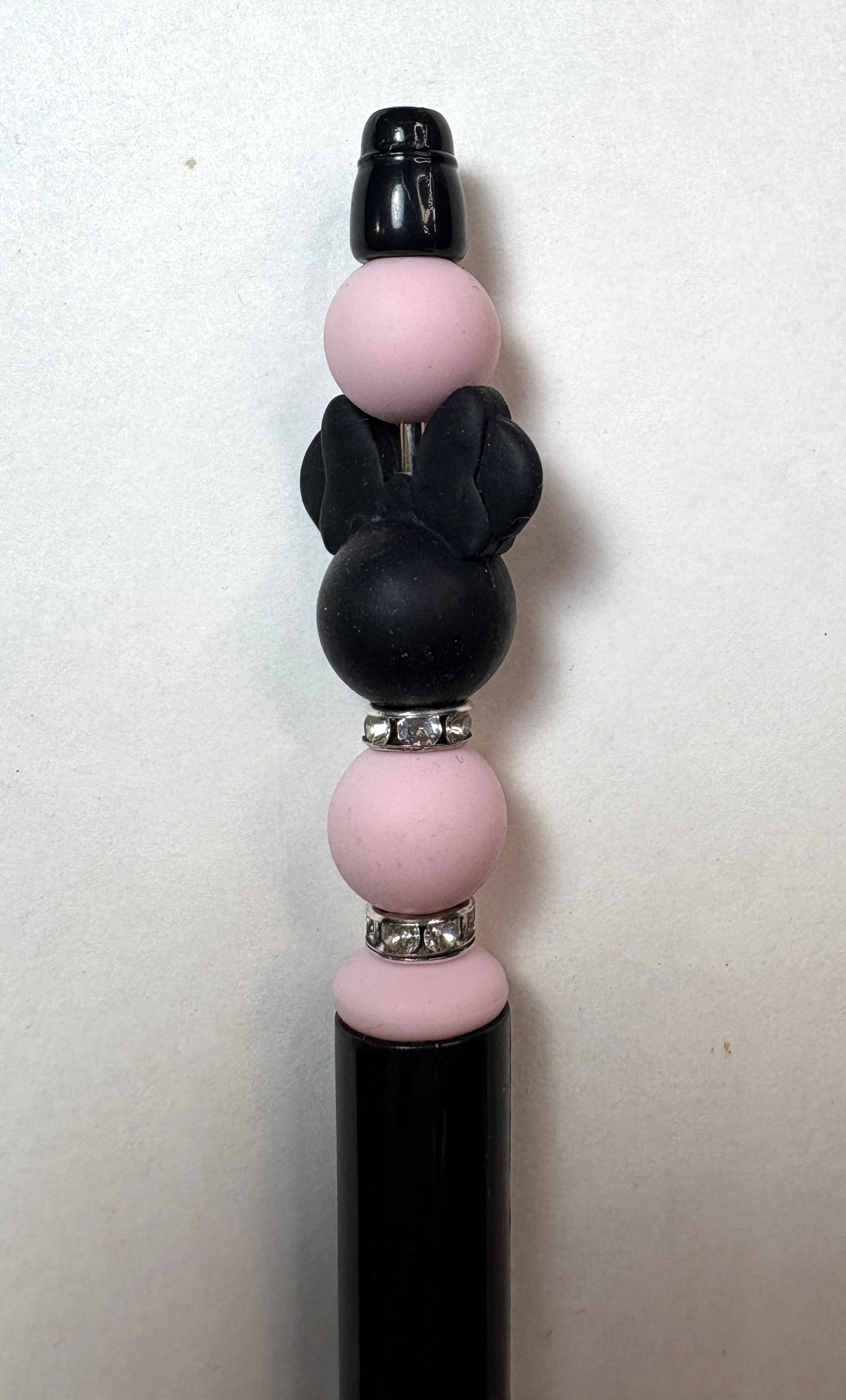 The Focal Bead is a Black Silicone Mickey Head with accent beads in Pink and a Black Pen Base.