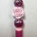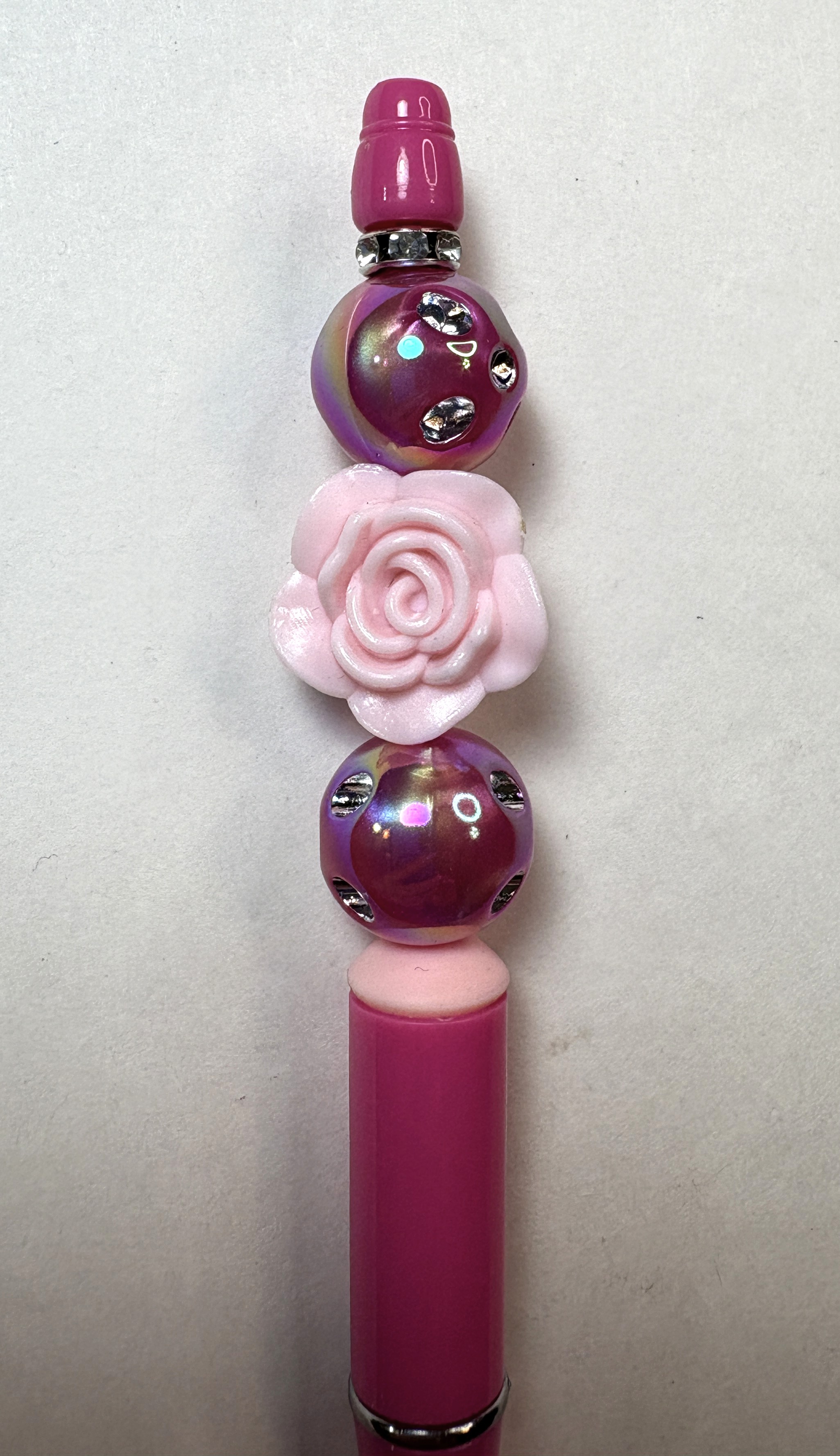 The Focal Bead is an acrylic rose bead, with accent beads of pink rhinestone acrylic beads and an accent pink pen. all pens have black ink