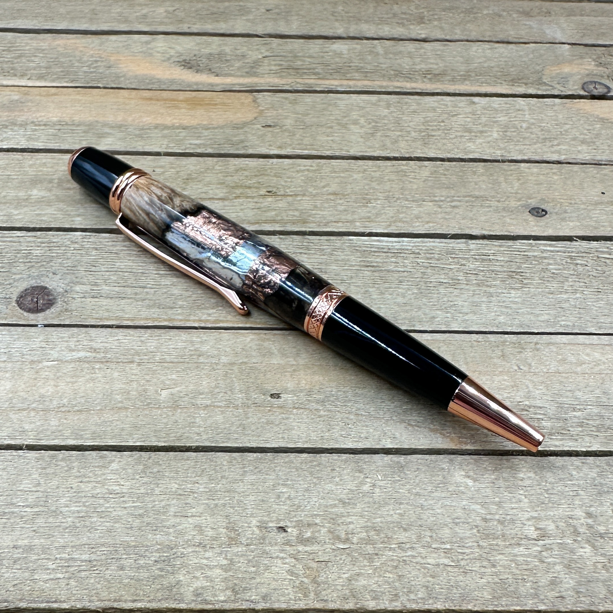 Key Features: Intricate Steampunk Design: Each pen is one of a kind and adorned with aluminum and copper Steampunk elements with burl wood on the ends, creating a stunning visual appeal. The pen itself is plated in copper and black chrome.